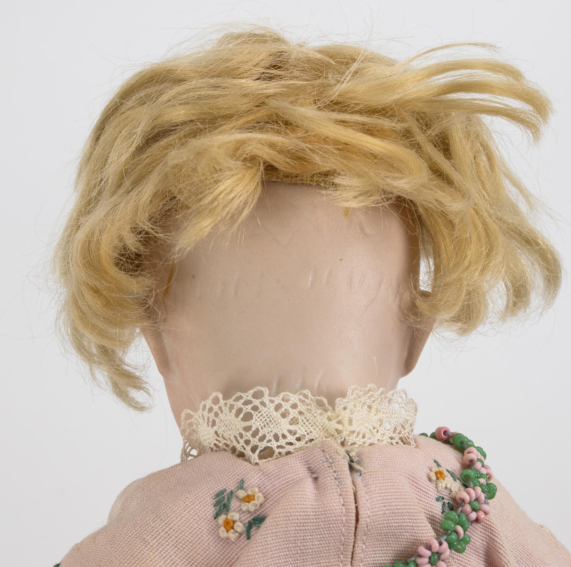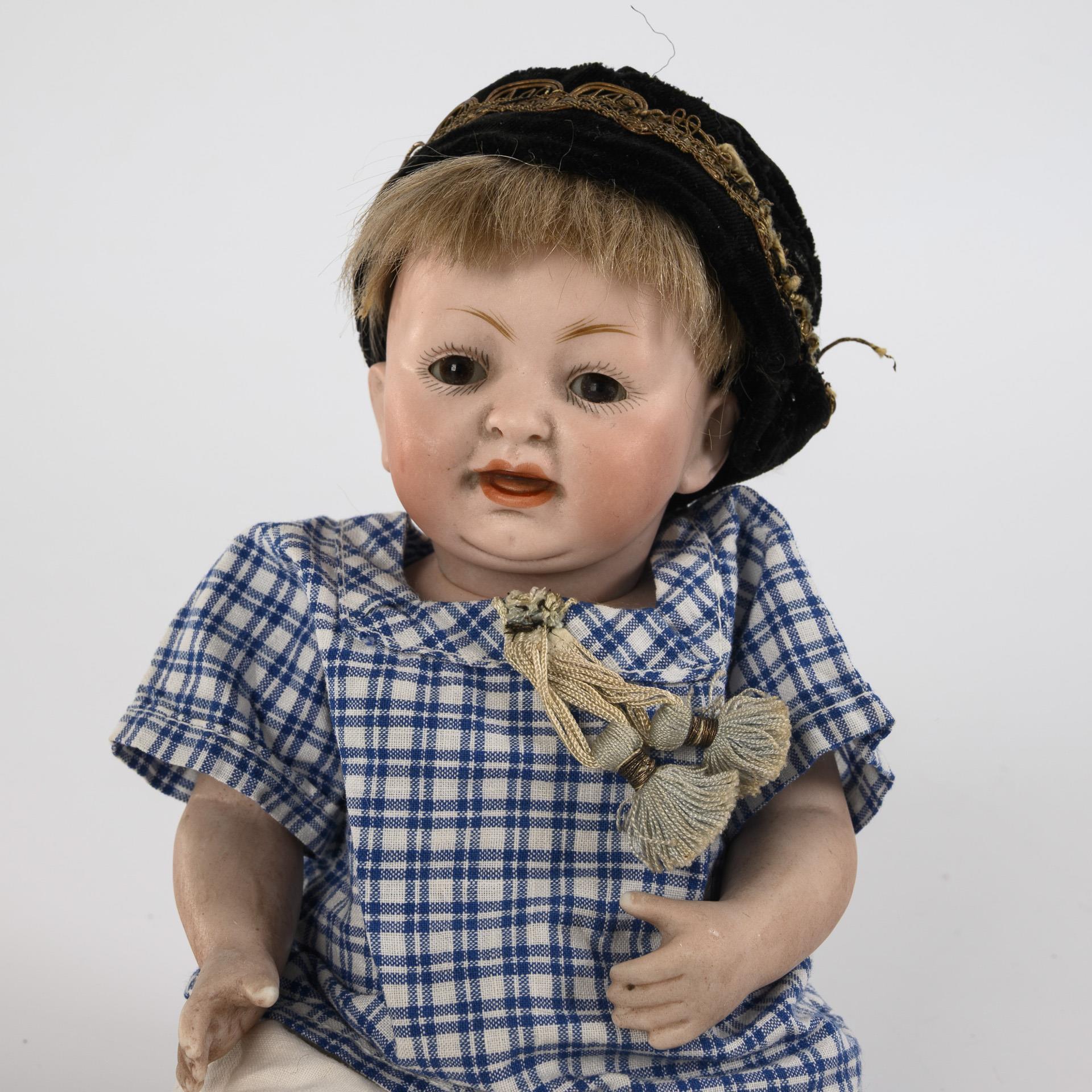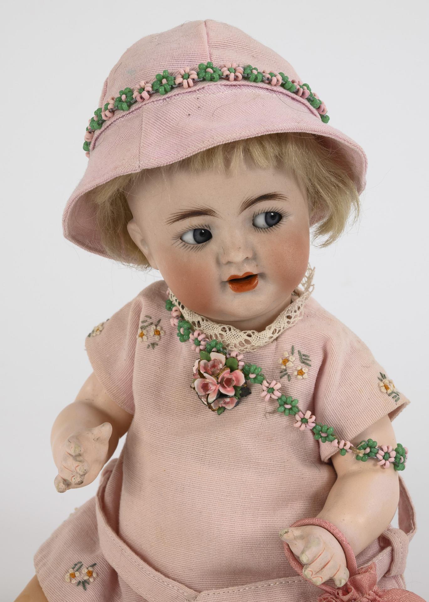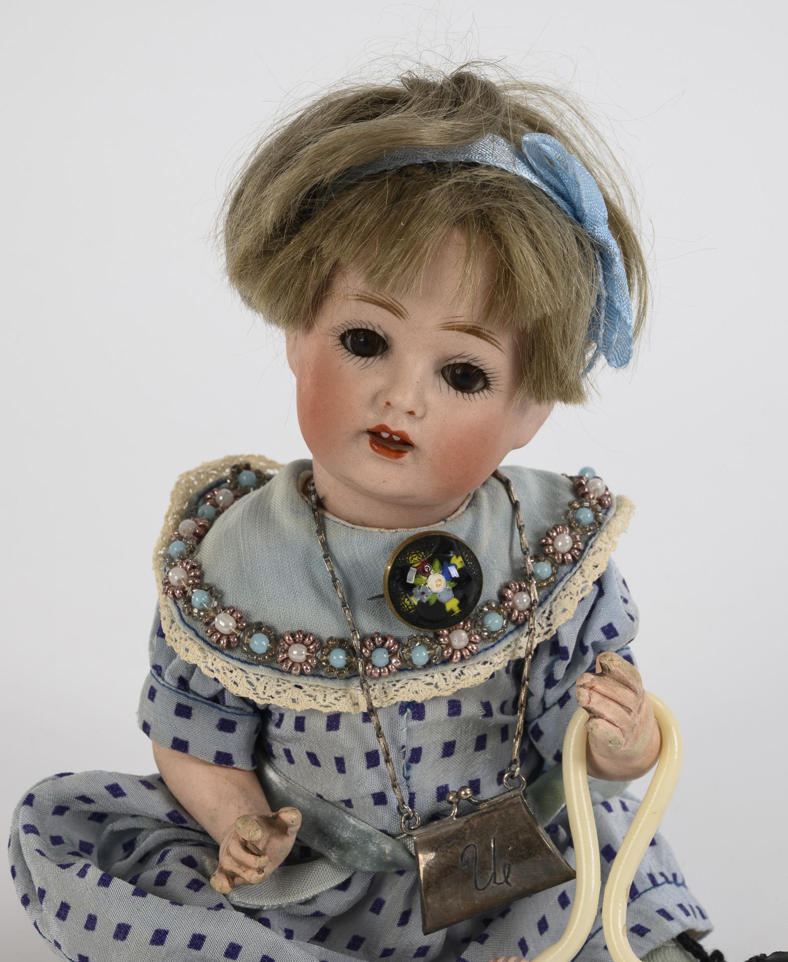 Alle mit Kurbelkopf, Schlafaugen, blonder Mohairperücke und 5-teiligem Sitzbabykörper. "Mein Lieblingsbaby" mit Schlaf-/Schelmenaugen und rosa Kleidung, L 30 cm. / Mädchen mit hellblauem Kleid, Brosche und Handtäschchen, L 23 cm. / Defektes Ganzbiskuit-Baby mit kariertem Hemd und schwarzer Samtkappe. Linkes Bein geklebt, Beinansatz und rechter Fuß restauriert, L 22 cm. Teils kleine Defekte.
