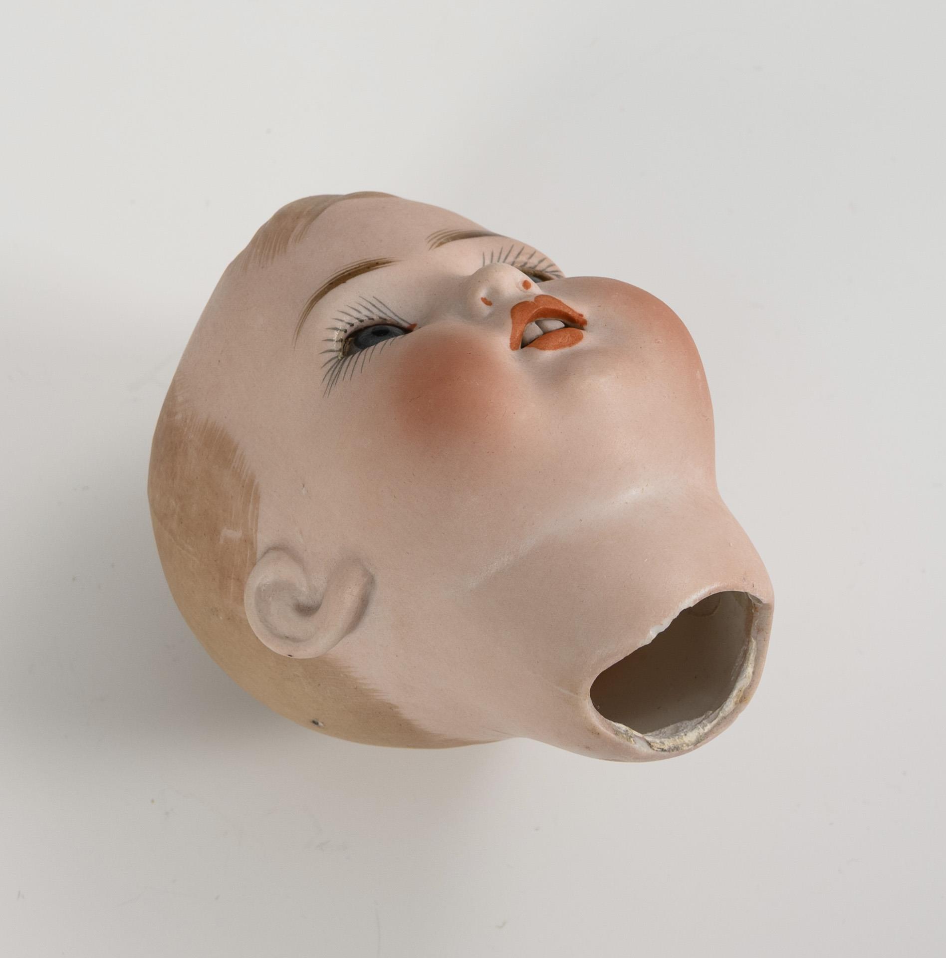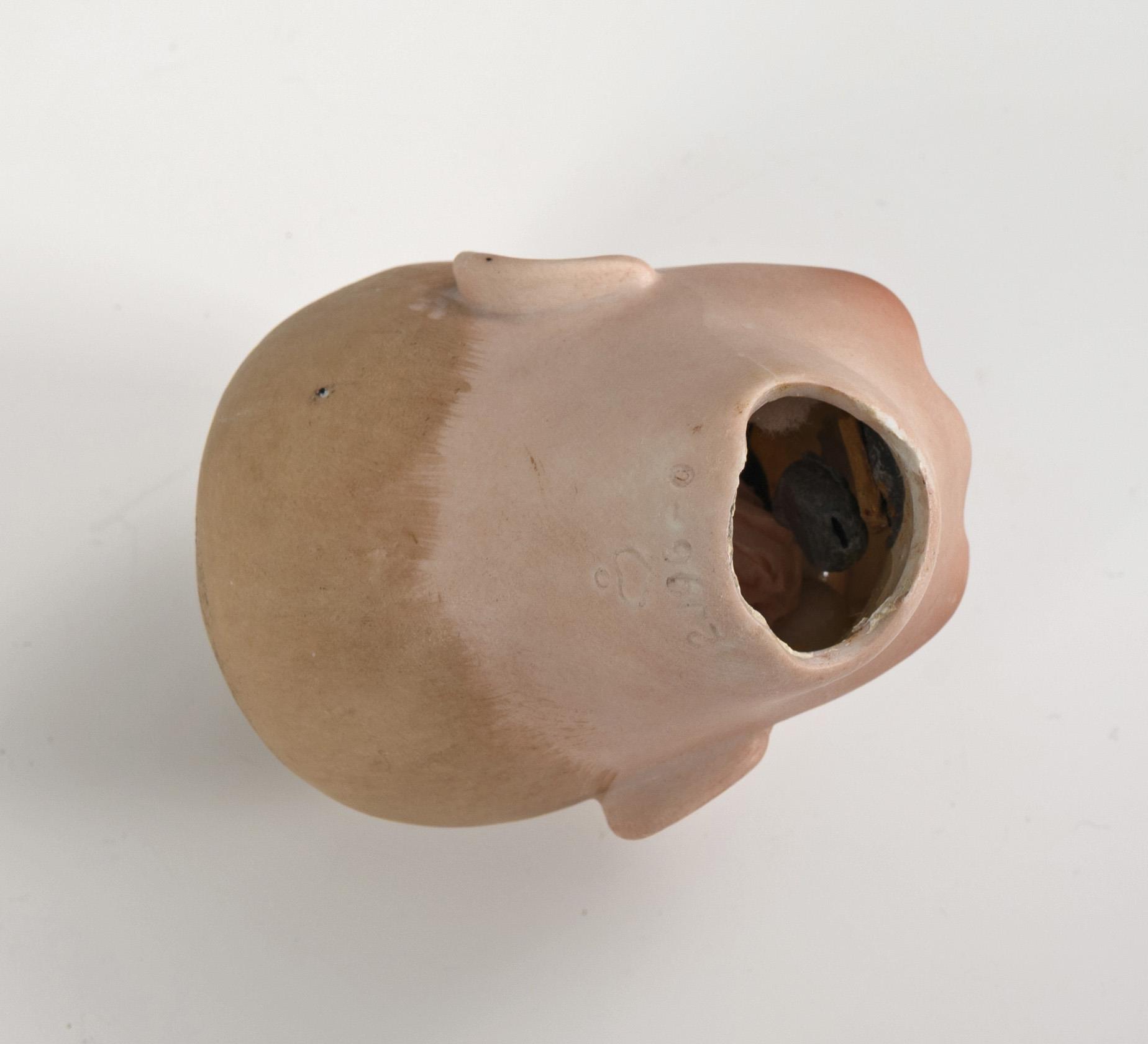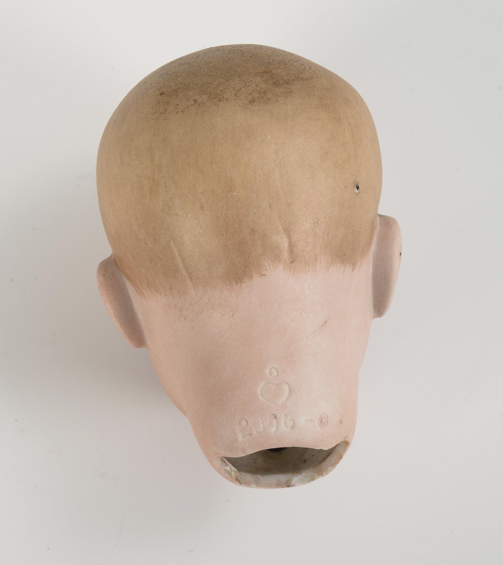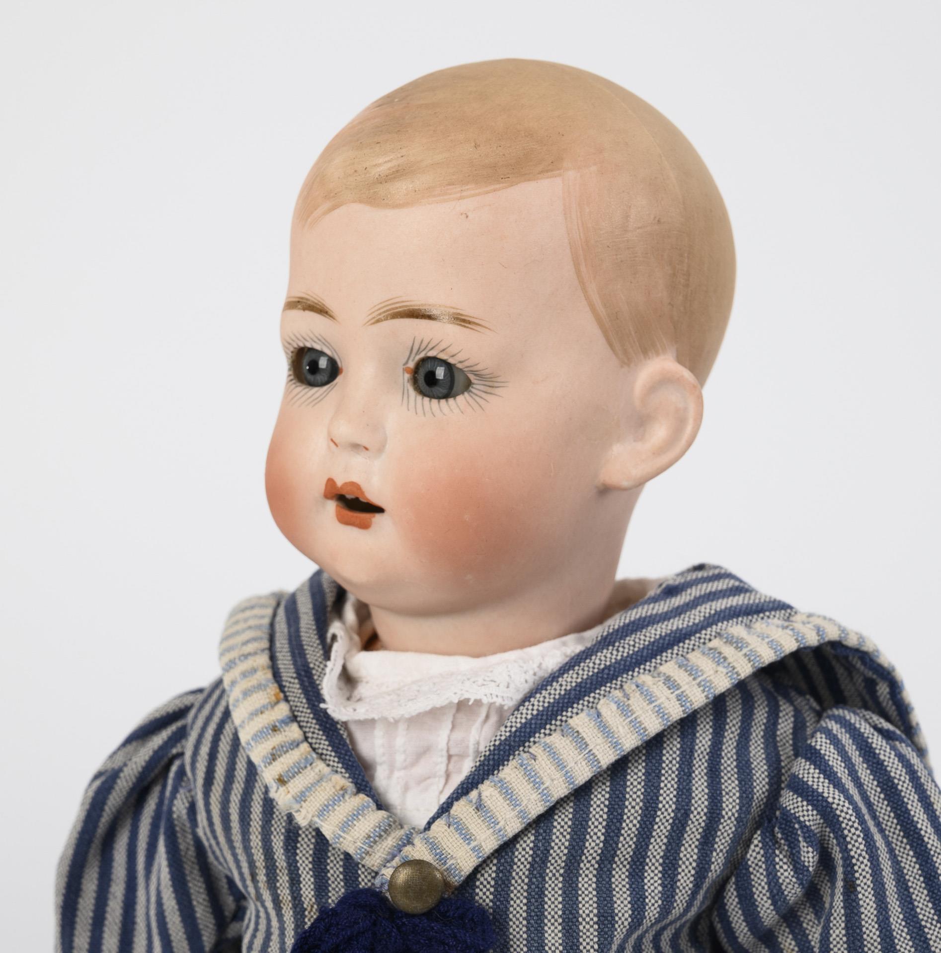 Kurbelkopf, blaue Glasaugen, modellierte Frisur. 9-teiliger Gliederkörper. 2-teiliger Anzug mit gestreiftem Hemd, Strohhut, schwarze Wachstuchschuhe. Schlafaugen wohl fixiert, winzige Chips an der Halskurbel.
