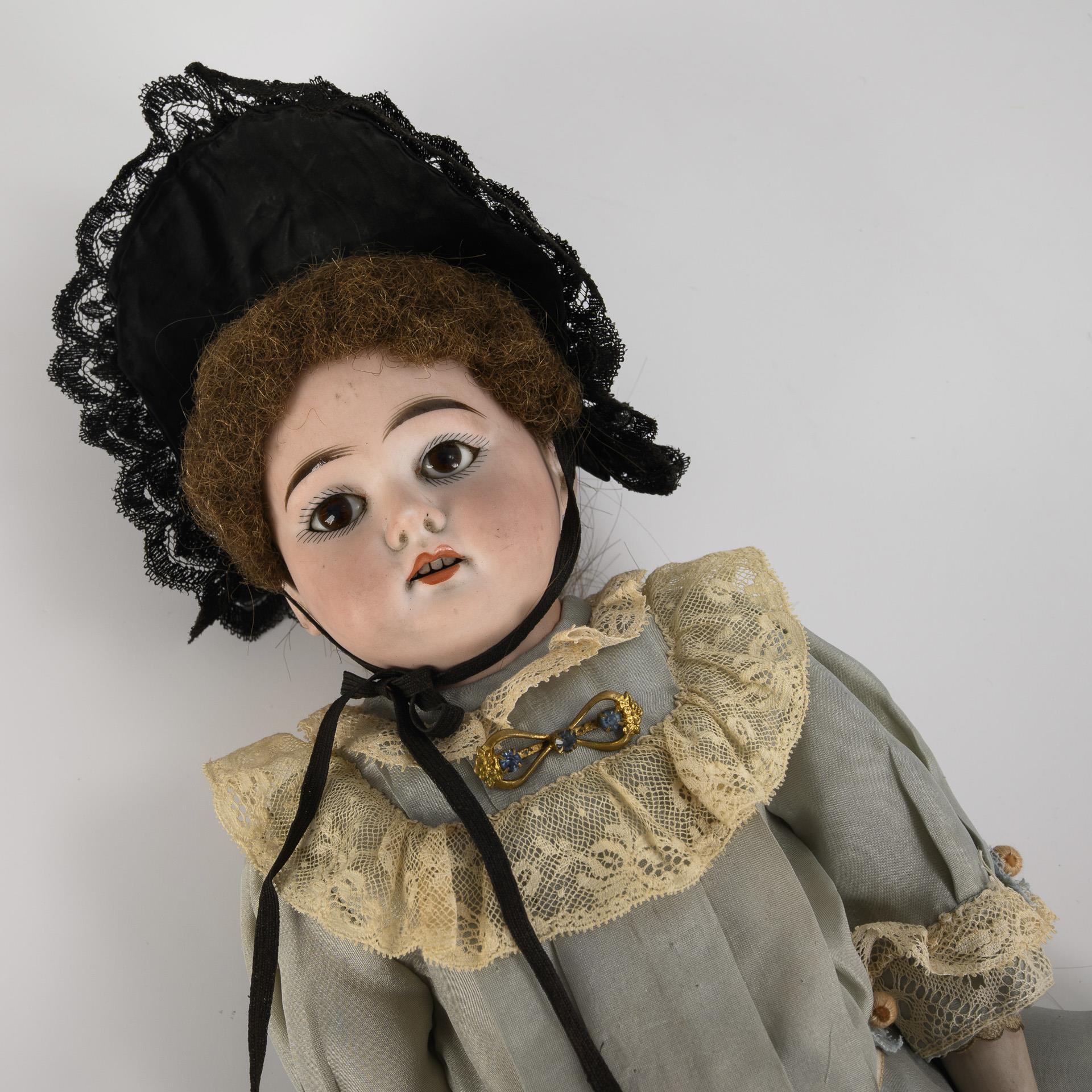 Feste braune Glasaugen, braune Echthaarperücke mit ergänztem Kunsthaarpony. Lederkörper mit Biskuitarmen. Seidenkleid, schwarzer Hut, schwarze Wachstuchschuhe. Perücke fest: Kopf nicht durchleuchtet. Schultern minimal verfärbt.