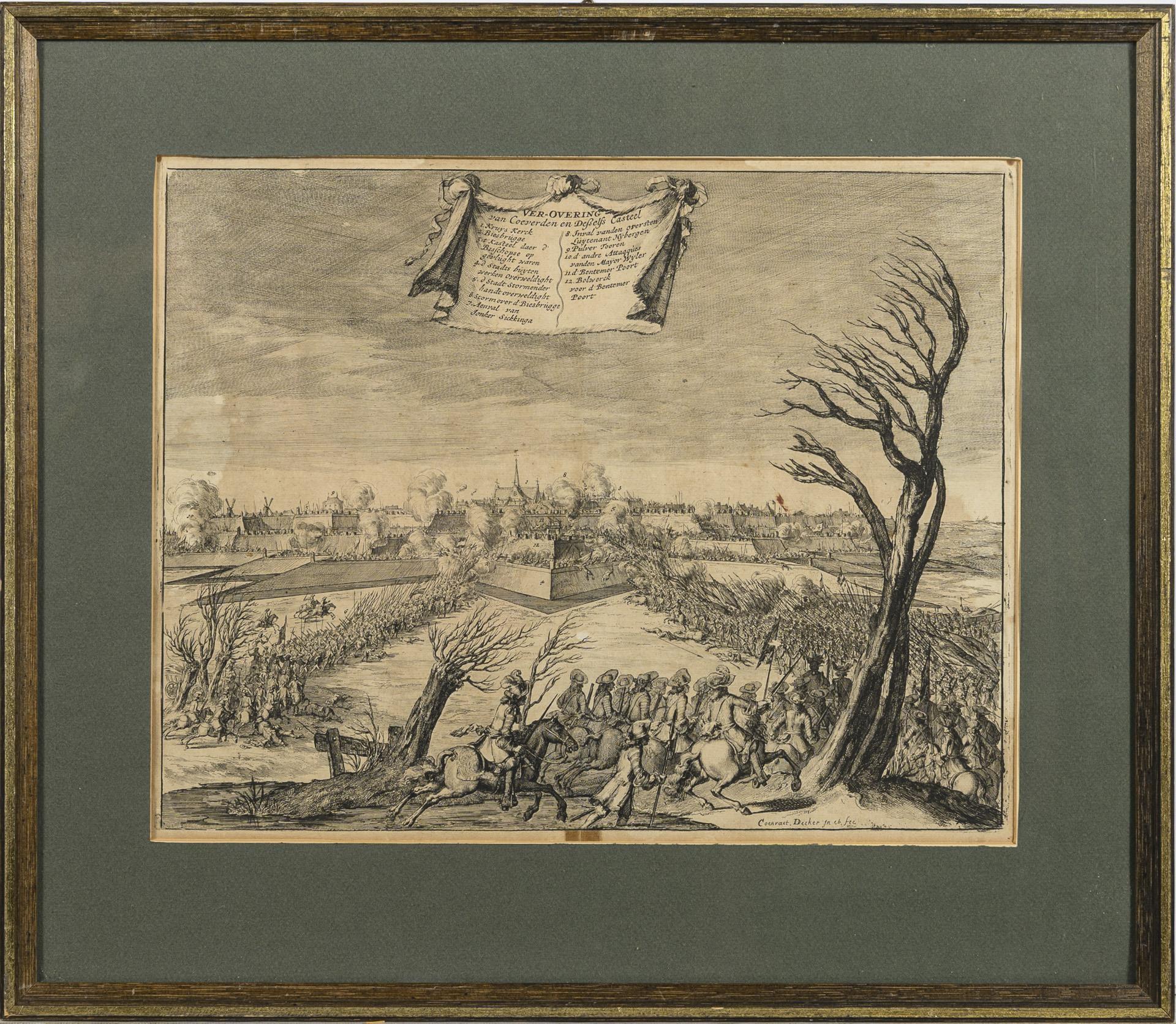 "Ver Overing van Coeverden en Deßelfs Casteel", von Coenraet Decker (1651 - 1709). Eroberung der niederländischen Festung durch Münsteraner Truppen. Leichte Bugfalte, altersgemäß fleckig mit kleinem Farbfleck und unauffälliger, kleiner Fehlstelle.