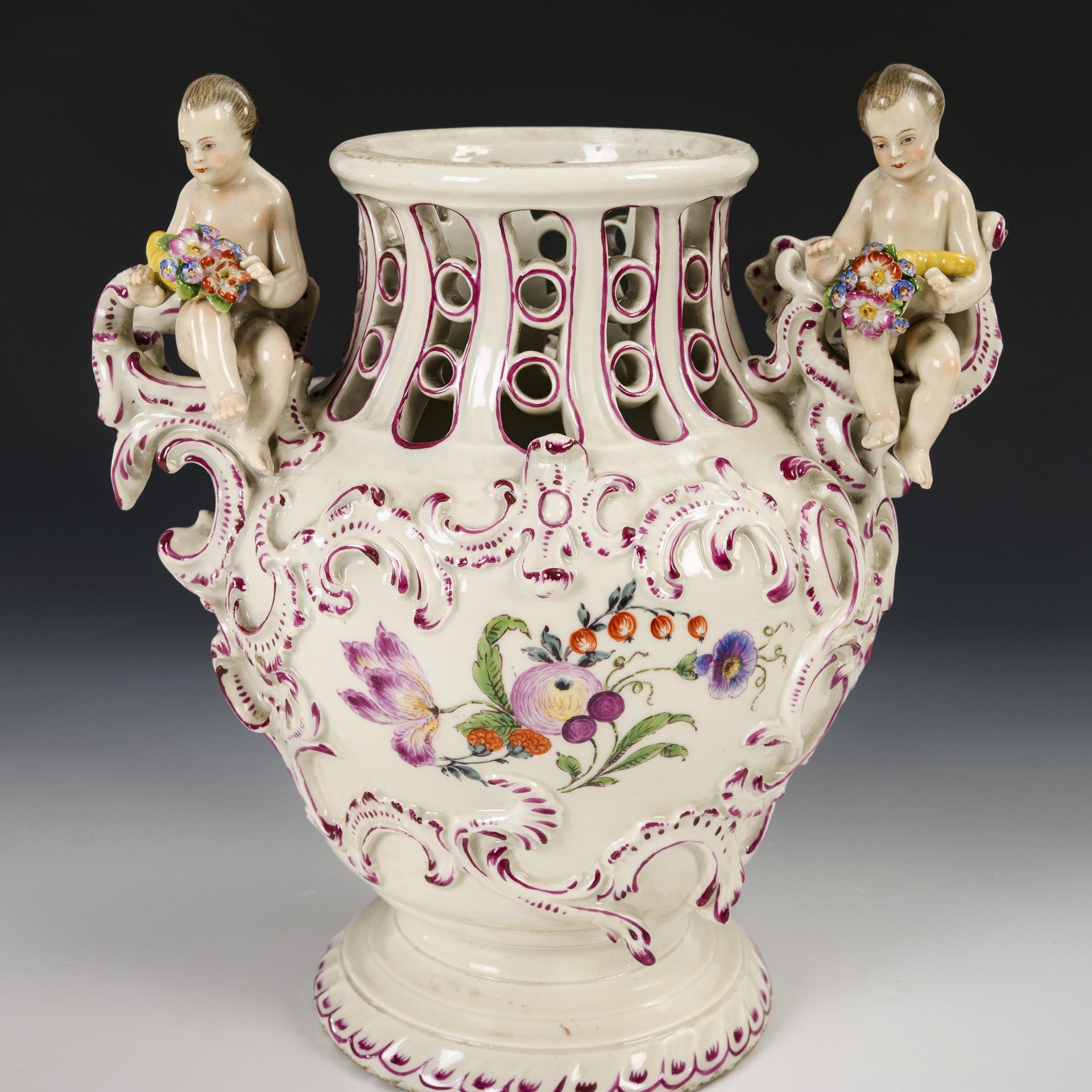 Balustervase mit durchbrochenem Hals, durchbrochenem Deckel, zwei auf den Handhaben sitzenden Putten mit Füllhorn, Rundfuß. Auf der Wandung Blumen- und Insektenmalerei in Rocaillereliefkartuschen.. 1 Blatt bestoßen.