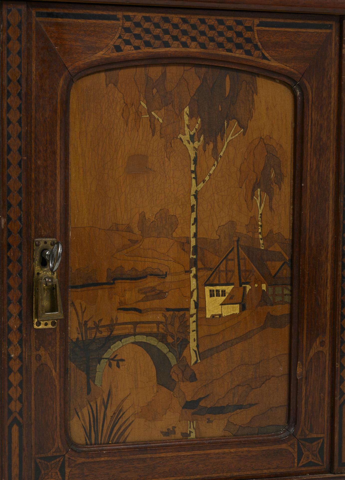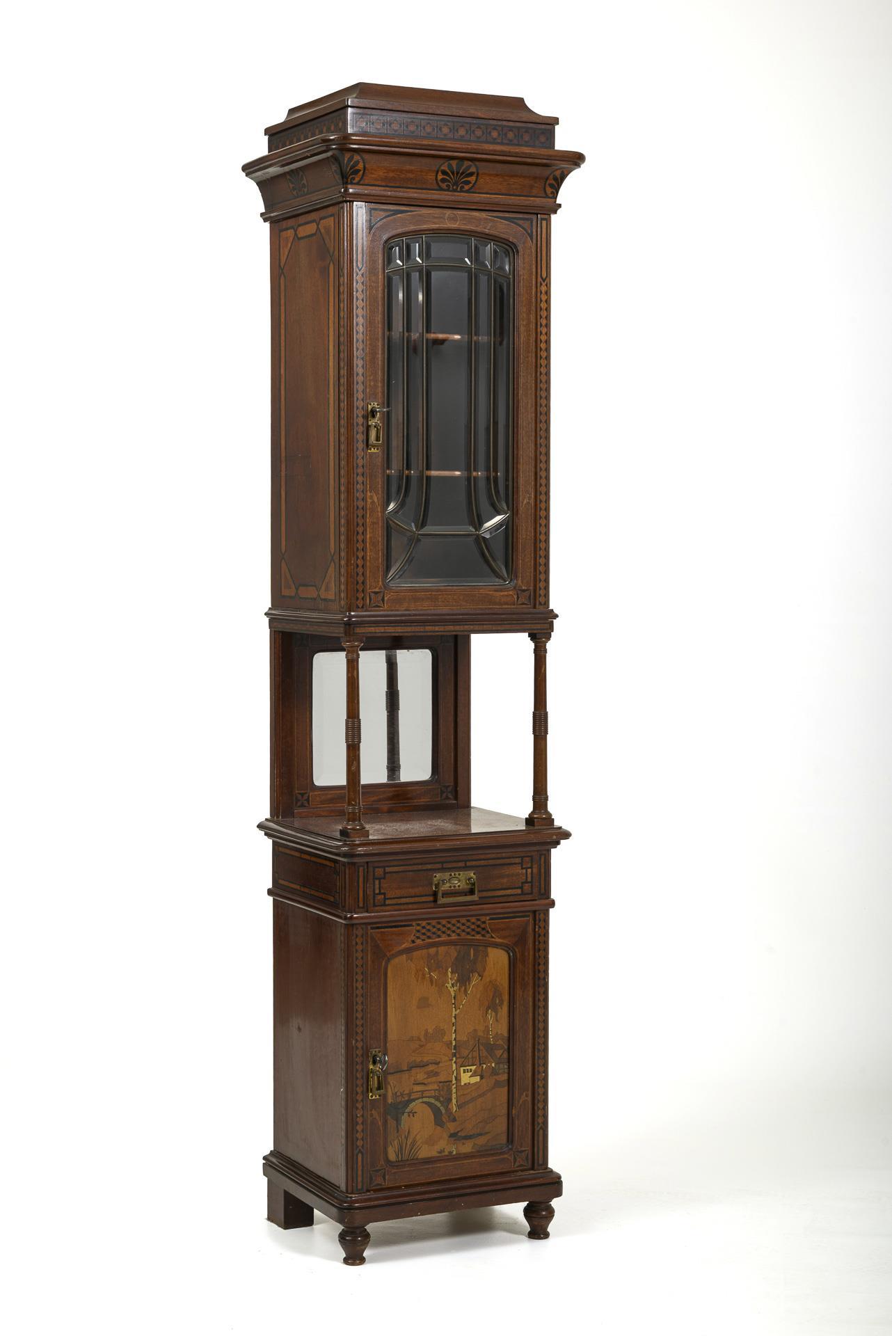Schlankes Möbel mit 1 verstrebt verglasten Vitrinenoberfach, einem offenen Mittelfach mit verspiegelter Rückwand, 1 kleinen Schub und 1 Sockelfach mit einer bildlich intarsierten Tür mit einem Bauernhaus und einer kleinen Steinbrücke in Landschaft, auf 2 Drechsel- und 2 Klotzfüßen. Gerundete Ecken und Segmentierungen, reicher Intarsiendekor mit ebonisierten Palmetten und Dekorbändern, hellen Fadenkontureinlagen, Drechselrillen und Profilkanten. Stiltypische Messing-Schlüssellochbeschläge mit Bügelgriffen, insgesamt 3 Einlegeböden. Restauriert mit Ergänzungen, leichte Kanten- und Furnierdefekte, Sockelfach nicht schließend, Rückwand etwas rissig.