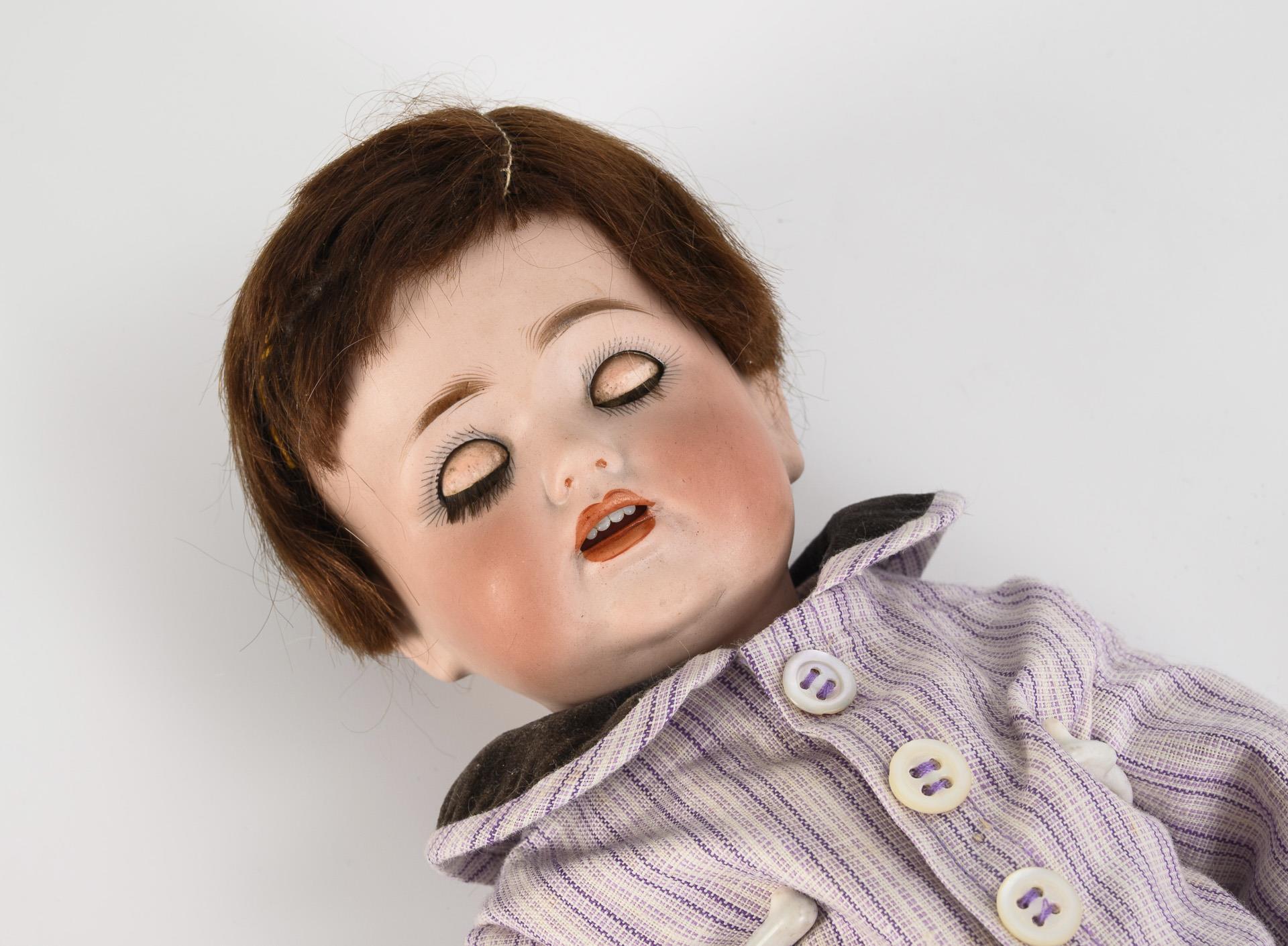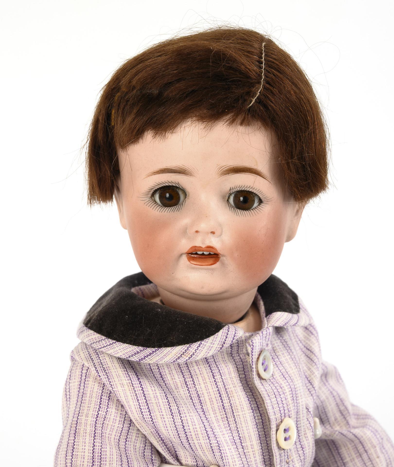 Kurbelkopf, braune Schlafaugen, braune Mohairperücke. 15-teiliger Gliederkörper. 2-teiliger Anzug mit violetten Nadelstreifen, schwarze Wachstuchschuhe. Perücke fest: Kopf nicht durchleuchtet. 1 Finger links geklebt.