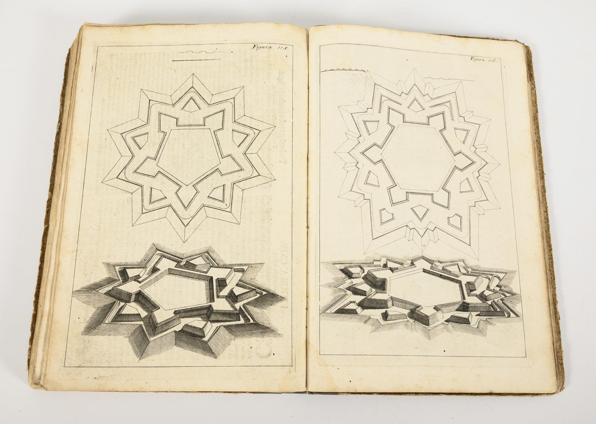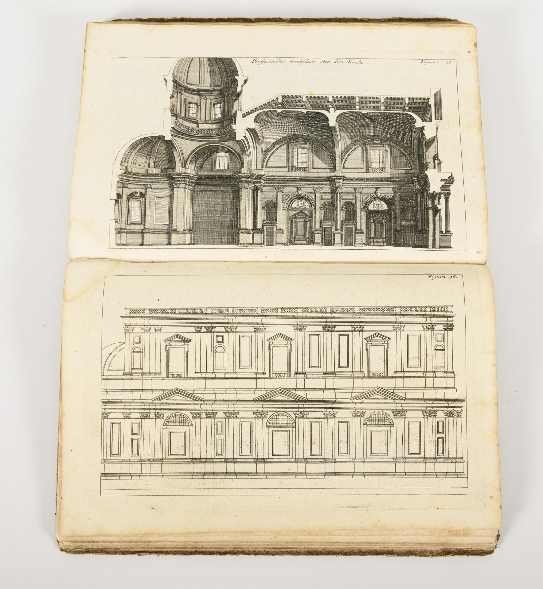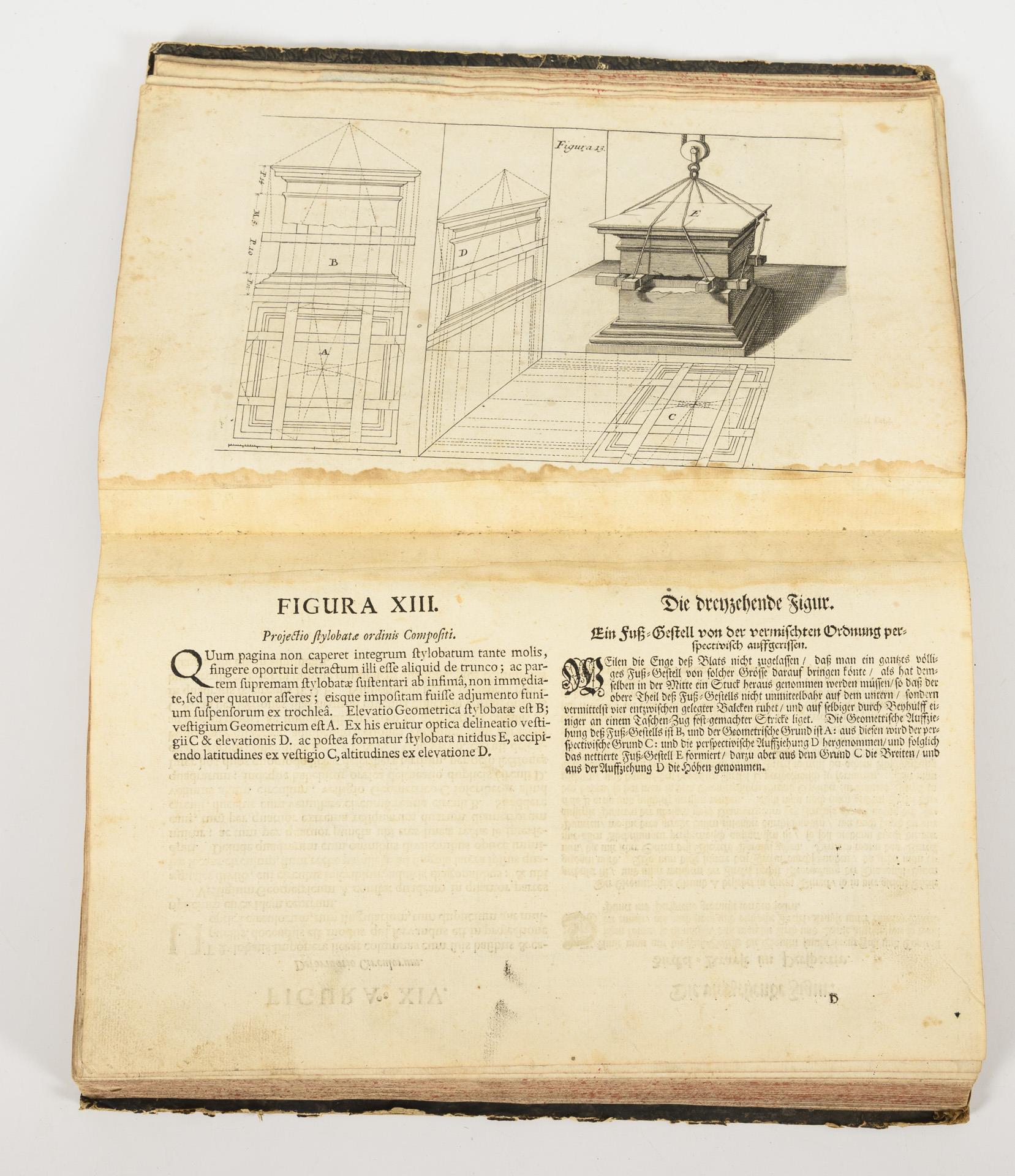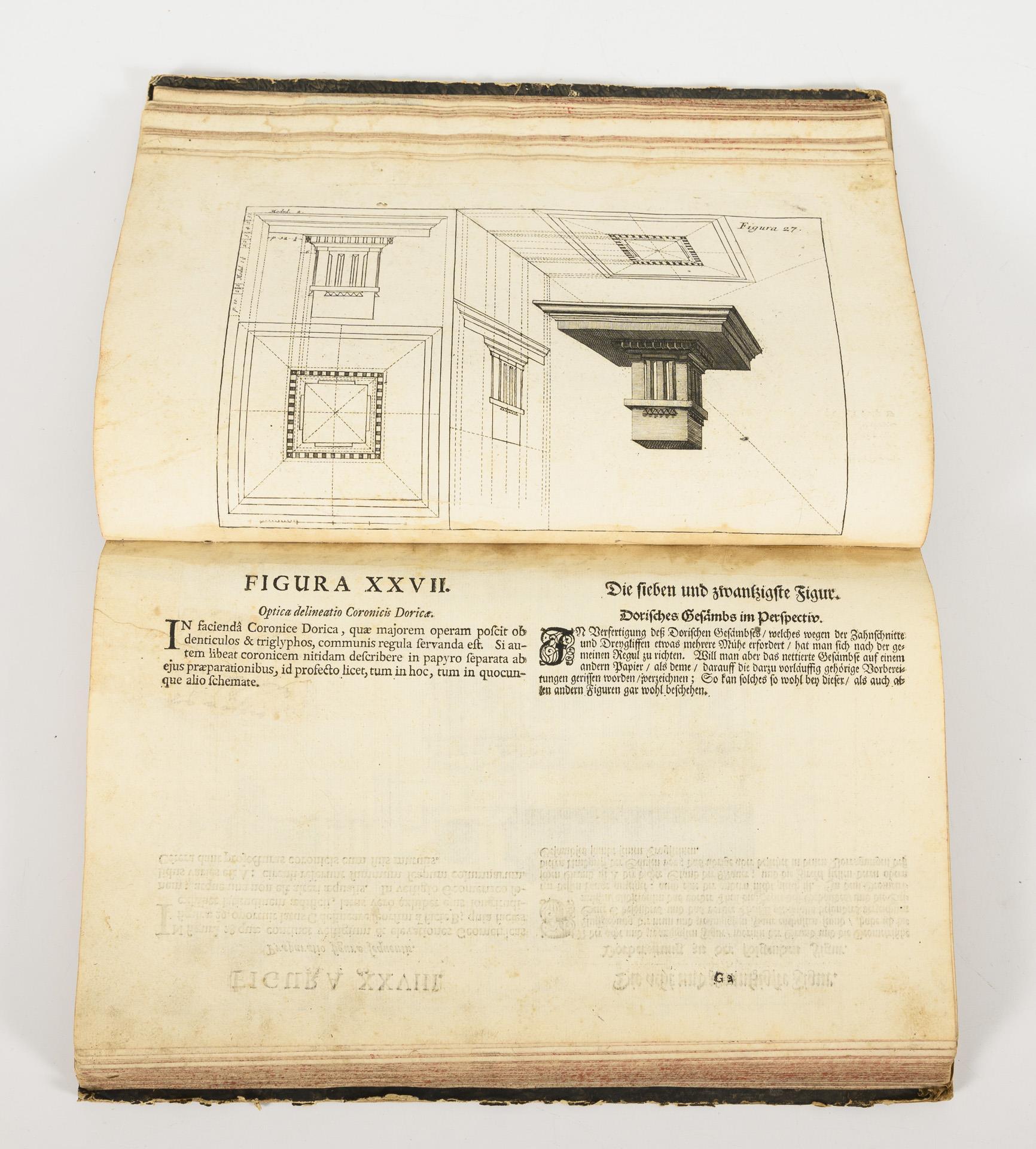 "Erster Theil, Worinnen gezeiget wird, wie man auf das allergeschwindest- und leichteste alles, was zur Architectur und Bau-Kunst gehöret, ins Perspectiv bringen solle". Augspurg 1706. (Pozzo-Bildnis fehlt, ein Blatt (Verputzer auf Gerüst) ist im Teil 2 eingebunden, 2 Seiten Vorwort fehlen.) 324 Seiten mit Abbildungen, Beschreibungen und druckbedingten Leerseiten. Vollständig. Als Belegexemplar wurde VD18 90864433 verwendet. / ("Zweyter Theil, Worinn die allerleichteste Manier, wie man, was zur Bau-Kunst gehörig, ins Perspectiv bringen solle, berichtet wird") (Titelblatt und 2 Seiten Vorwort fehlen), 337 Seiten mit Abbildungen und Beschreibungen sowie druckbedingten Leerseiten. Nicht identisch, aber im Inhalt übereinstimmend mit VD18 90864441, vollständig. In Deutsch und Latein, in zwei Interimseinbänden, mit altersgemäßen Nutzungsspuren. Kollationiert.
