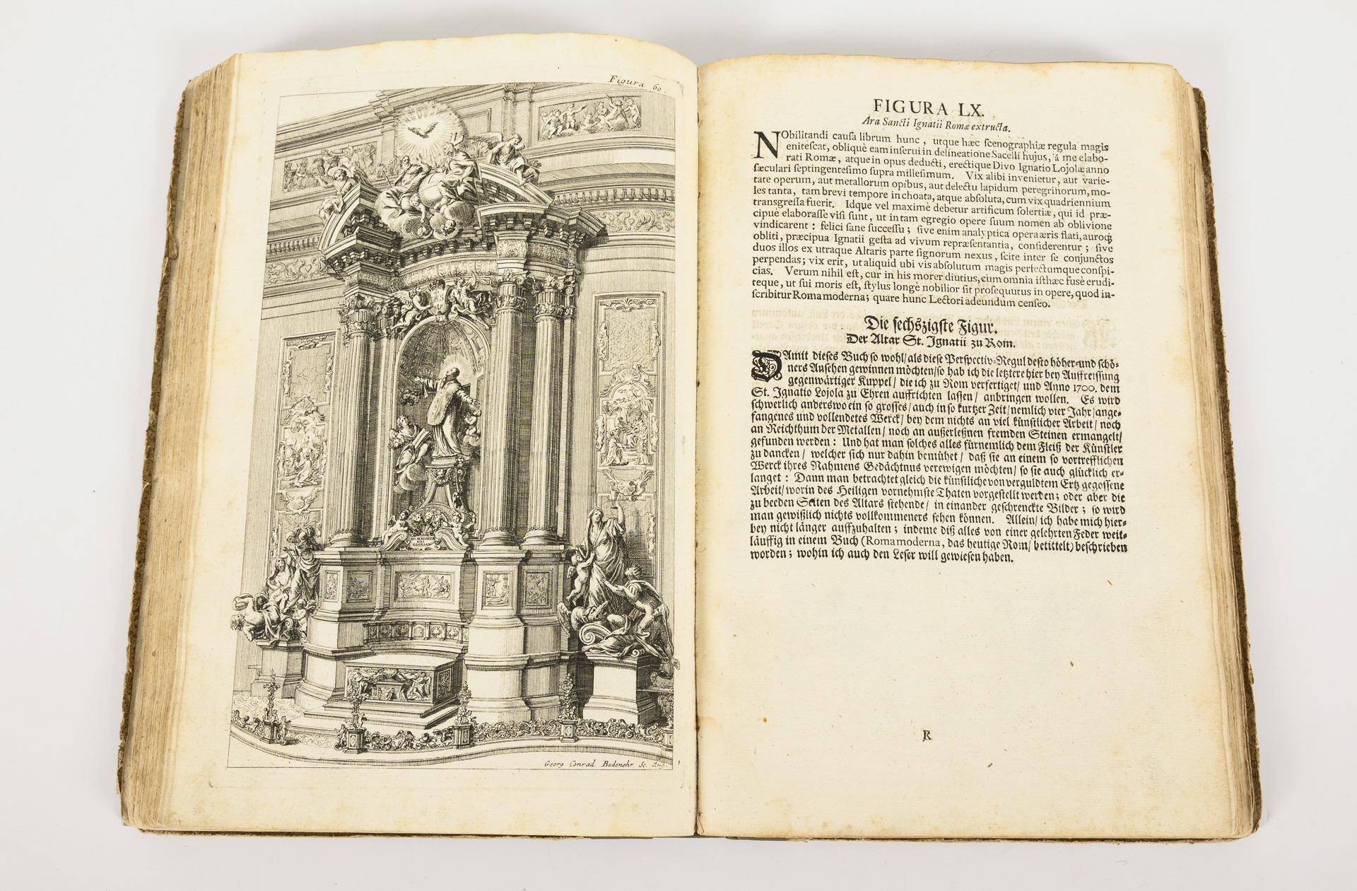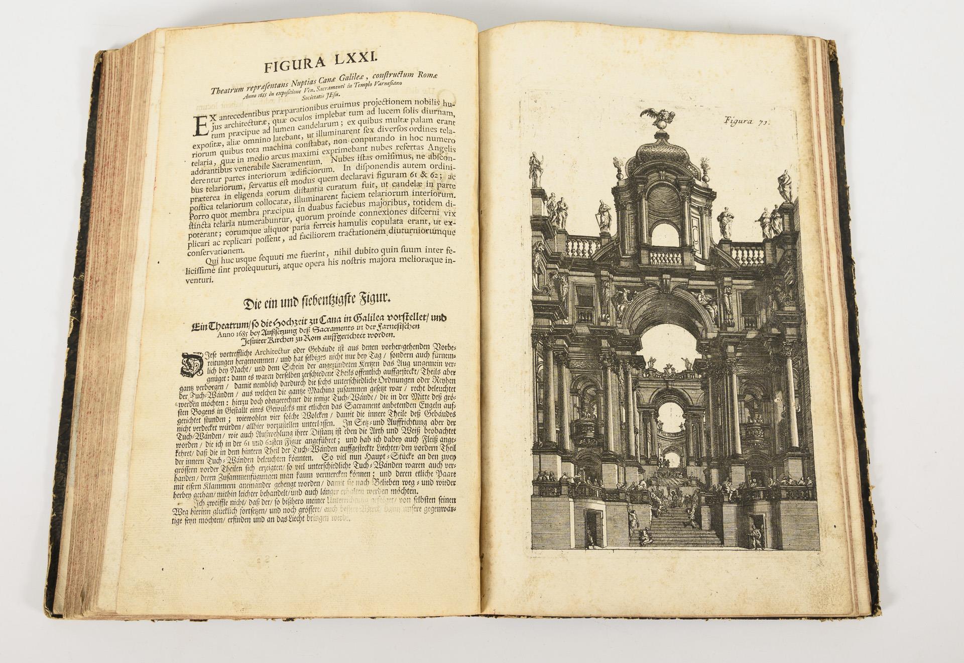 Vergleiche VD18 90864441und VD18 90864433, hier eine abweichende frühere Ausgabe, diese nicht im VD18 verzeichnet / Wichtiges Standardwerk zu Architektur und Perspektive, das dem Barockstil außerhalb Italiens zum Durchbruch verhalf und für die perspektivische Freskomalerei des 18. Jahrhunderts hochbedeutsam war" (Schlosser, Die Kunstliteratur, S. 542 f.).