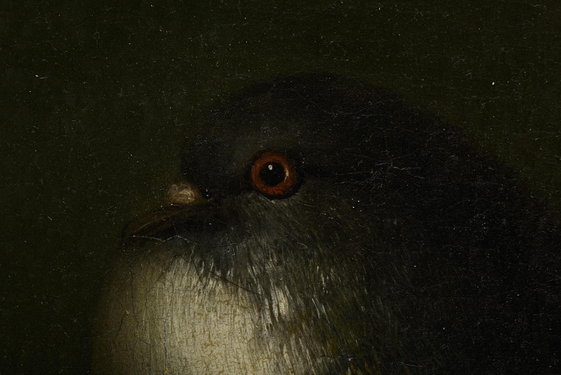 Darstellung zweier hintereinander laufender Tauben. Altersspuren.