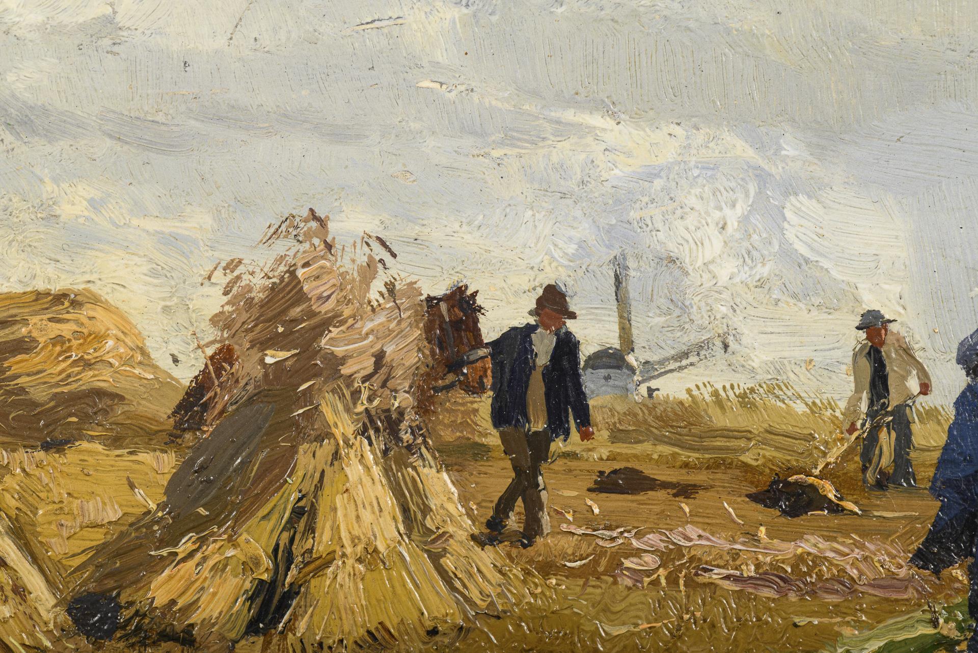 Bauernvolk im Sonnenschein auf den Feldern bei den Kornhocken.