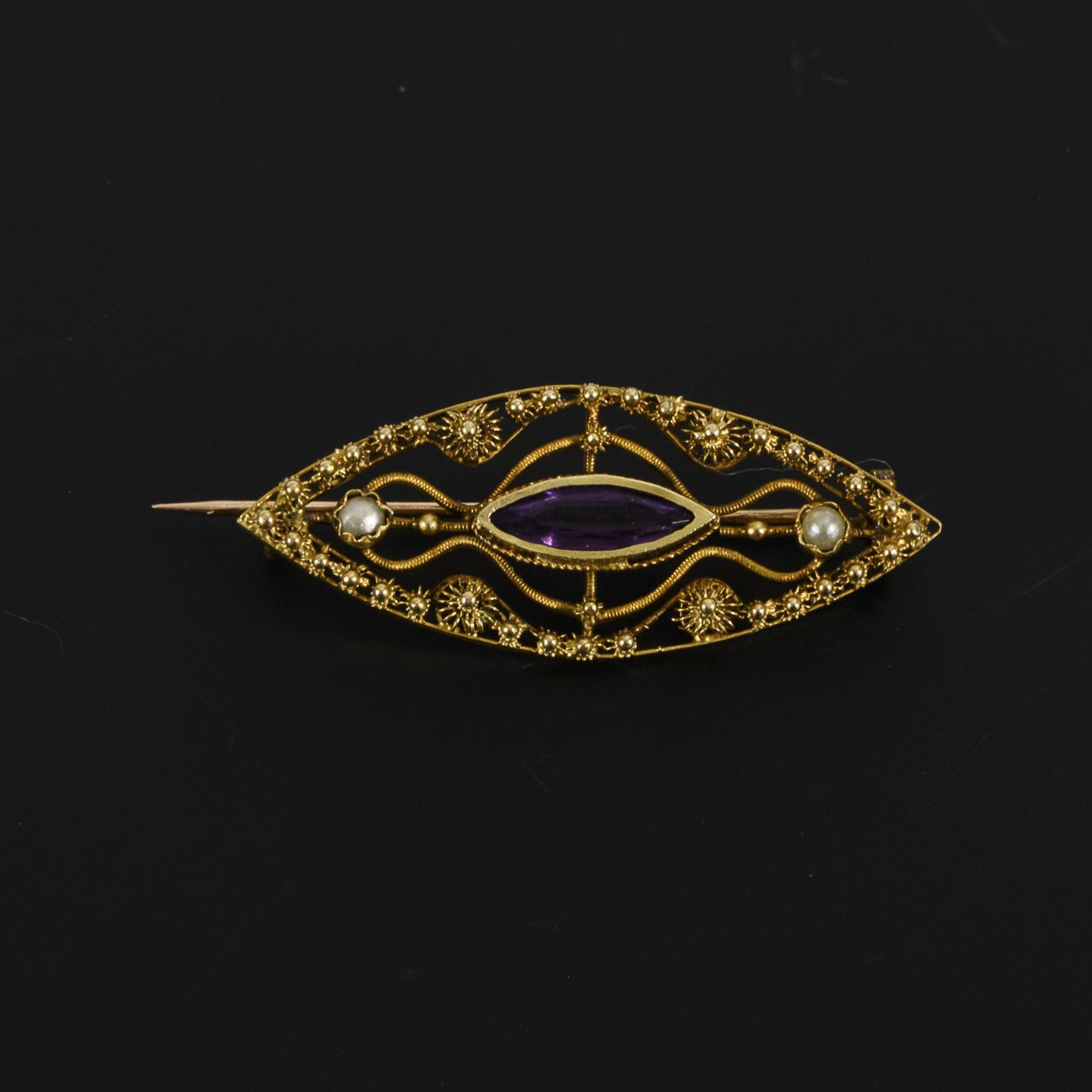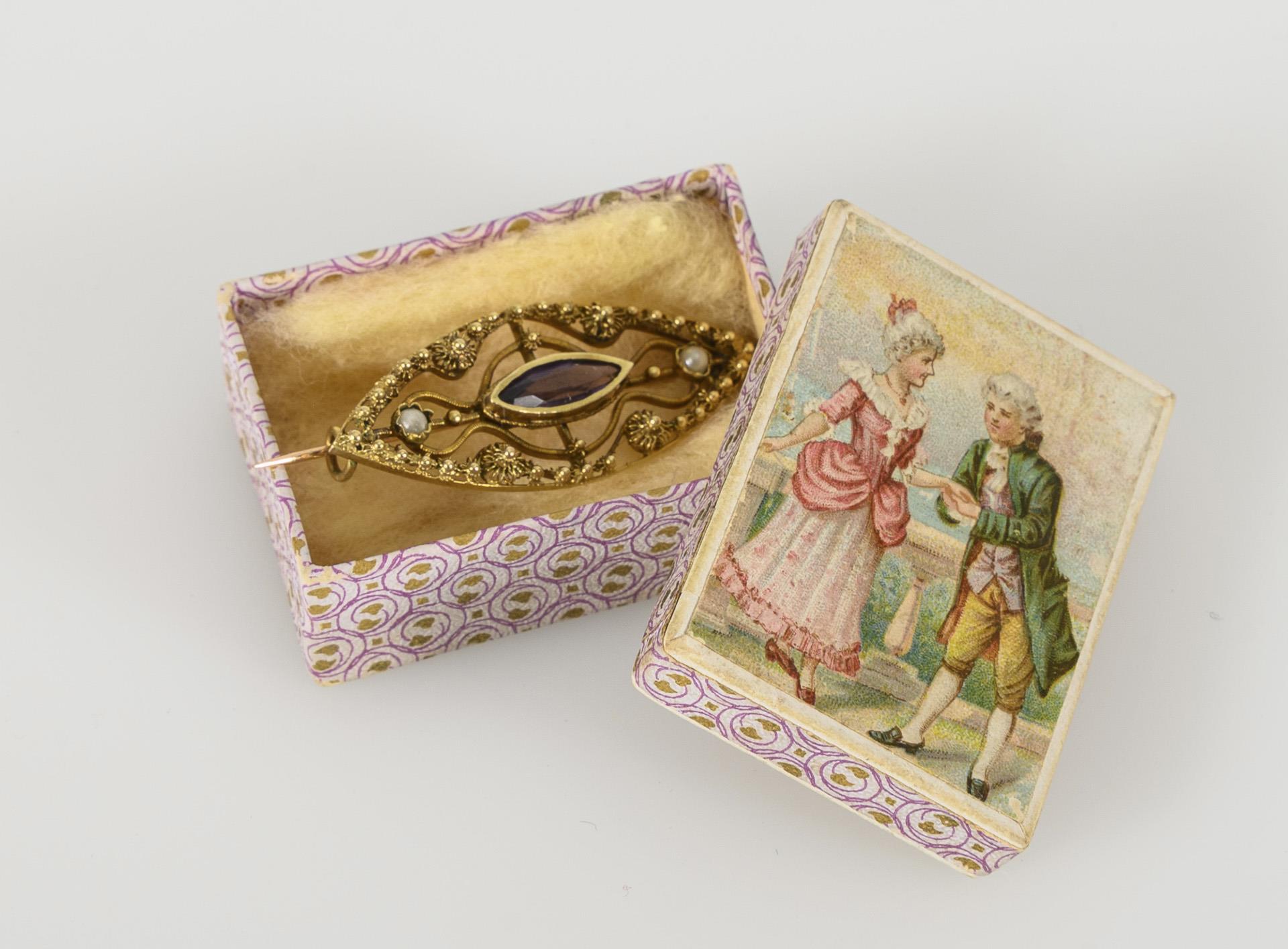 Sie befinden sich hier: Startseite Kategorien Schmuck Niederländische Jugendstil-Brosche mit violetter Farbstein-Imitation