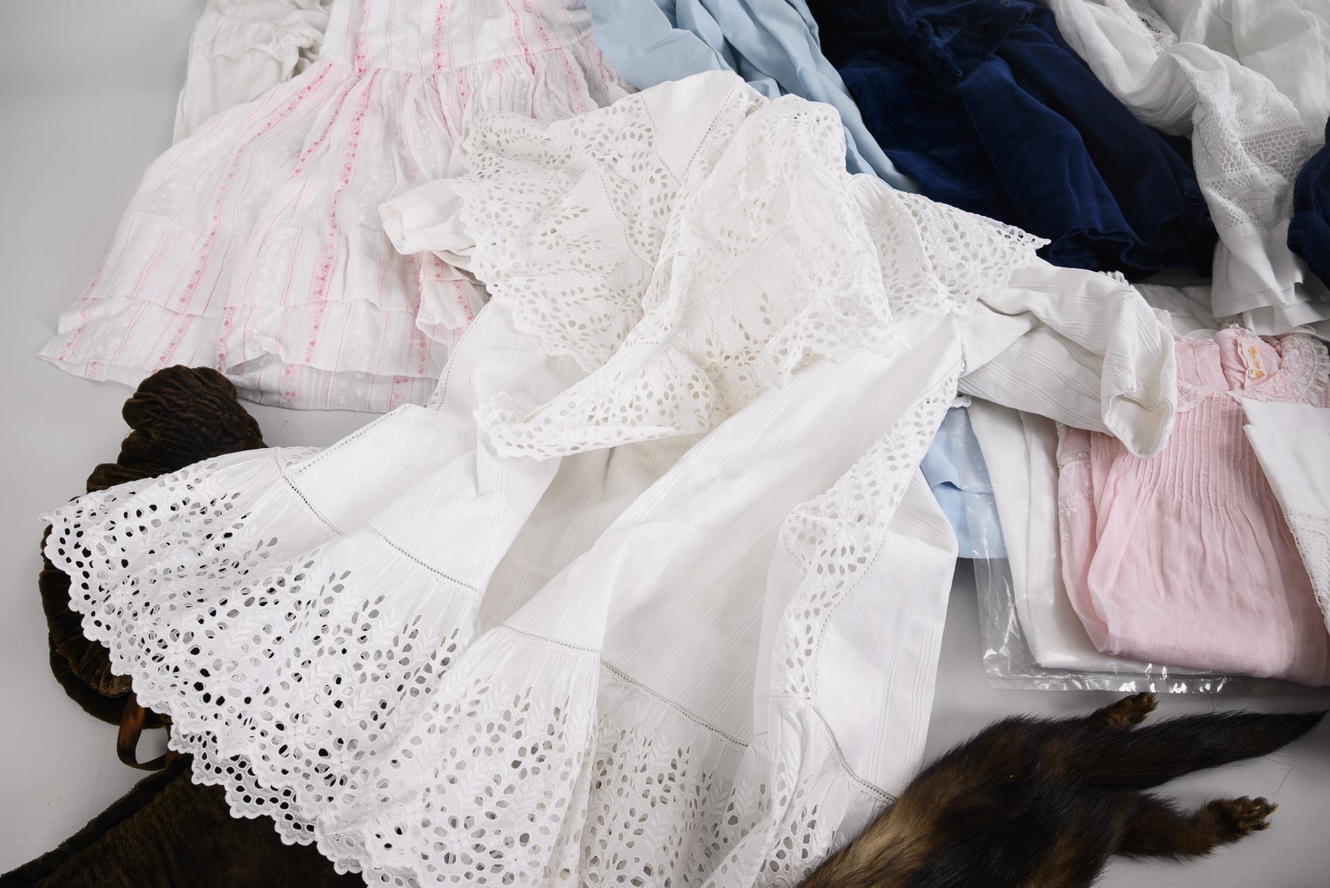 Braune Kindermütze und Muff aus Samt, 5 Kinderkleider, 2 Taufkleider und mehrere Teile Wäsche, dazu 3 Puppen-Pelzcolliers. Teils leichte Altersspuren.