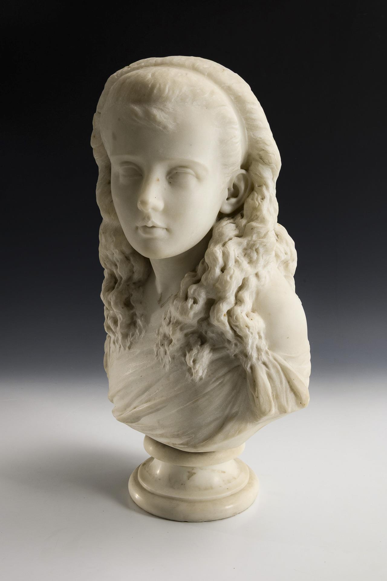 Junges Mädchen mit langem, lockigem Haar, das durch einen Haarreif aus dem Gesicht gehalten wird, auf einem Rundsockel. Kleiner Chip an der Oberlippe.
