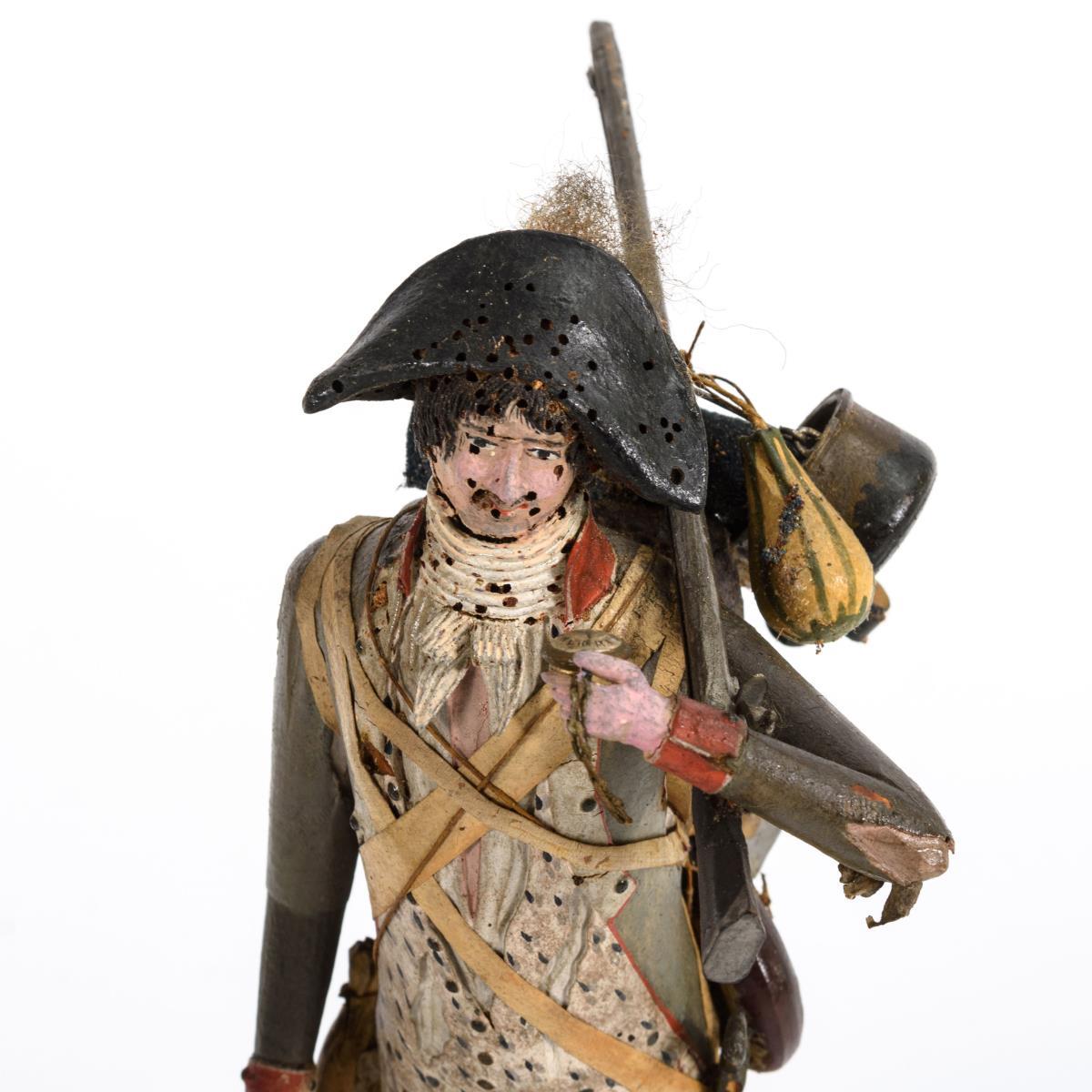 Holz polychrom gefasst, sowie Papier, Fäden und Wolle. H maximal 25 cm (ohne Gewehr).