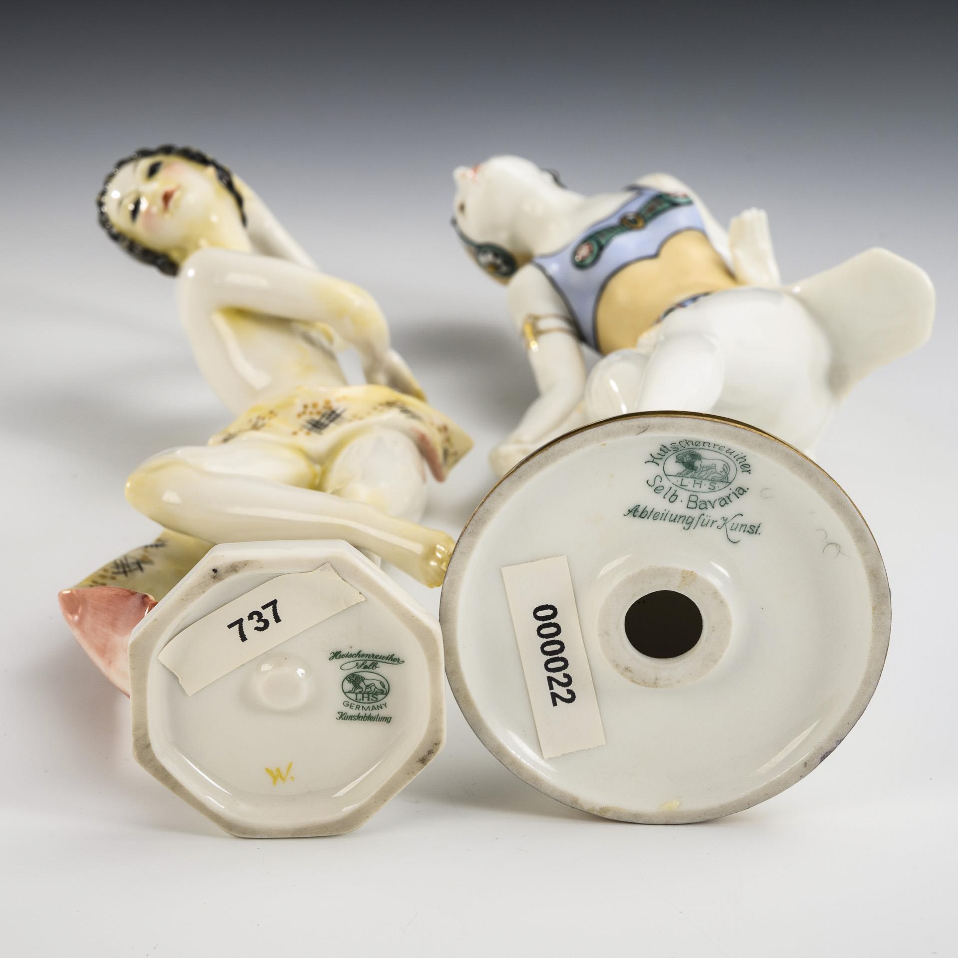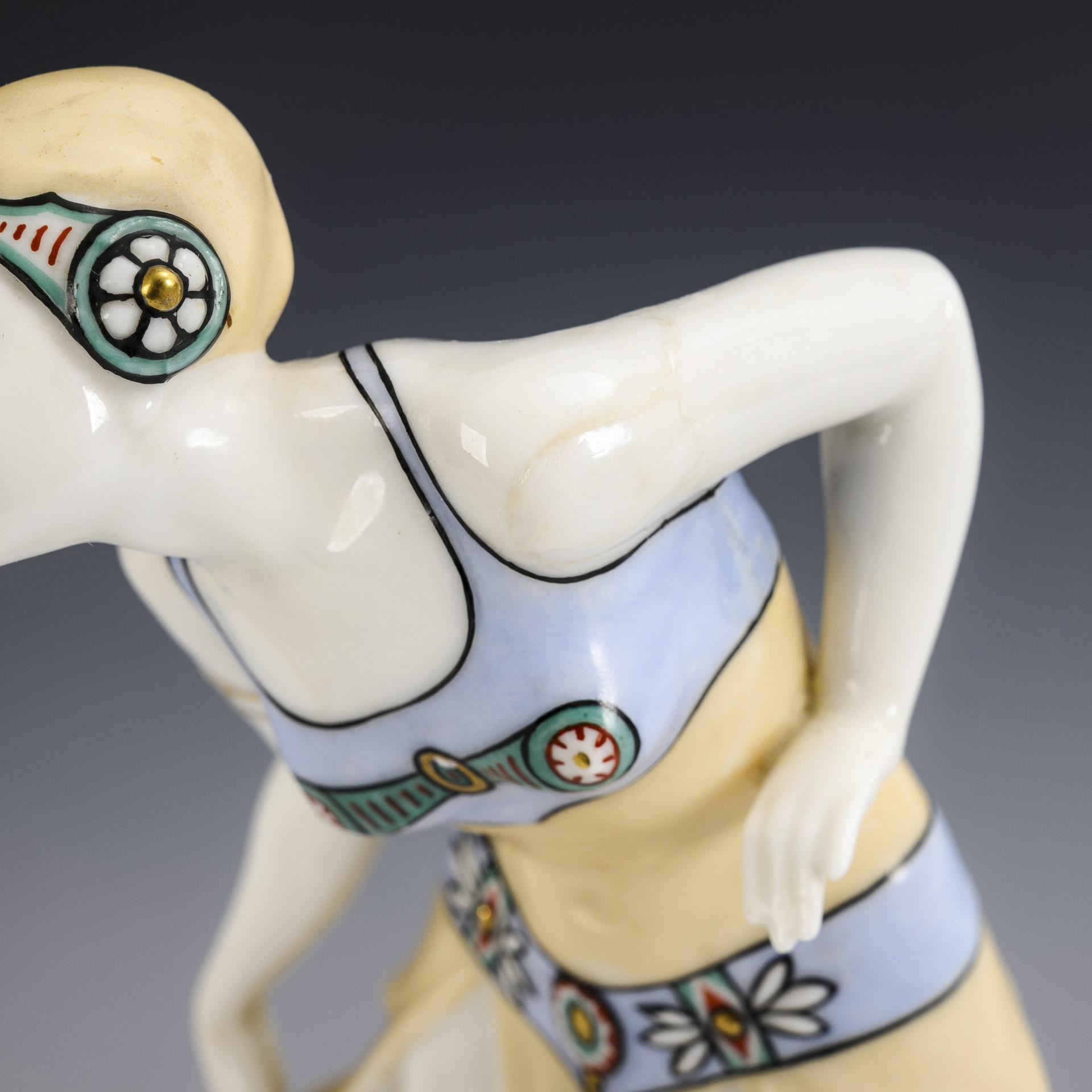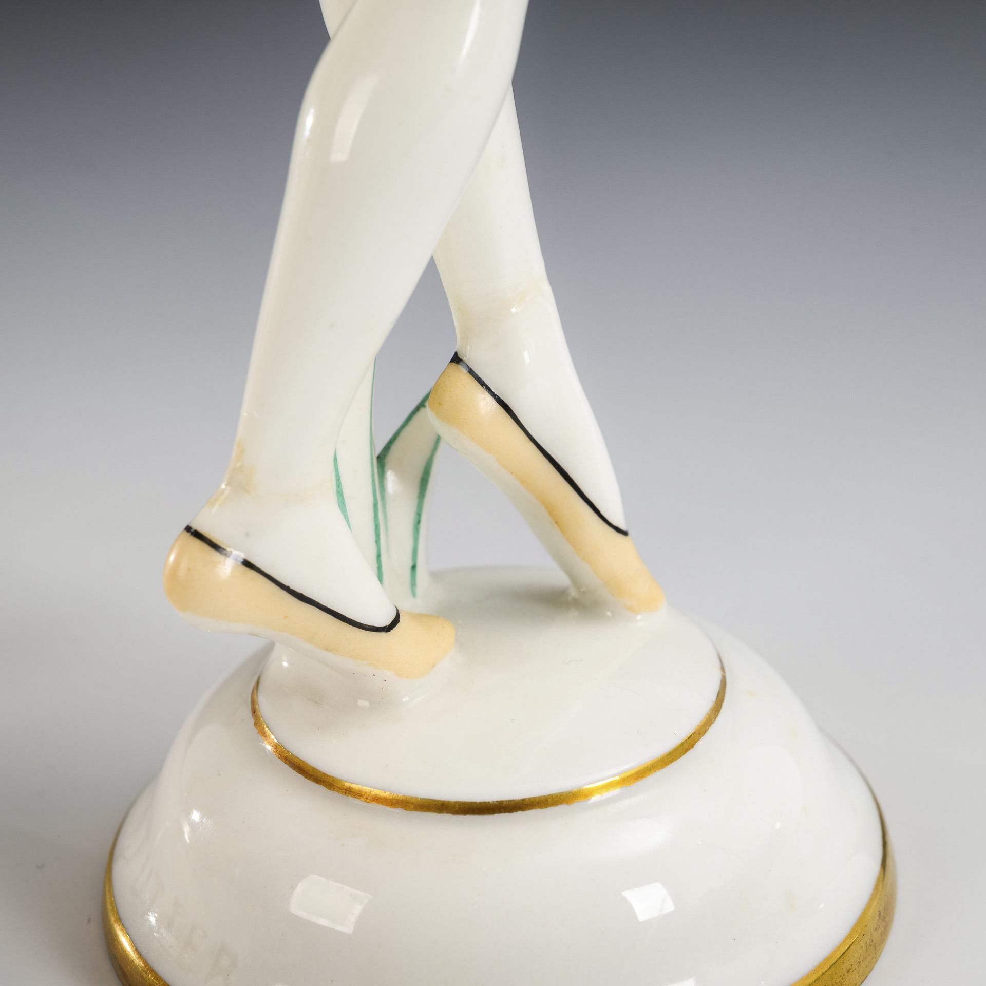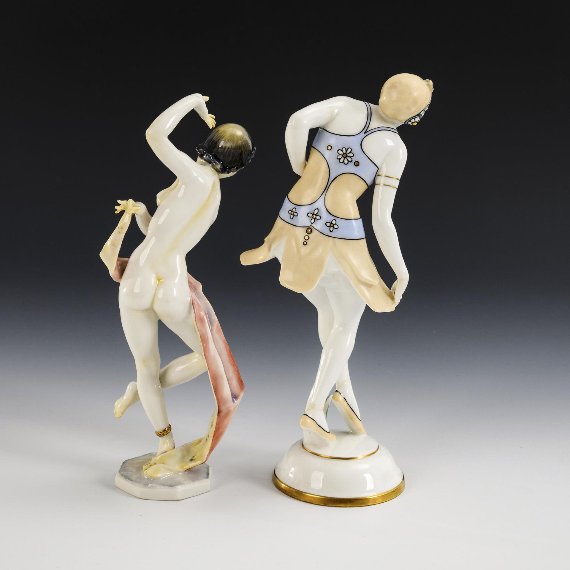 1x Art déco, Stempelmarke 1918-1938, Entwurf von Karl Tutter (1883-1969): an einem stilisierten Grasbüschel in Tanzpose stehende Tänzerin. / 1x Stempelmarke ab 1955: auf einer okrogonalen Plinthe in Tanzpose stehender Akt einer jungen Frau. 1x rechte Hand restauriert und an den Fußgelenken geklebt.