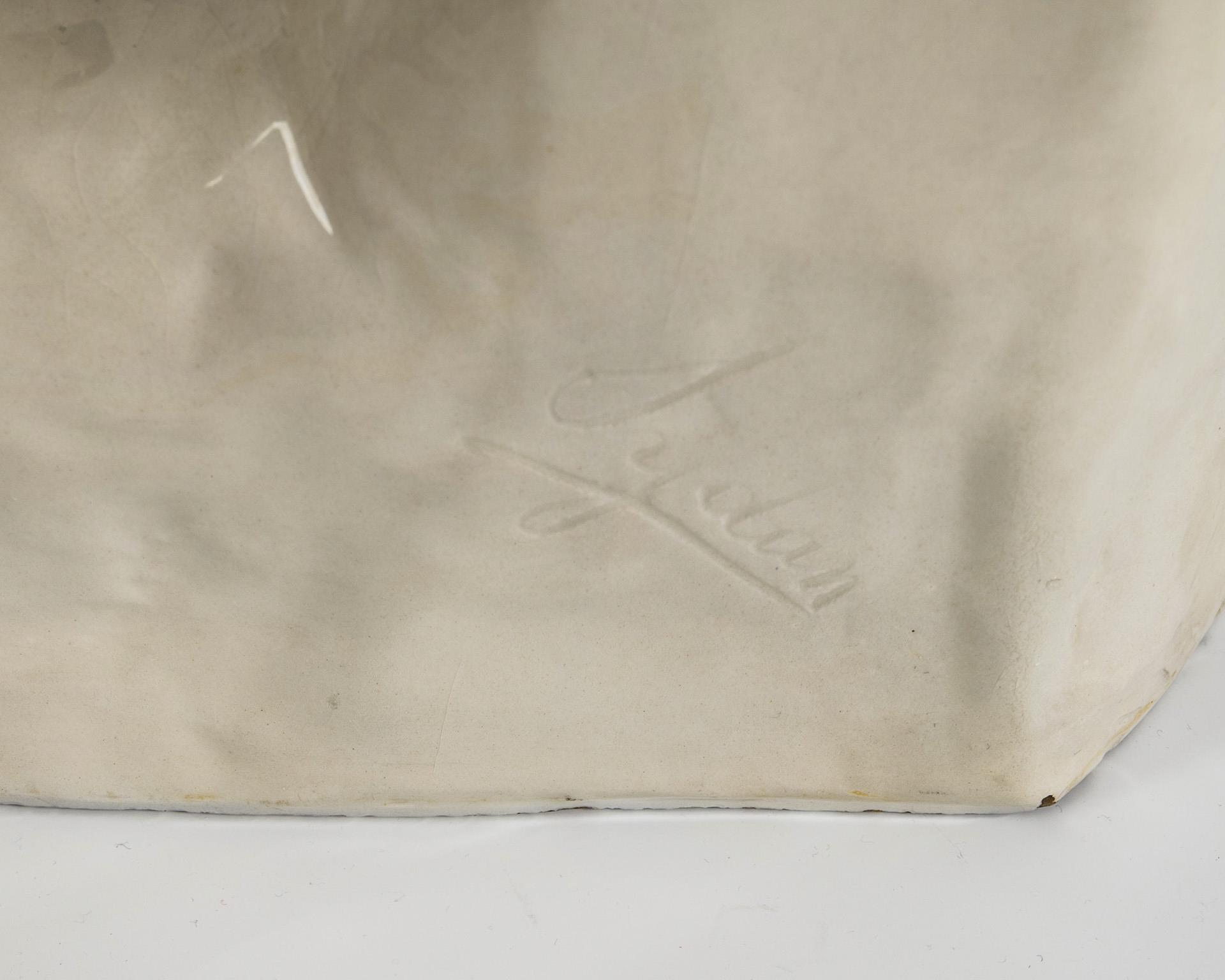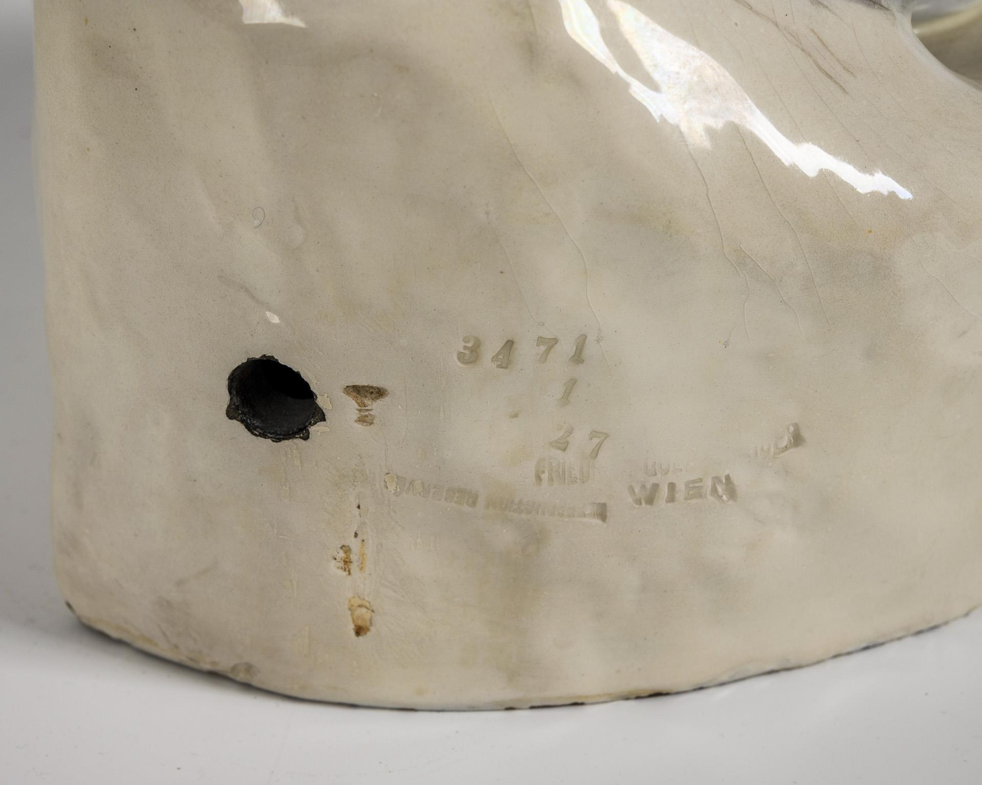 Prägemarke "Friedrich Goldscheider Wien" mit Zusatz "Reproduction Reservée", um 1895-1910. Am Sockel signiert "Sydan" (laut WVZ wohl ein Pseudonym des Bildhauers Thomas SEIDAN). Modell-Nr. 3471 1 27.