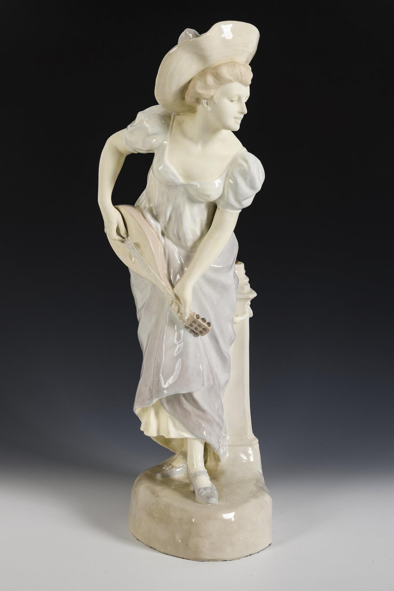 Stehendes Mädchen mit Hut, Sommerkleid und Mandoline, auf einem ovalen Natursockel mit Rechtecksäule. Nicht elektrifiziert, ohne Lampenhalterung und -schirm. Säulenkapitell restauriert, 1 Stimmwirbel bestoßen.