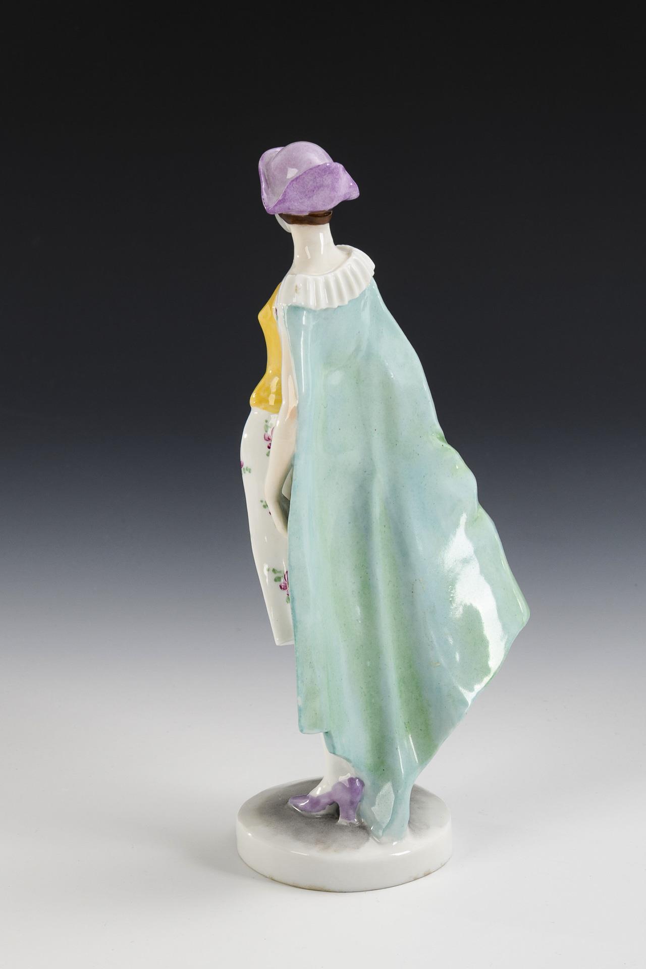 Auf einer Rundplinthe stehende, modisch gekleidete Dame mit Hut und Umhang.