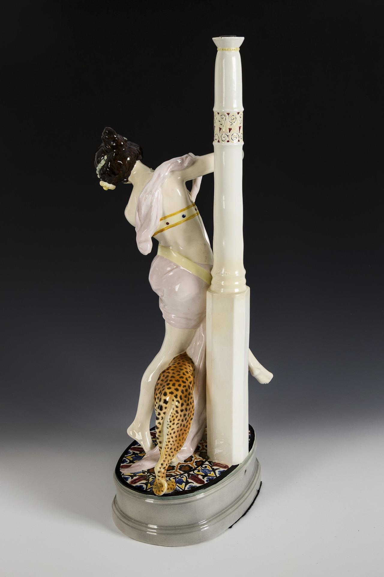 Tanzende junge Frau (Bacchantin) mit gefleckter Raubkatze, auf ovalem Sockel mit hohem Säulenschaft. Nicht elektrifiziert. Ohne Lampenhalterung und -schirm. Restauriert.