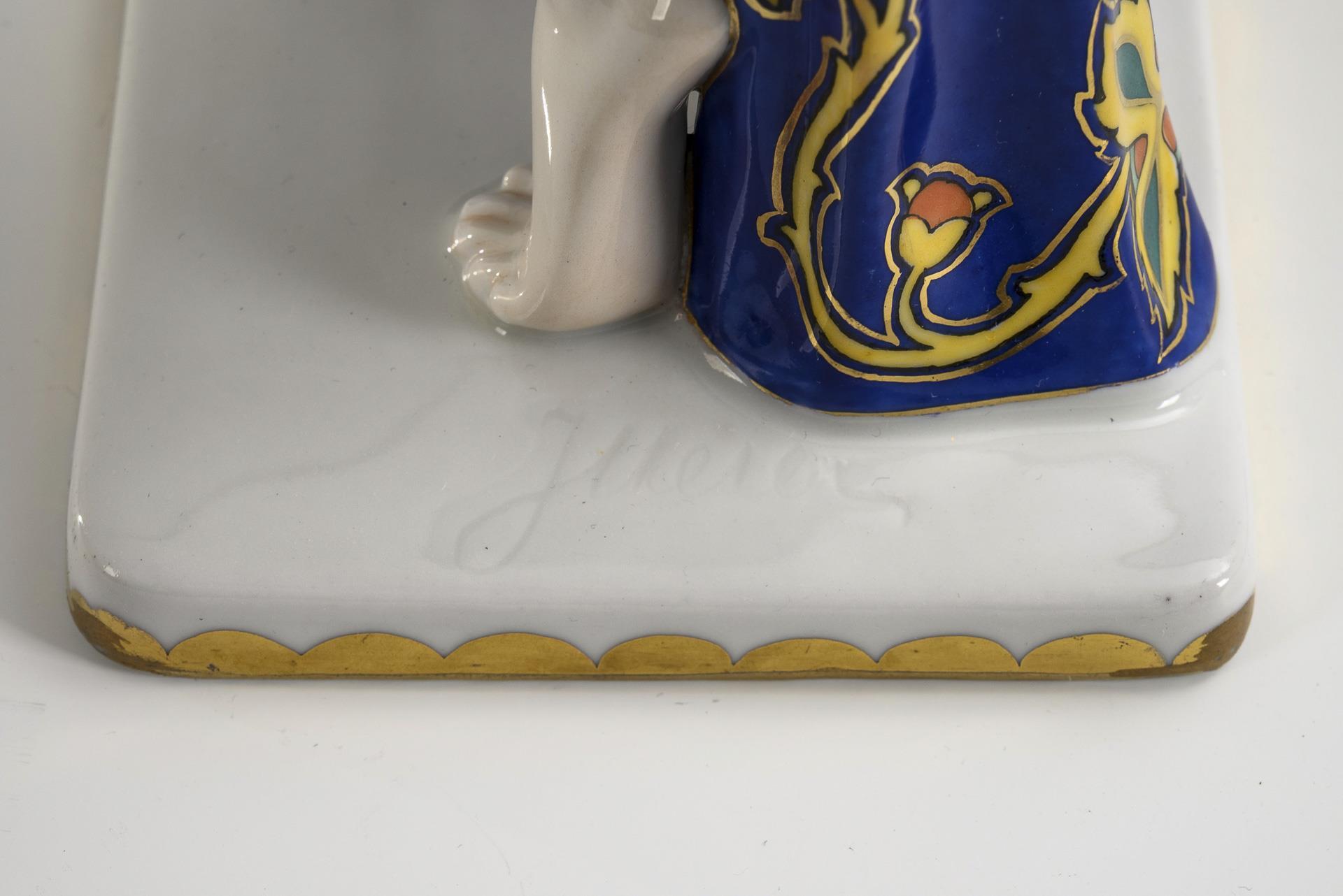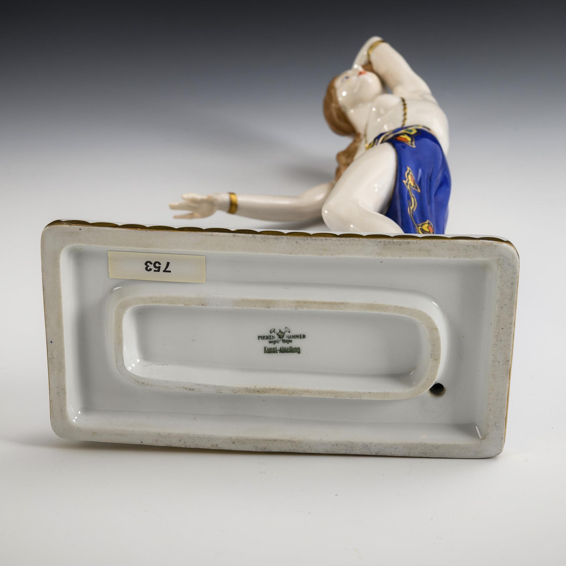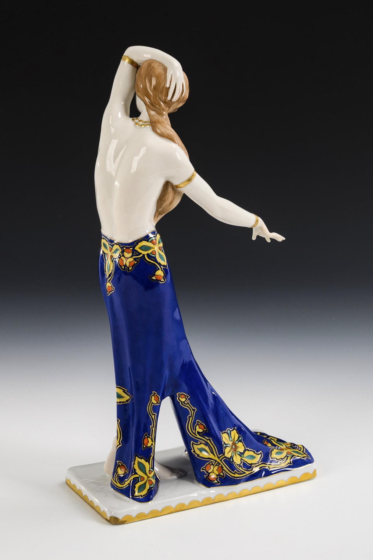Auf einer Rechteckplinthe stehender Akt einer Tänzerin im langen Rock. Rechte Hand restauriert.