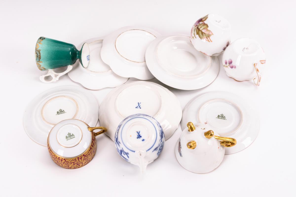 6 verschiedene Mokkatassen (darunter Rosenthal und Meissen). Partiell minimaler Goldabrieb.