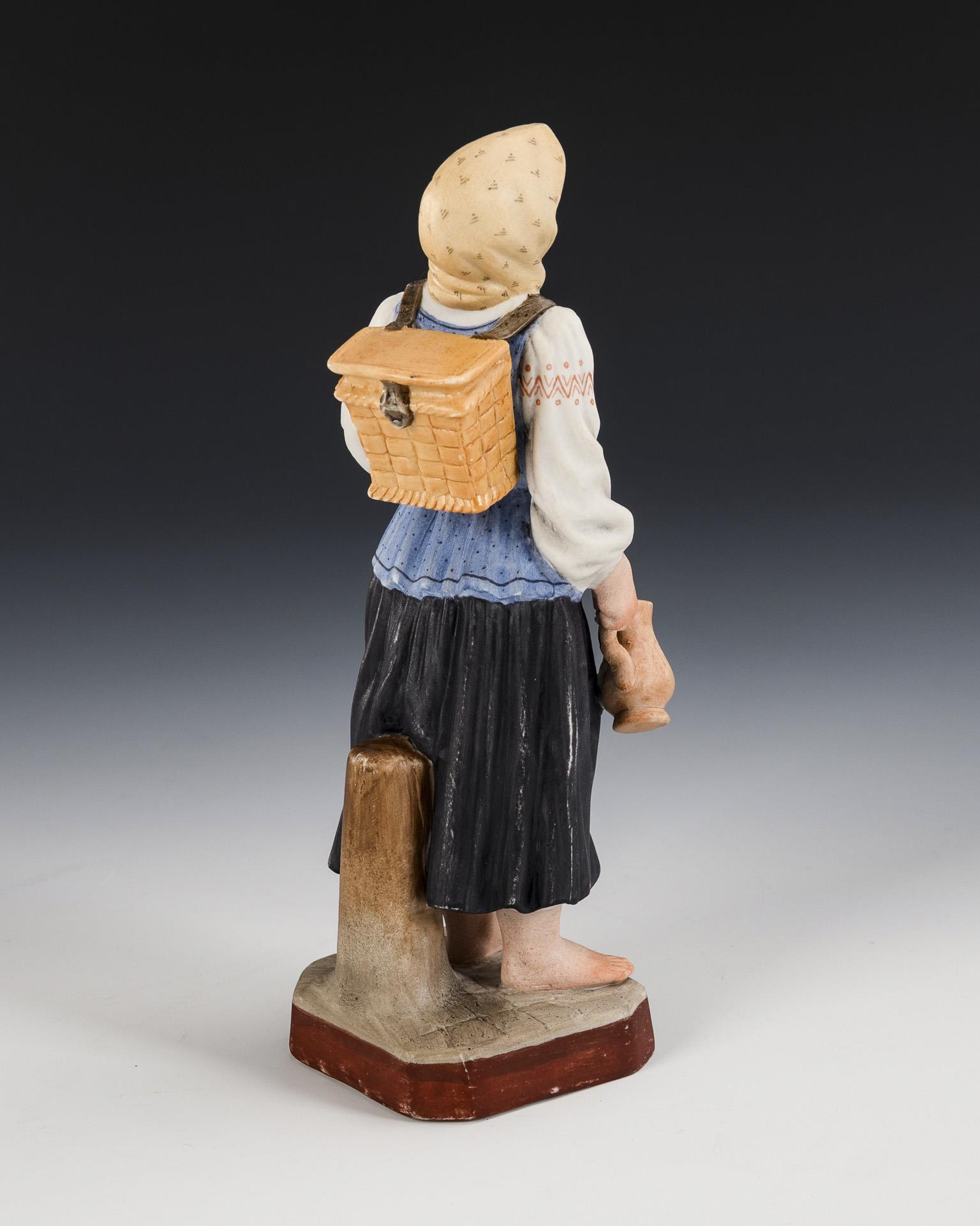 Stehende junge, einen Korb auf dem Rücken tragende Frau, einen Krug und einen Becher tragend.