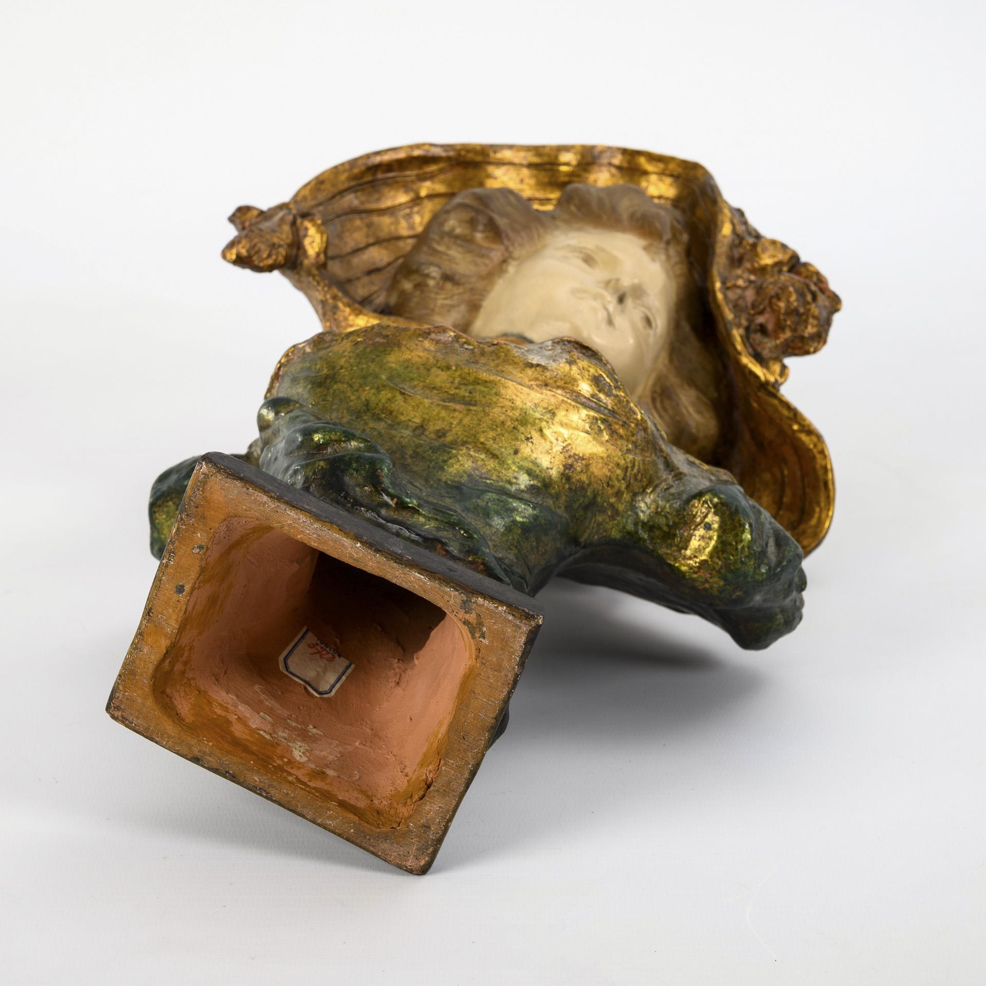 In Art der Goldscheider-Jugendstil-Figuren gefertigte Büste eines nach links blickenden Mädchens mit großem, Blumen geschmücktem Hut, auf hohem Quadratsockel mit konkaven Seiten. Partiell minimale Glasurchips.