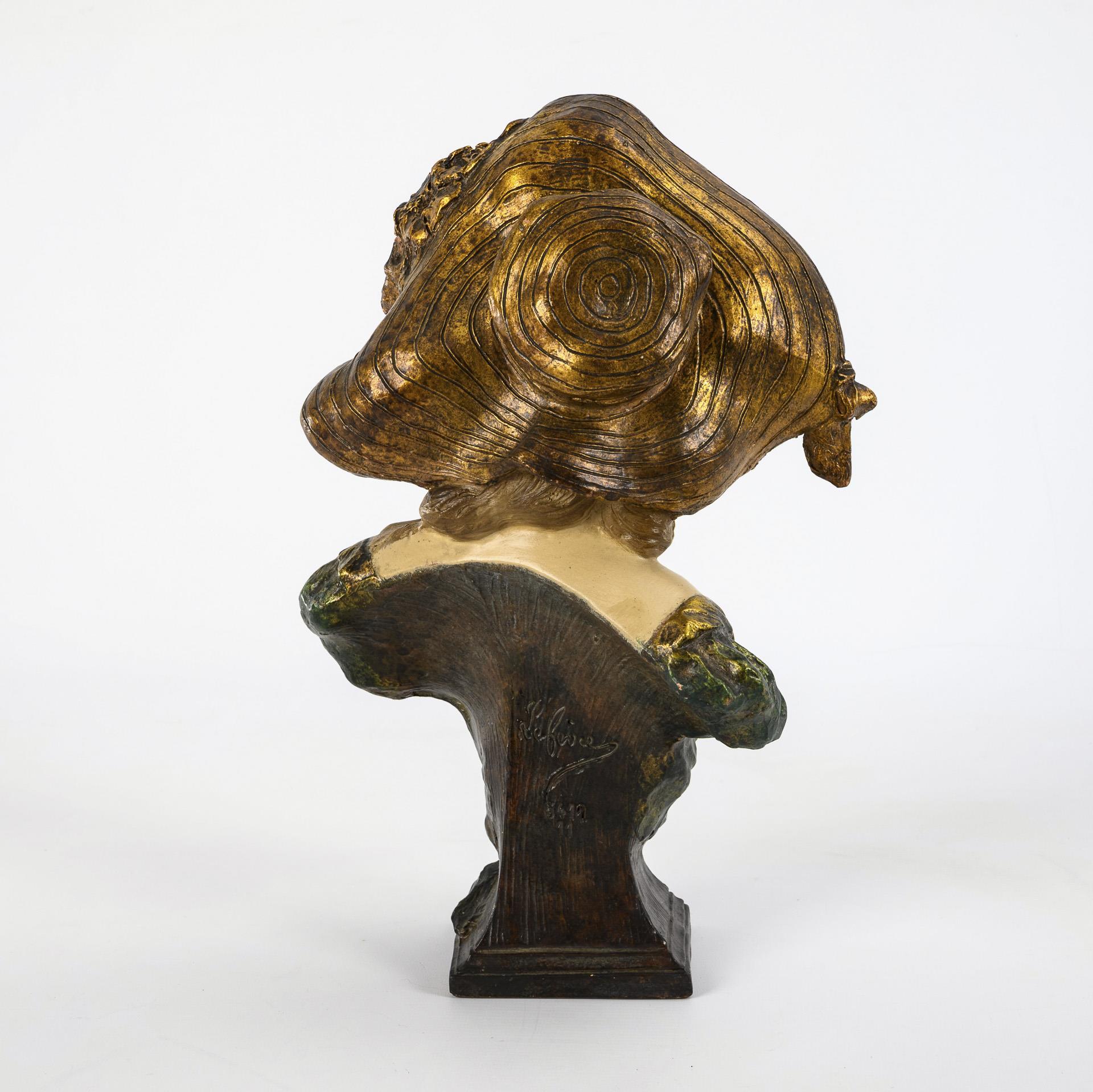 Kleine Jugendstil-Terrakotta-Büste einer Dame mit großem Hut.