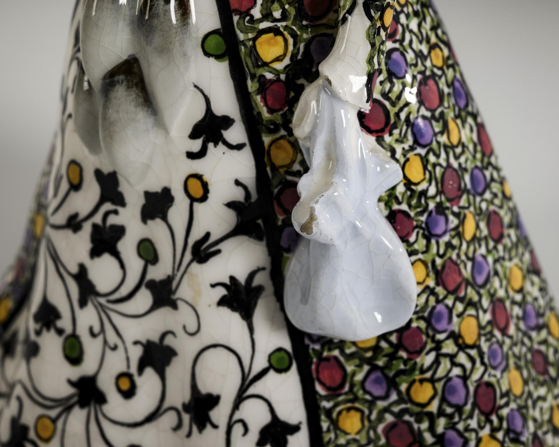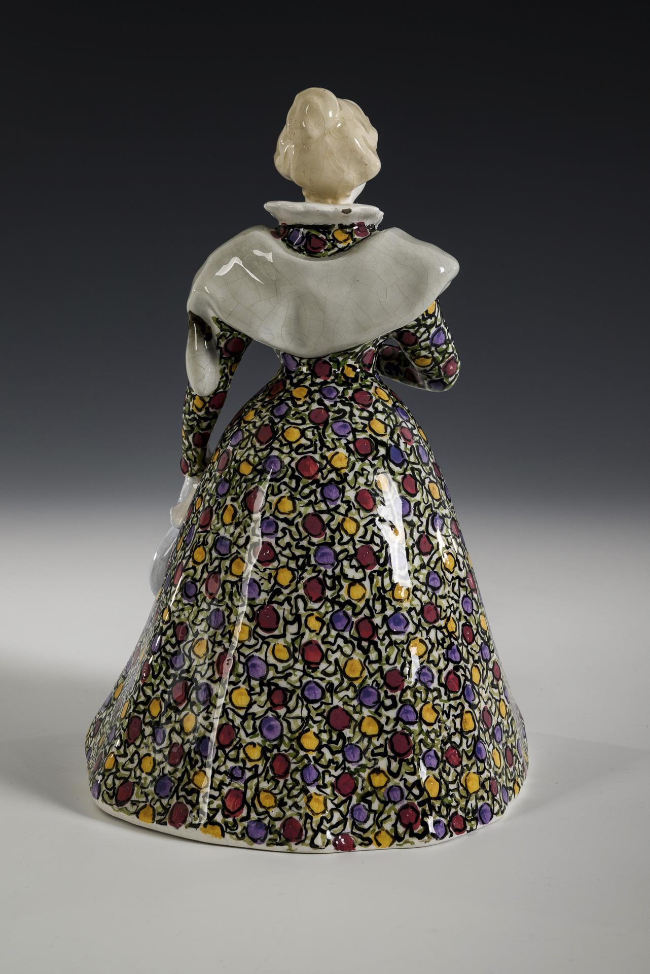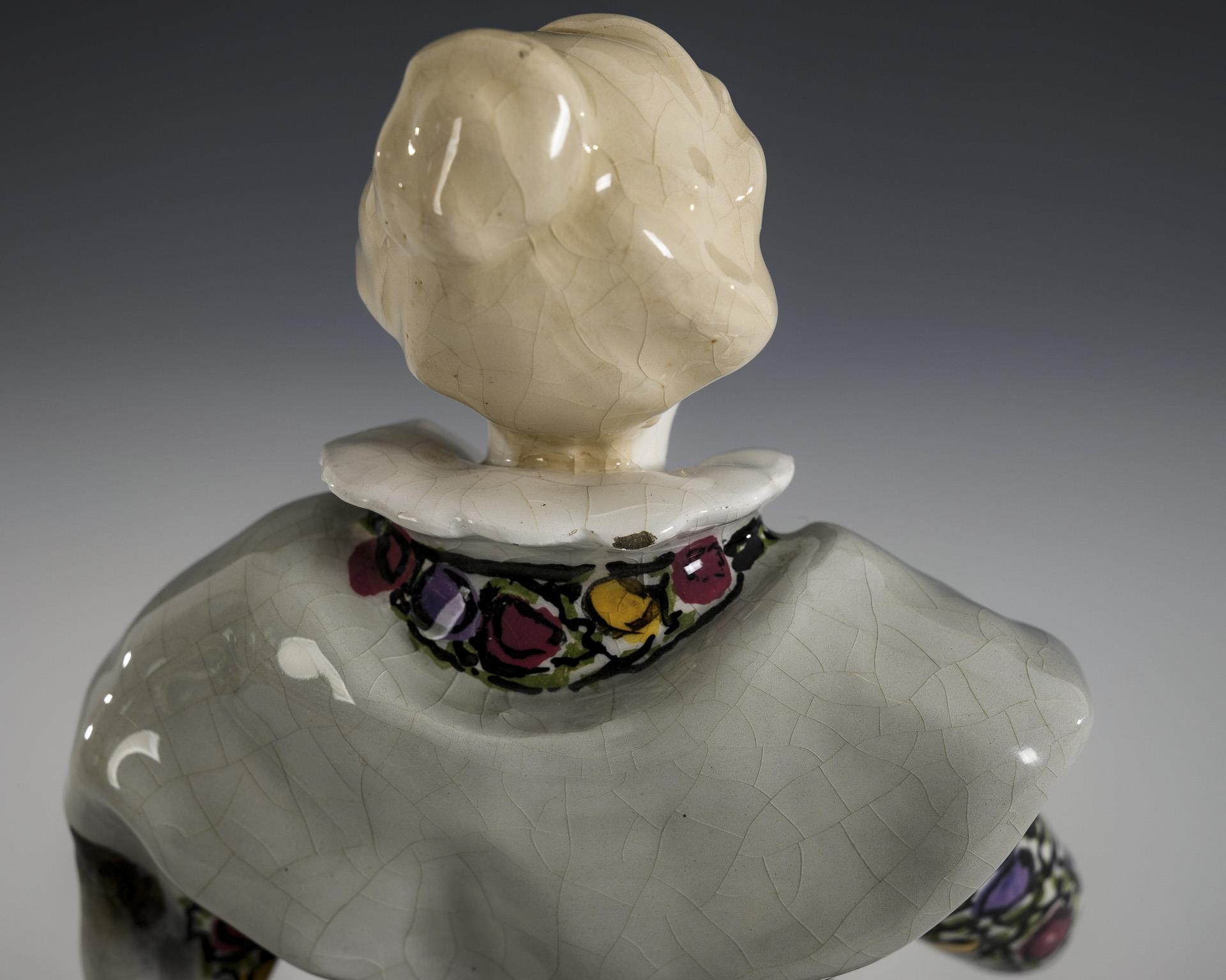 Stehende Dame in einem geblümten, historistischen Kleid mit grauem Pelzüberwurf. Partiell Glasurabplatzer und minimale Kantenbestoßungen.