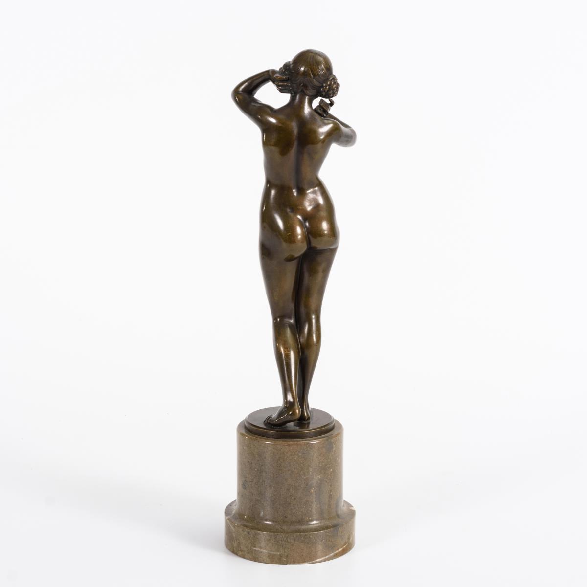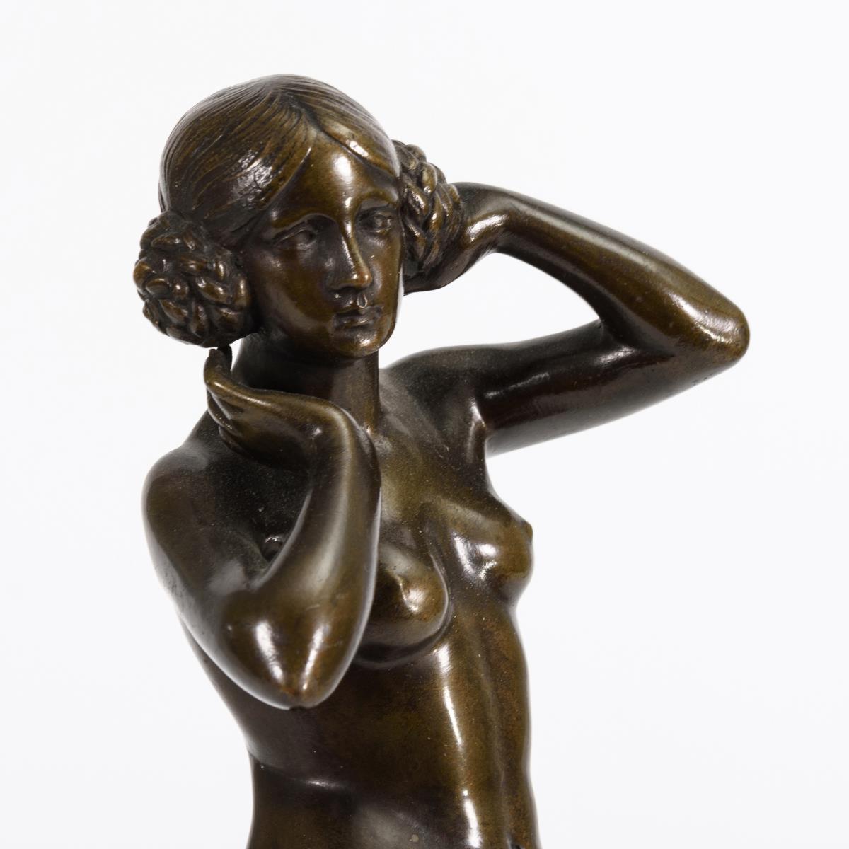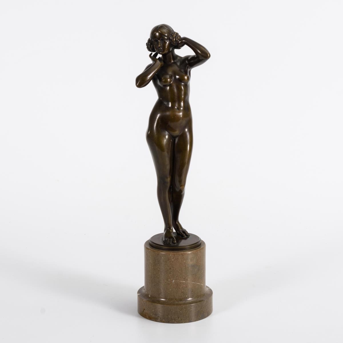 Anmutig stehende Frau mit den Händen an den Schneckenzöpfen. Patina etwas berieben.