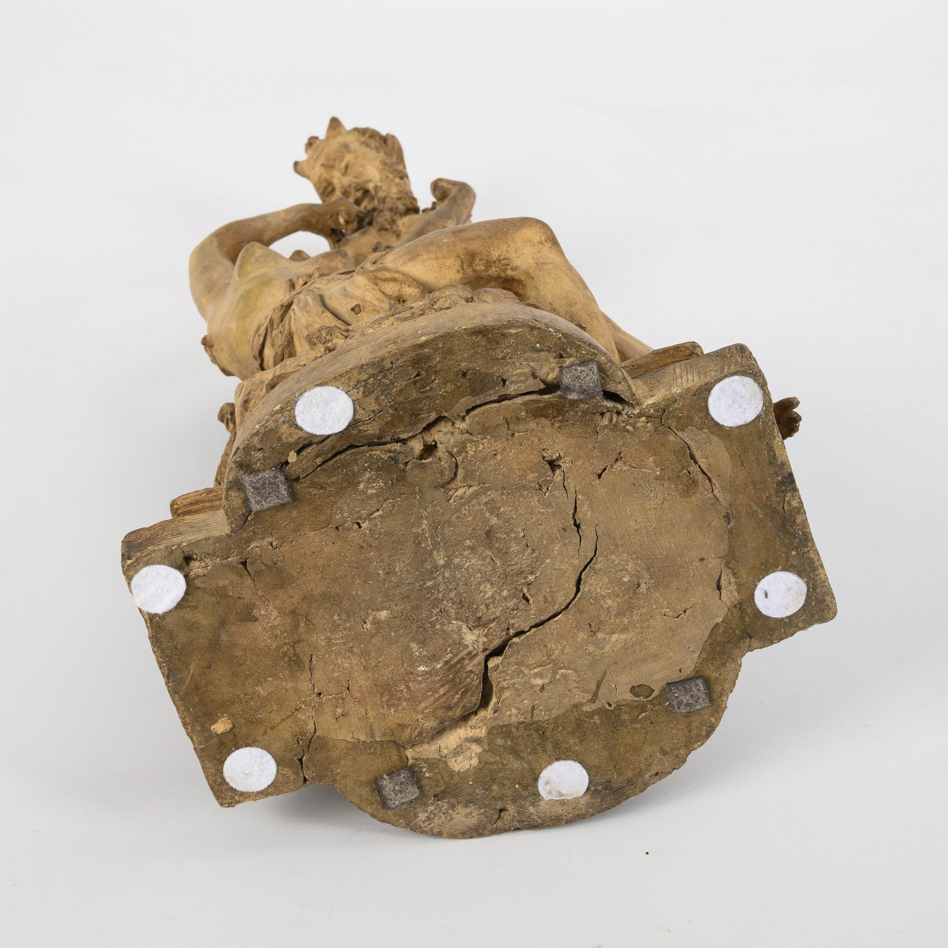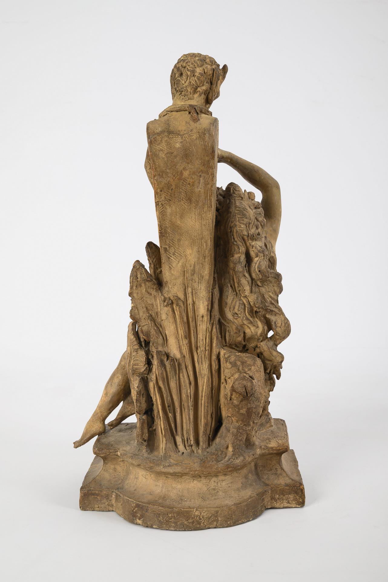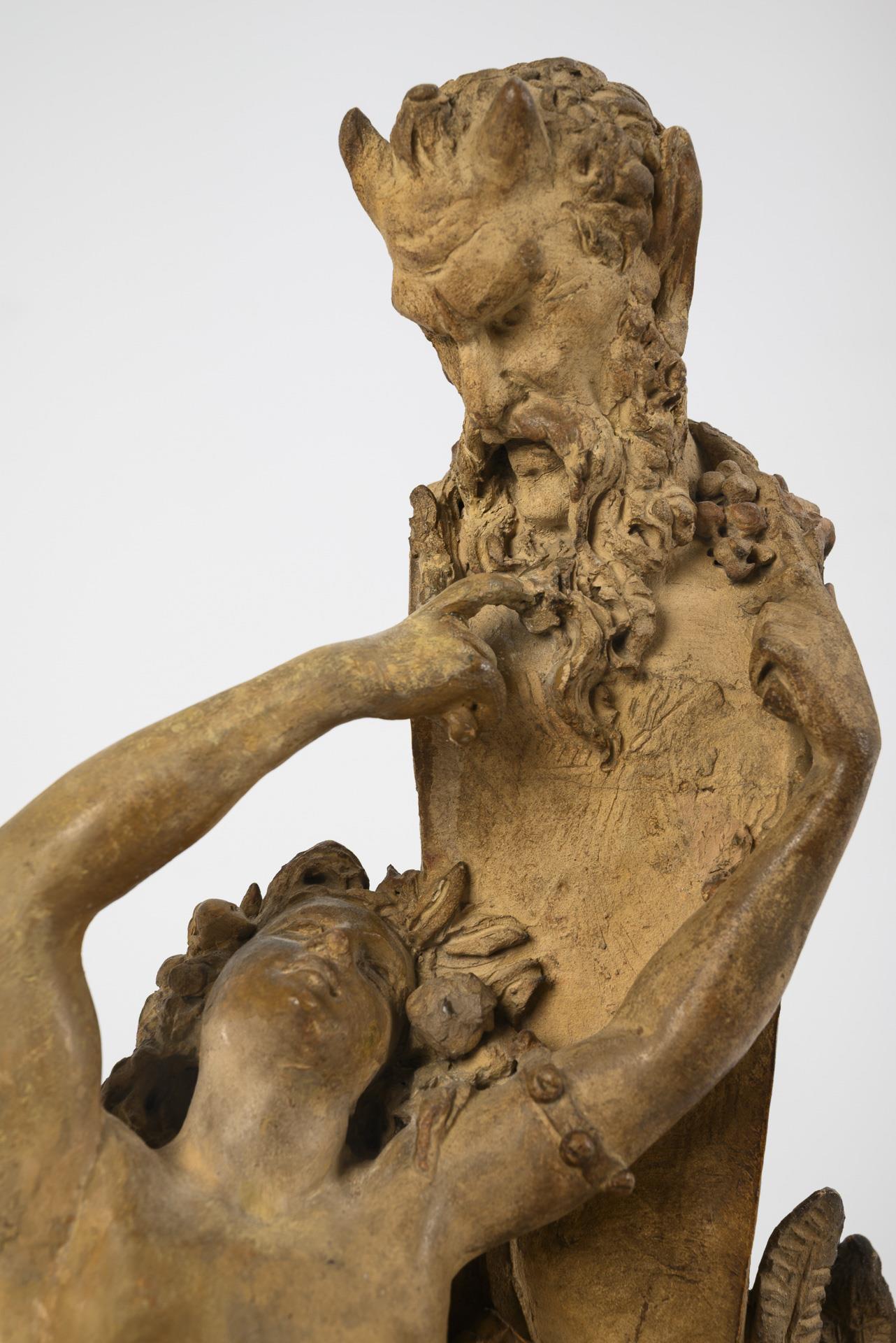 Jugendstil-Figur einer jungen Bacchantin, die in lebhafter Bewegung auf einer Bank vor einer Faunsherme lagert und mit einem Weinzweig das Haupt der Faunsfigur verführerisch umschließt. Einige Weintrauben und ein Glöckchen des Schellenbandes fehlen.