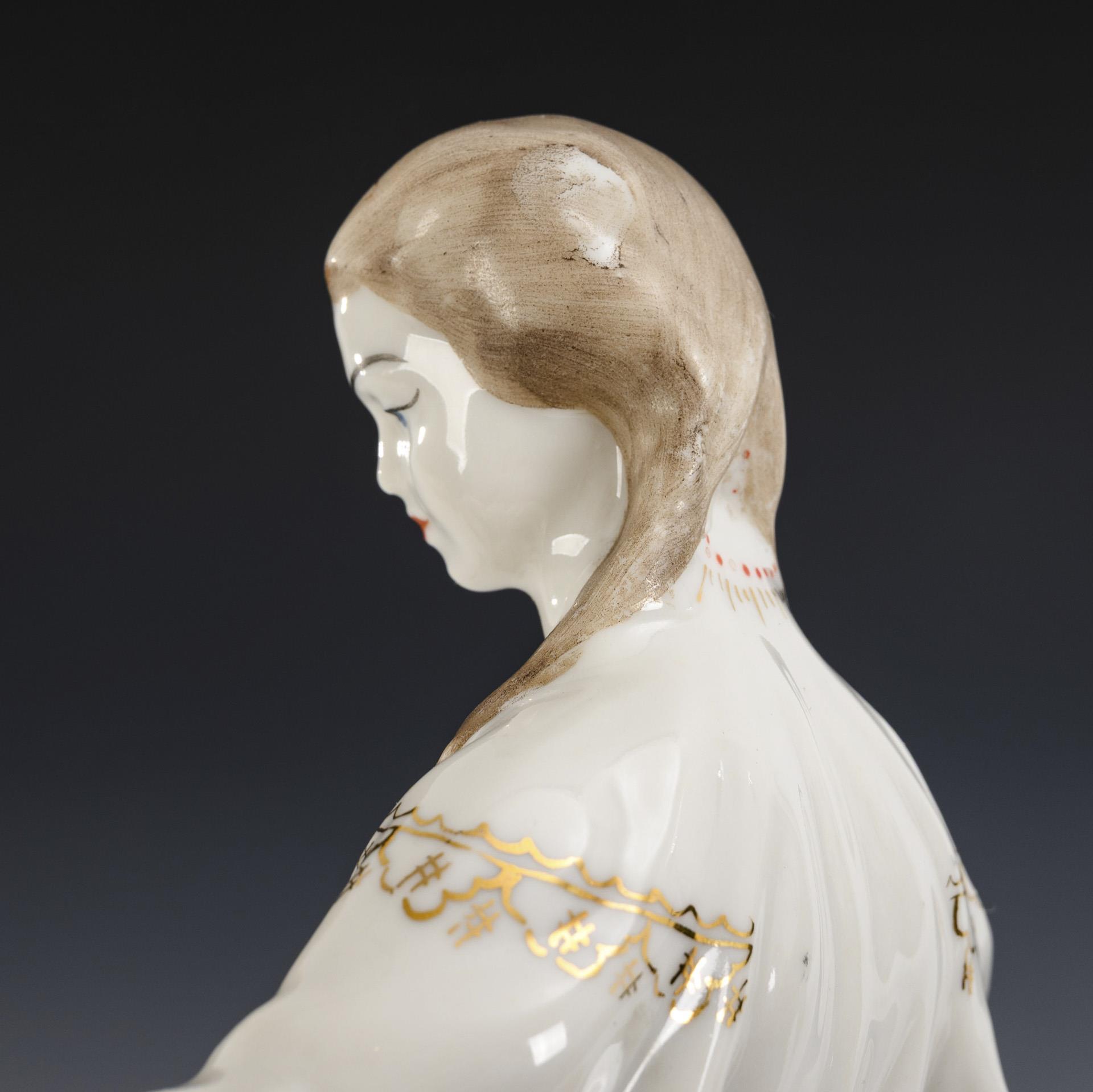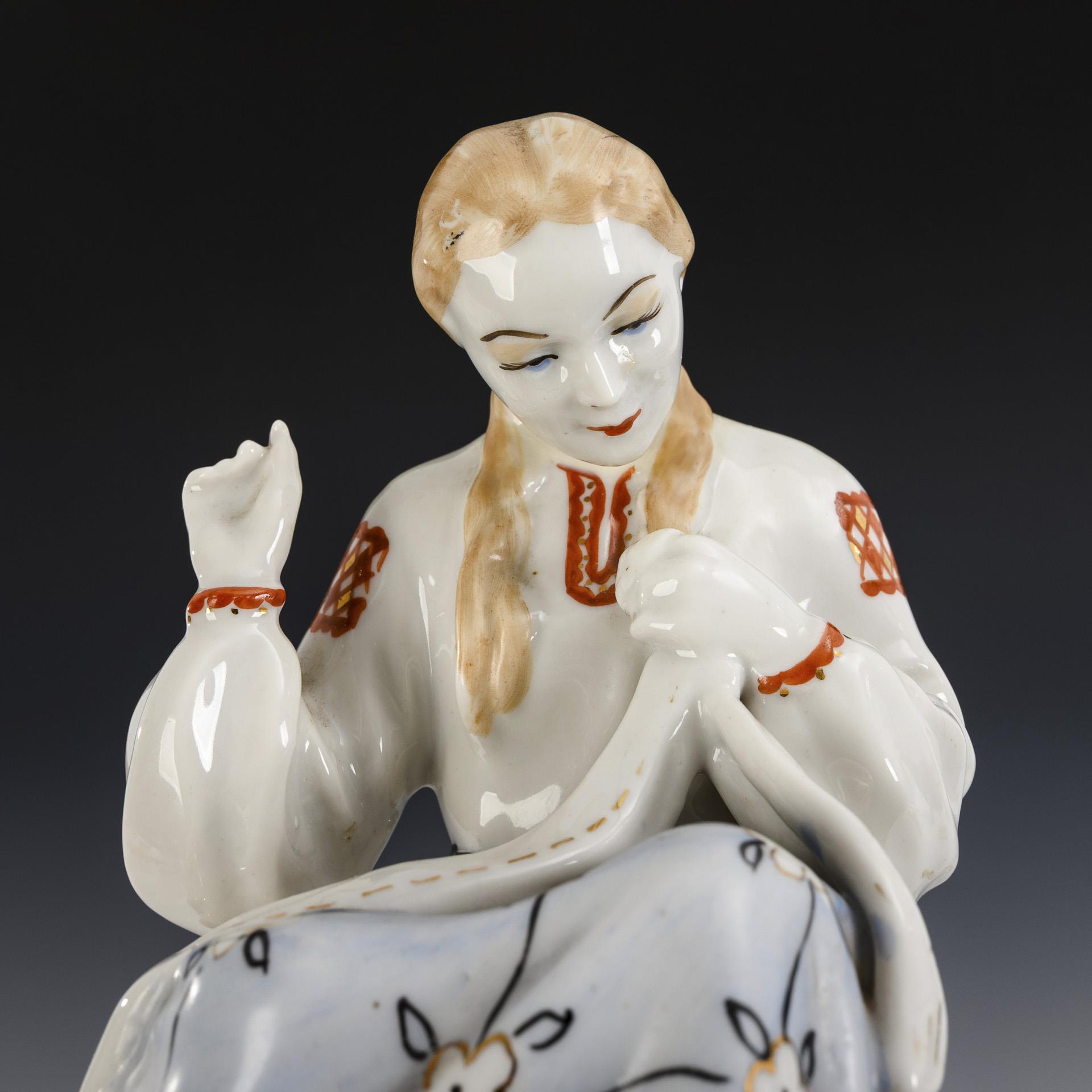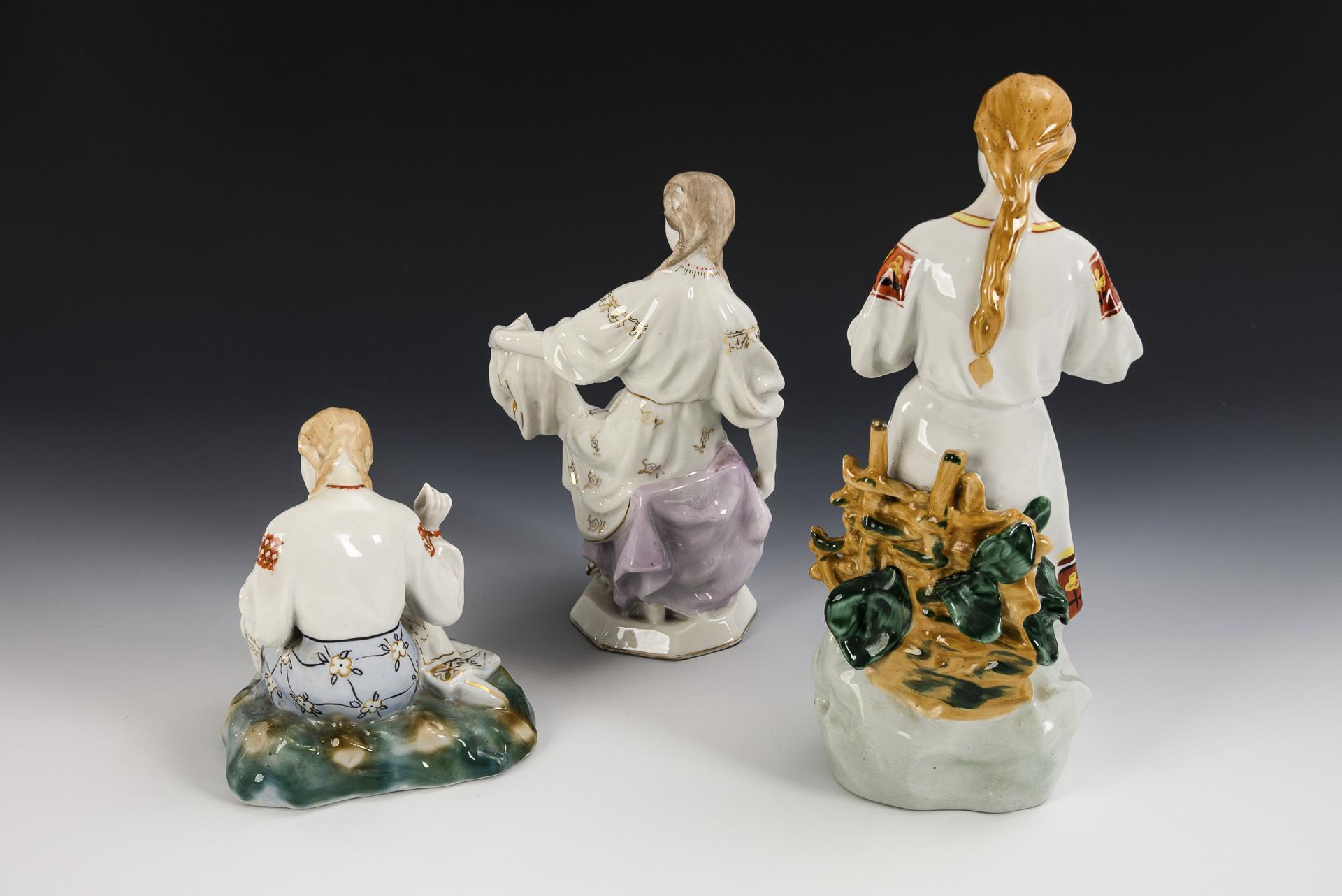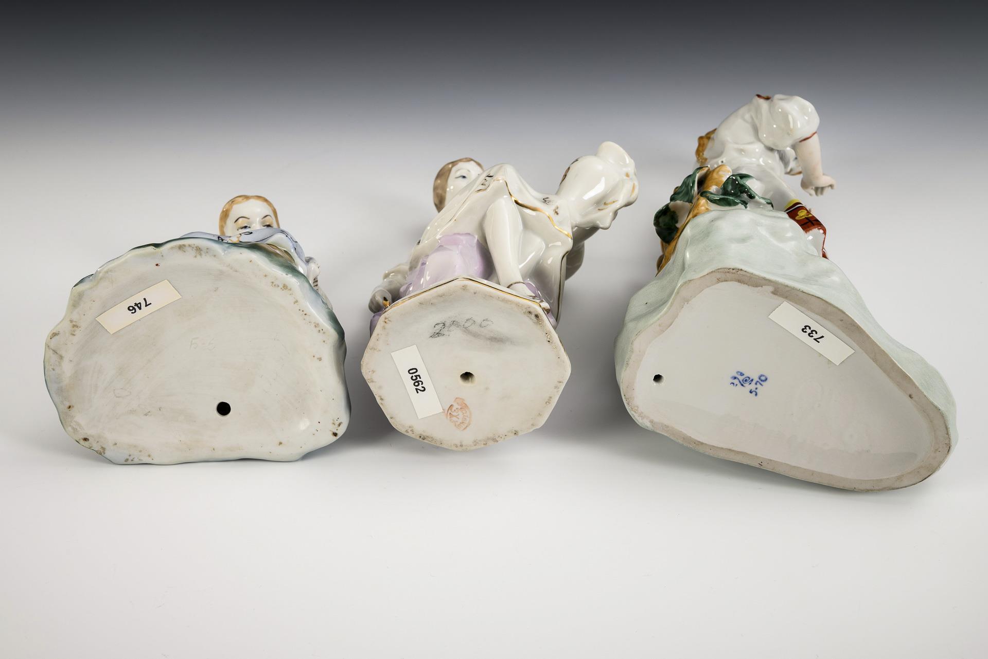 Mädchen mit Blüte (H 29,5 cm), Mädchen mit Krug (H 23 cm) und nähendes Mädchen (H 14,5 cm). Partieller Goldabrieb, 1x Hals restauriert.