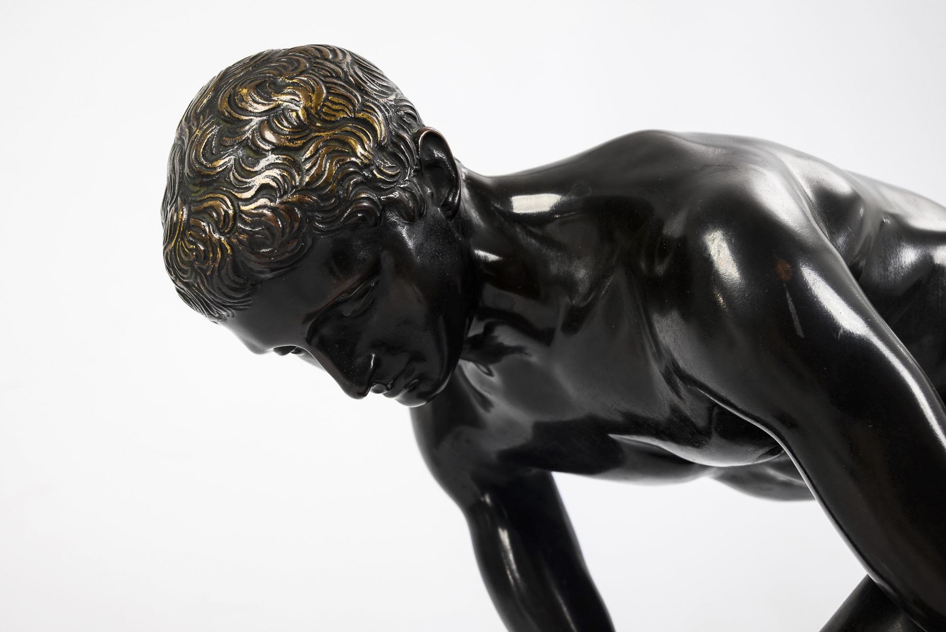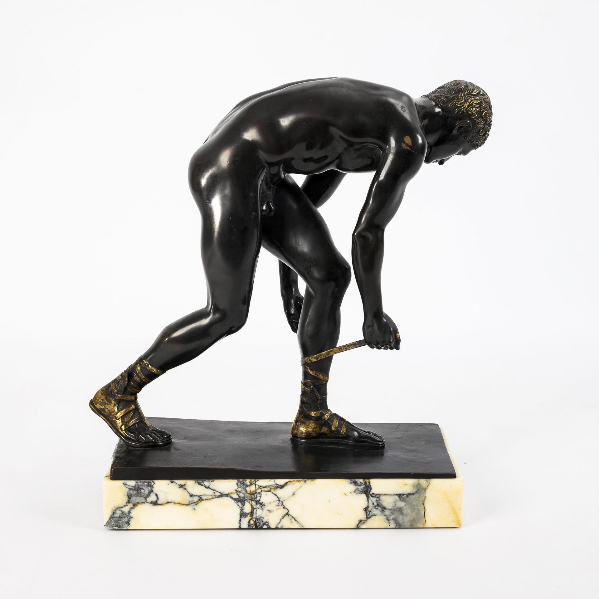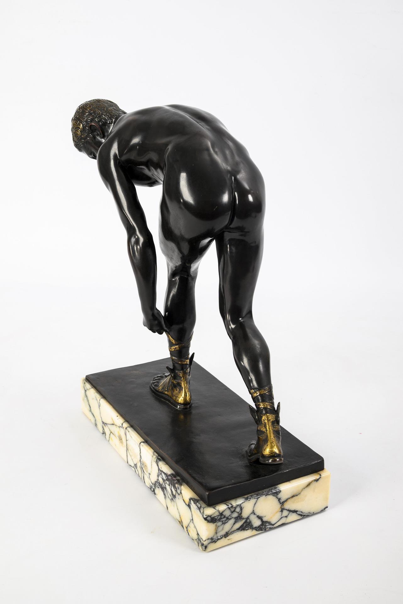 Gleichsam im Lauf seine geflügelten Sandalen bindender Götterbote. Patina teils stark berieben, entfernte Plakette am Marmor.