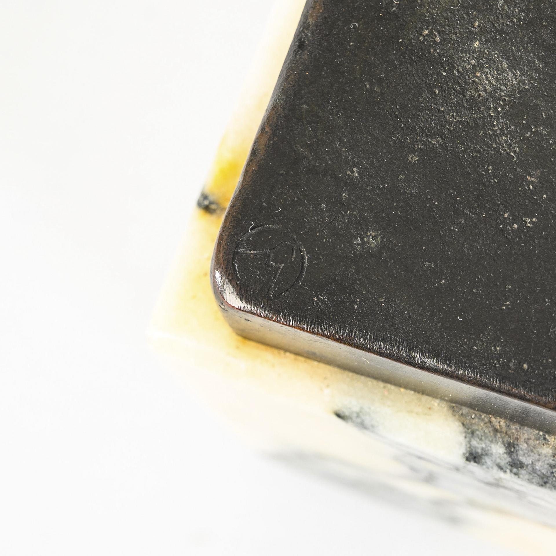 Bronze patiniert und teils goldfarben belassen, helle Marmor-Plinthe. Bezeichnet, Gießermarke (Monogramm CM?). H 37 cm, gesamt 42 x 41 x 16 cm. 20,6 kg.