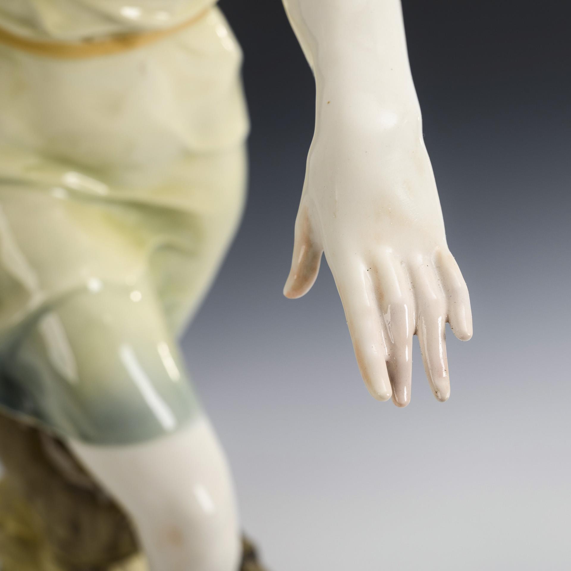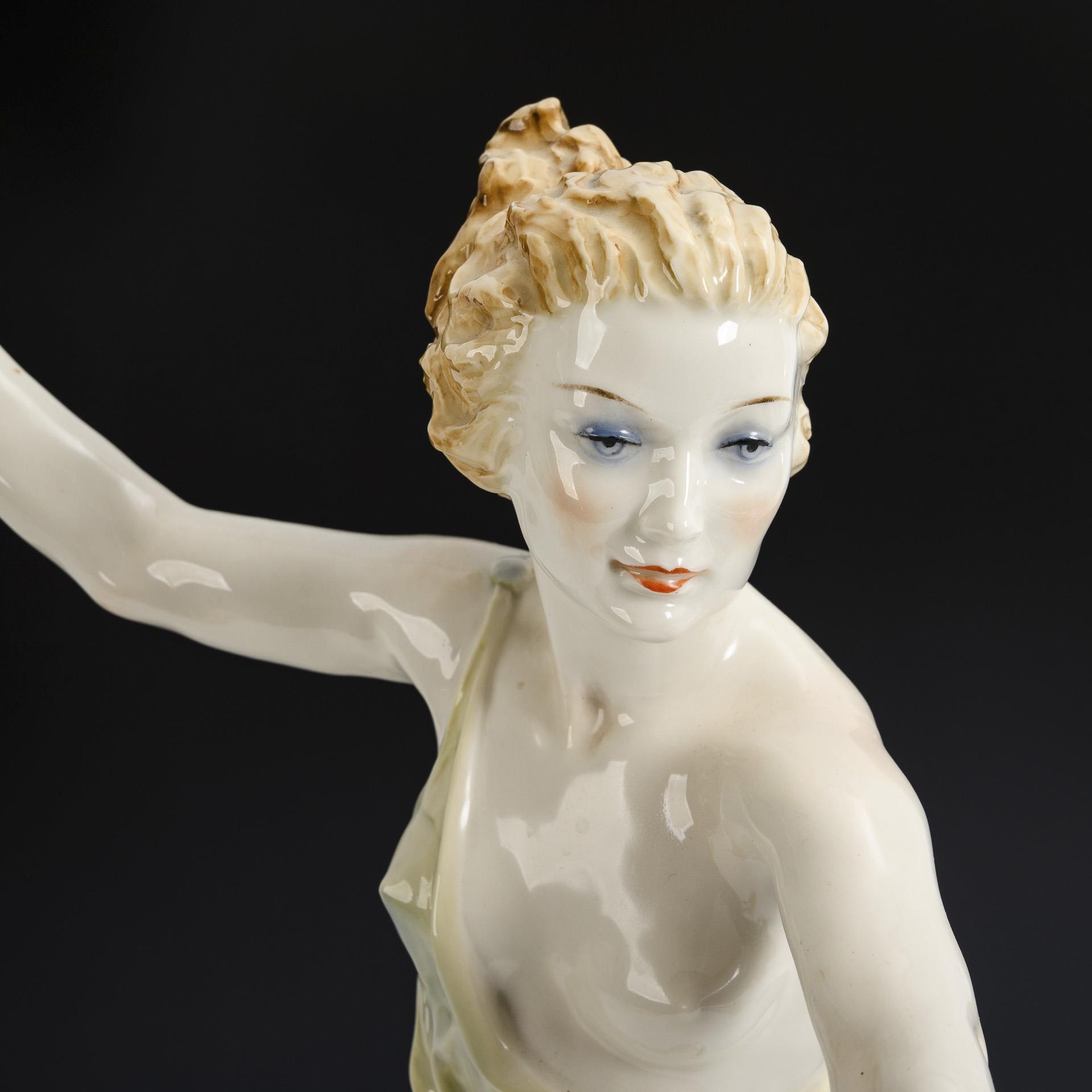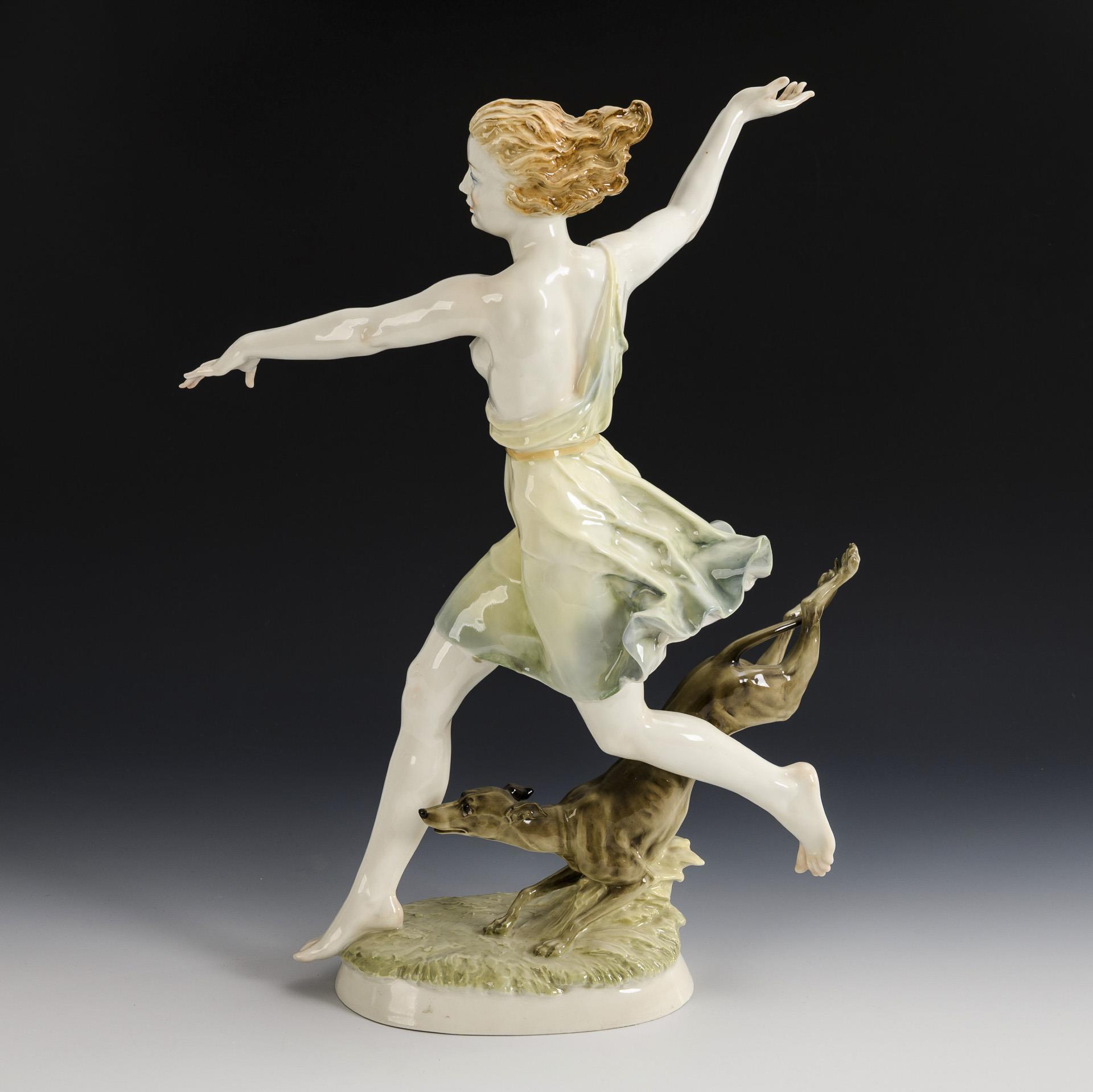 Große Plastik einer gemeinsam mit einem Windhund laufenden jungen Frau mit entblößter Brust. Linke Hand und linker Armansatz sowie rechter Fuß restauriert.