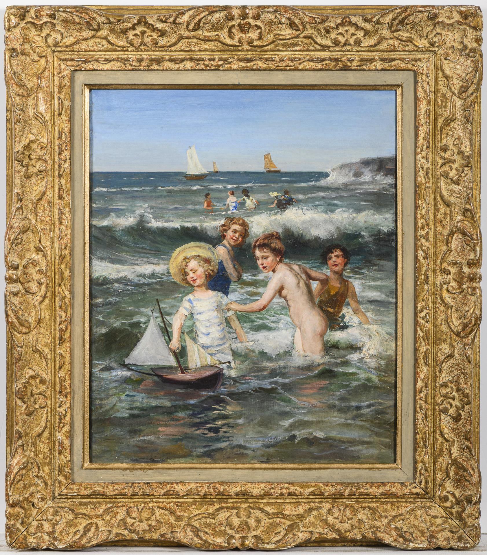 Die Kinder im Meer beim Spielen mit einem Segelschiff im Sonnenschein. Leichte Altersspuren.