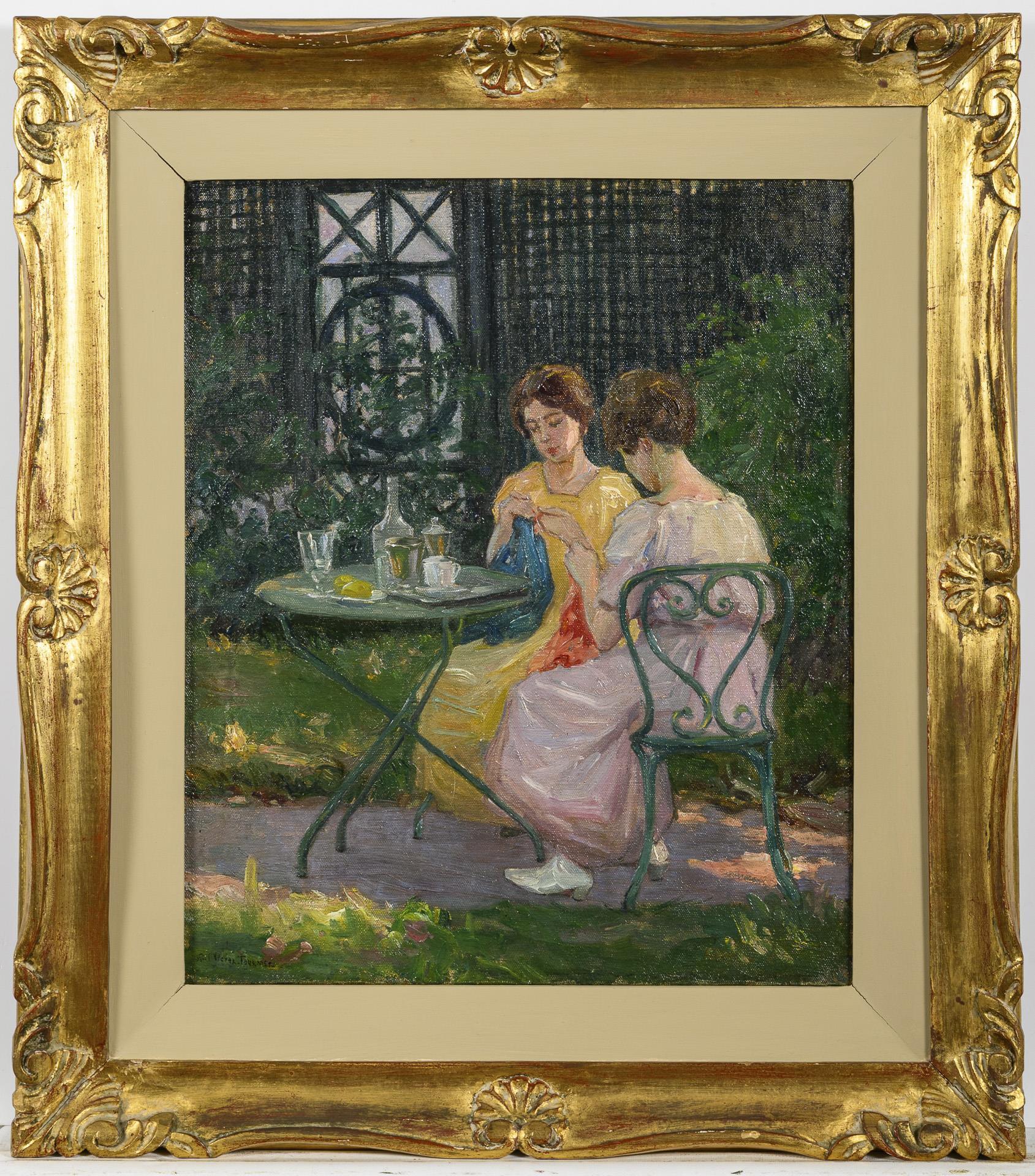 Zwei Frauen am Gartentisch beim Nähen im Schatten des Hauses.