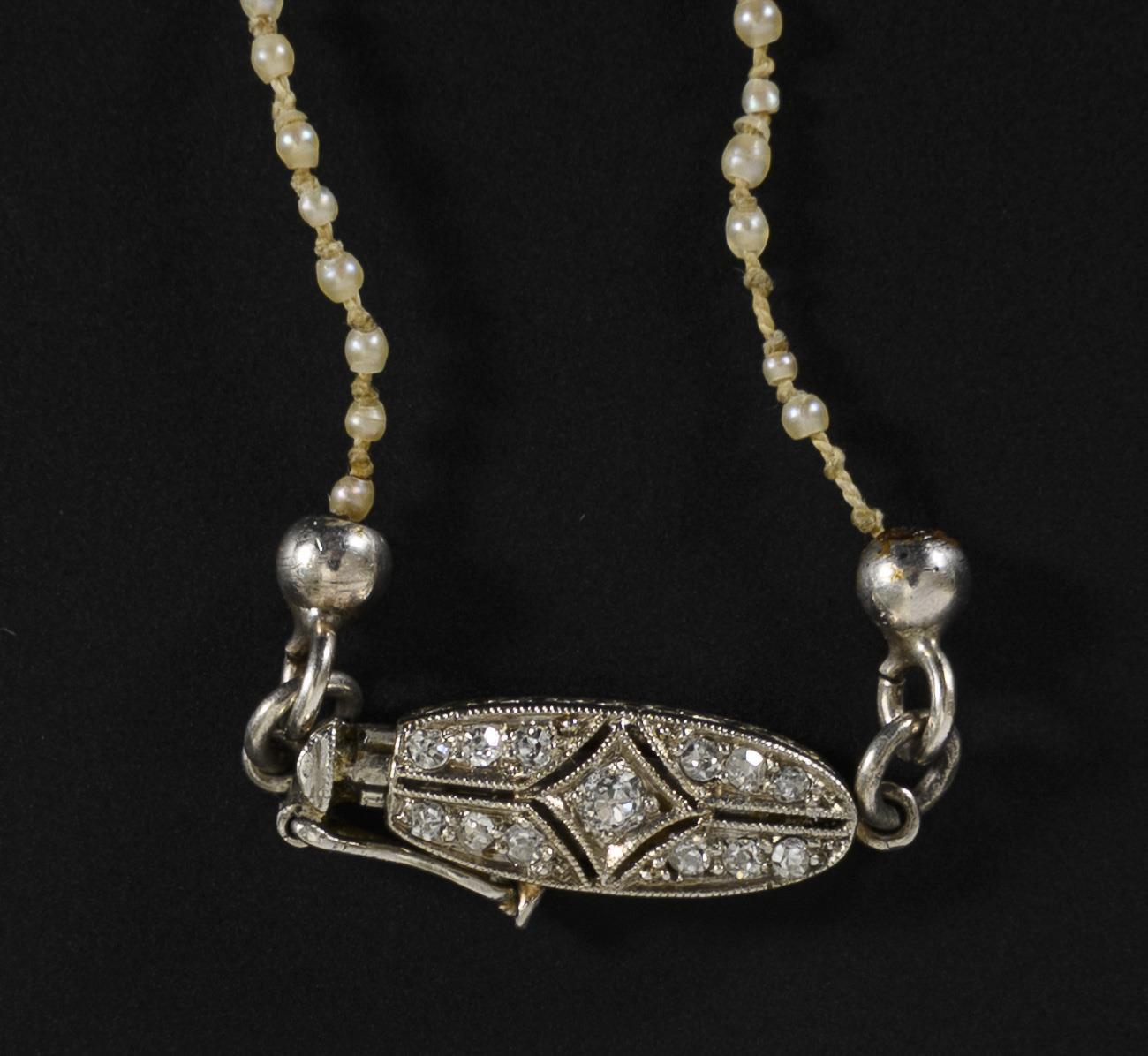 Antike, einzeln geknotete Perlenkette mit natürlichen Perlen im Verlauf. Die mit Diamanten ausgefasste Weißgold-Schließe mit einfacher Achtersicherung. Perlseide gelockert und mit Spur einer früheren Reparatur: Erneuerung empfehlenswert, 2 kleine Perlen fehlen, eine gebrochen.