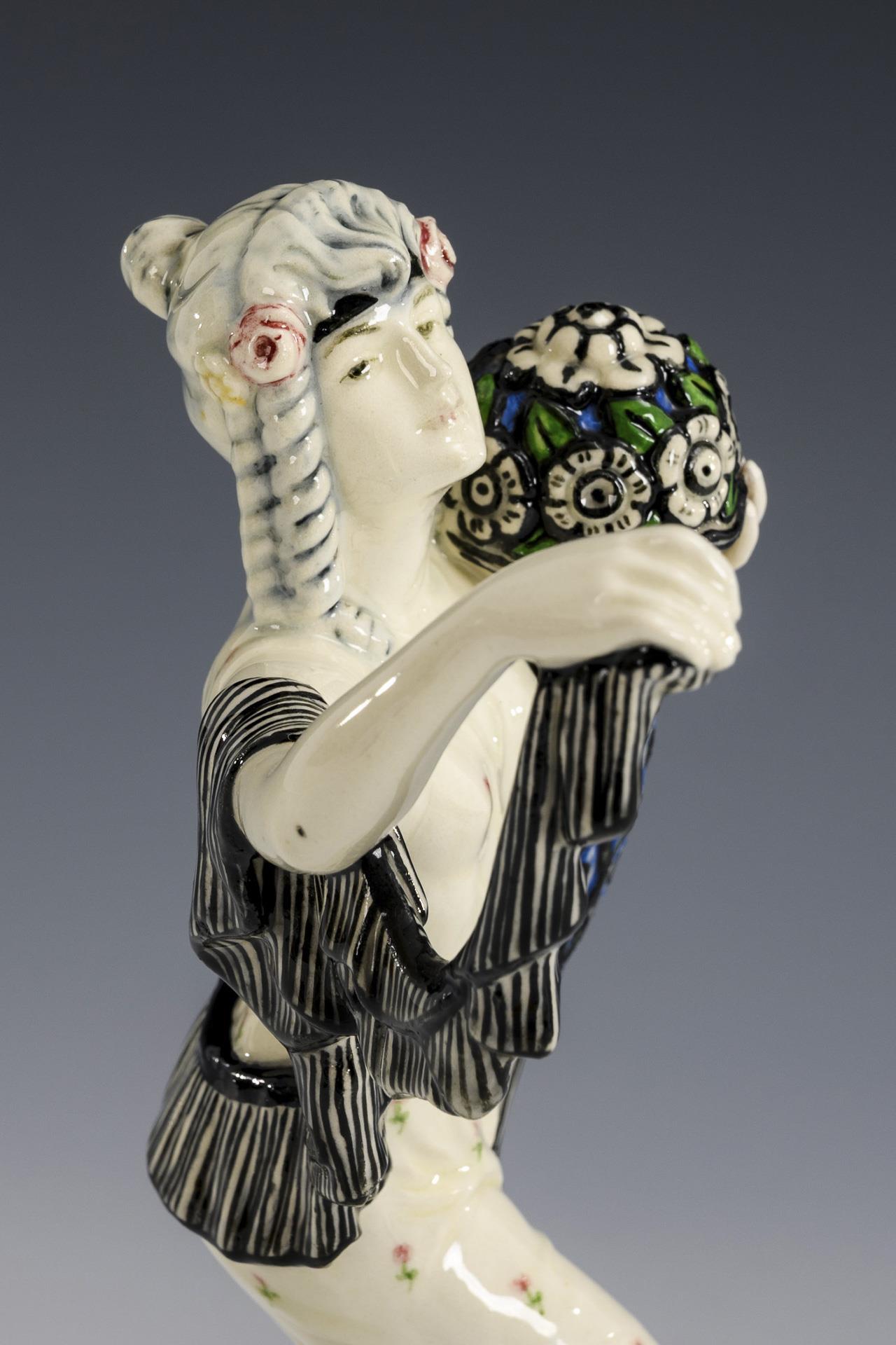 Stehende Dame mit einem Blumen gefüllten Füllhorn, auf kanneliertem Rundsockel. Linke Finger restauriert, Hals leicht brandrissig.