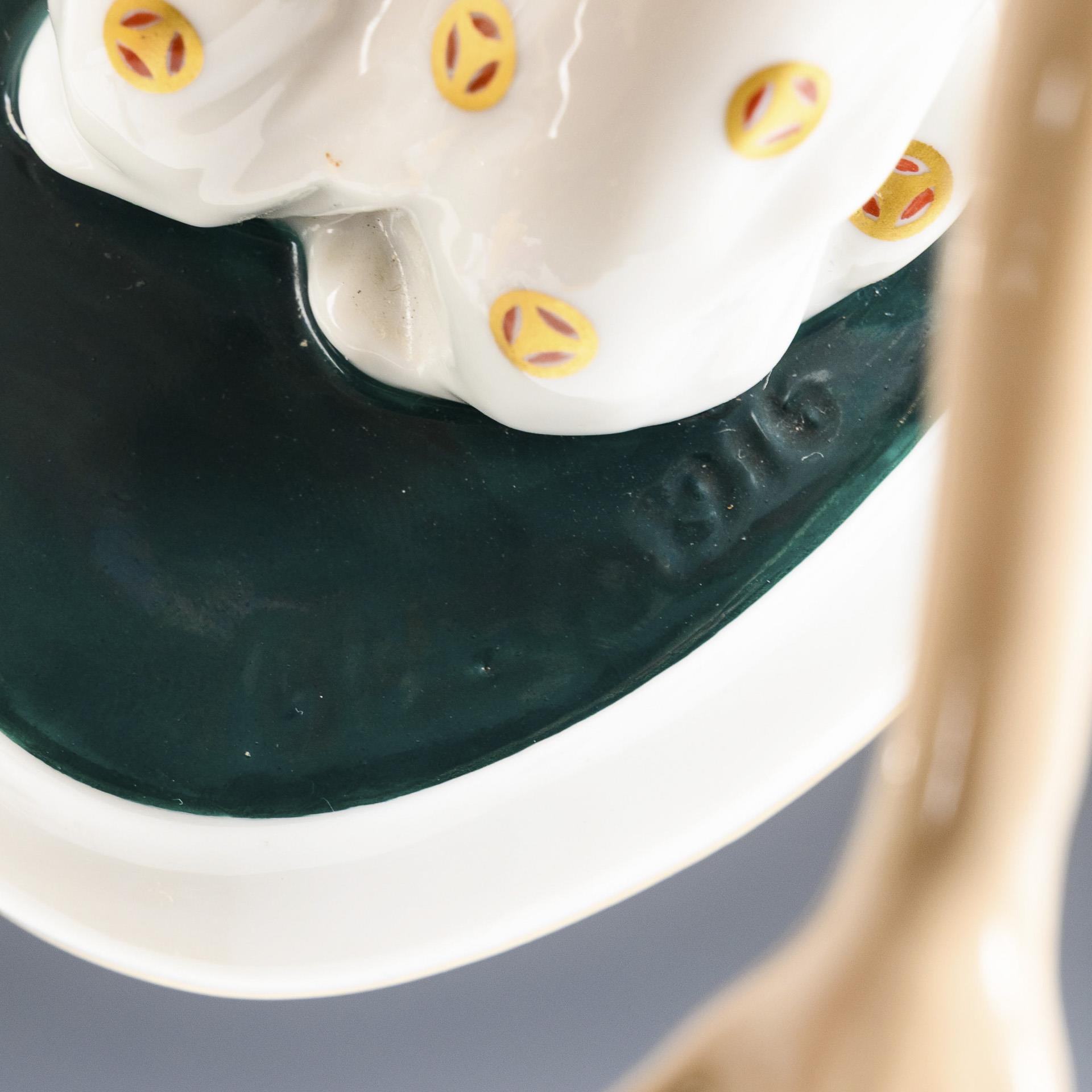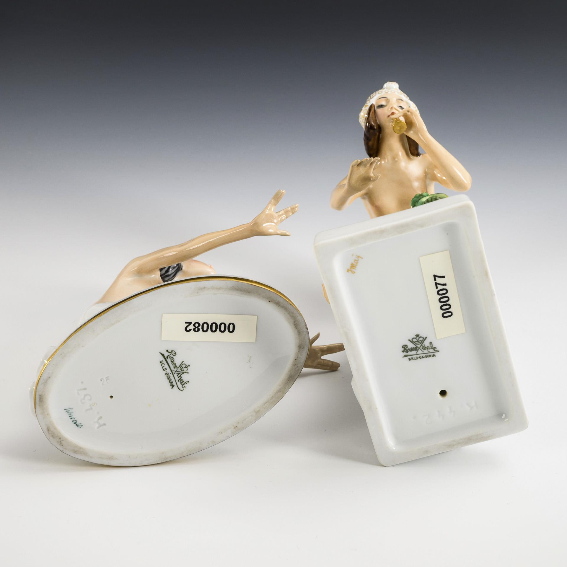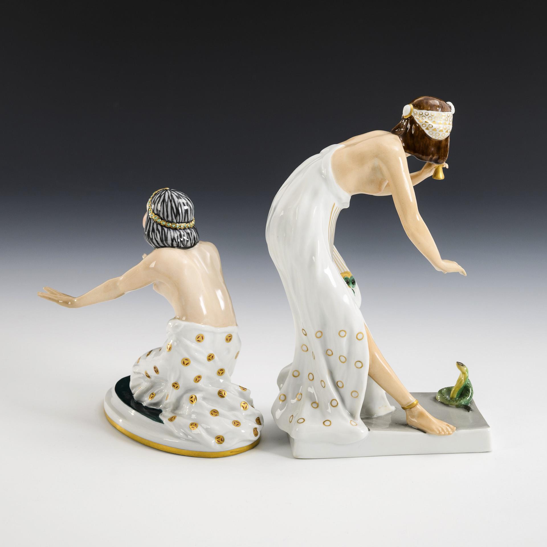 1x Modell-Nr. K 442: Auf einer Rechteckplinthe vor einer "tanzenden" Schlange eine Flöte spielende junge Frau (H 19 cm). / 1x Modell-Nr. K 437: Auf einer Ovalplinthe kniender Halbakt einer jungen, die Arme ausstreckenden Frau (H 14 cm). 1x beide Arme und 1x rechter Arm und Schlange restauriert.