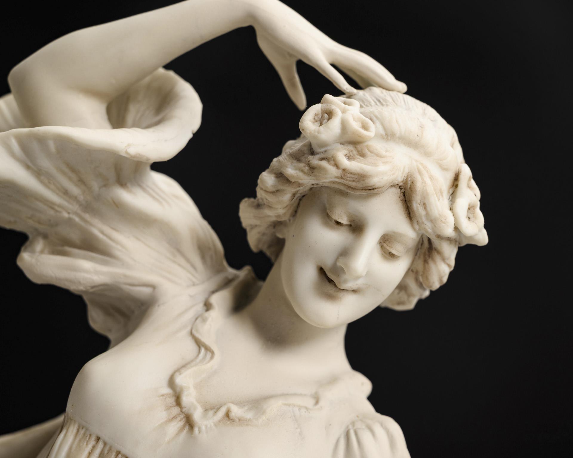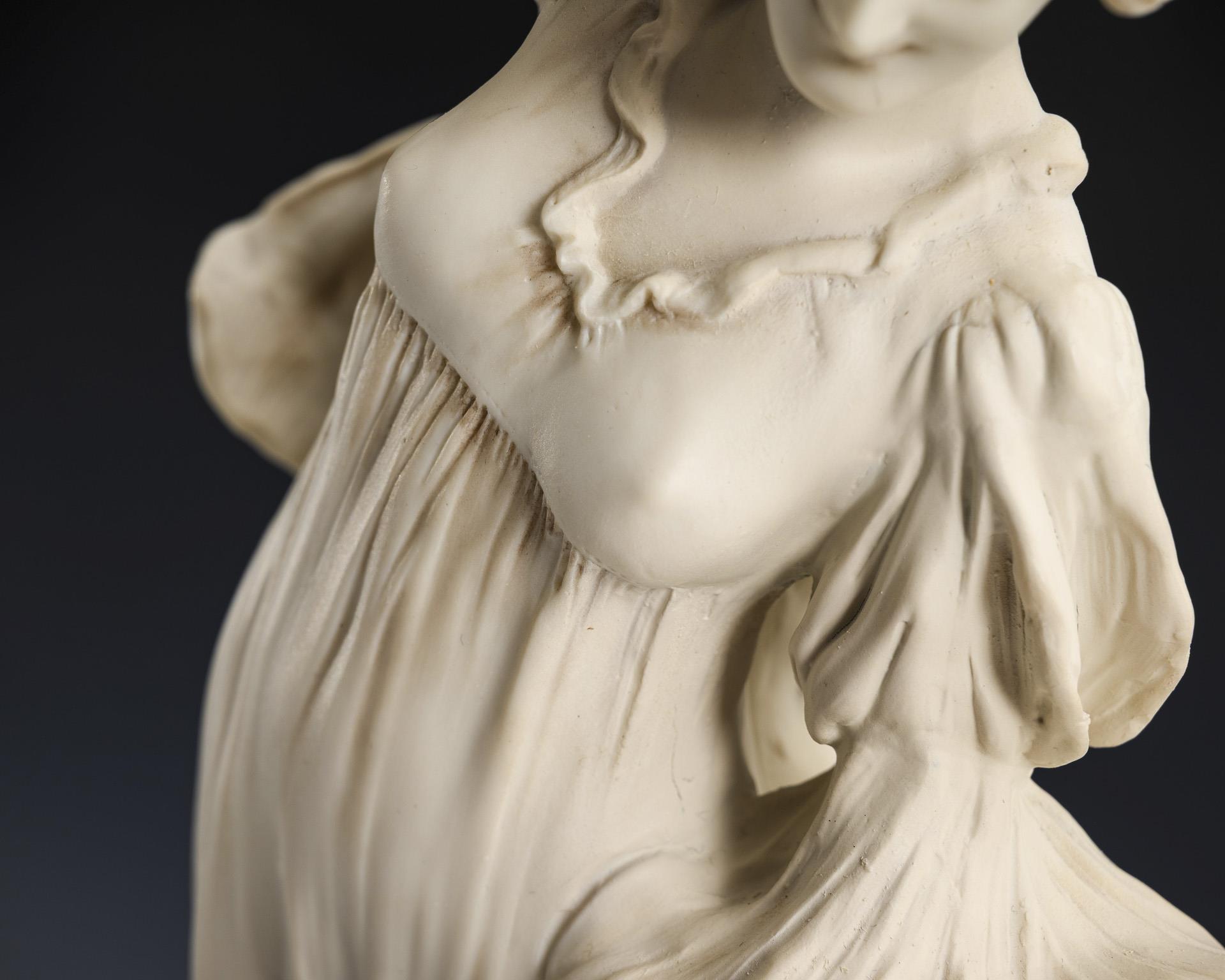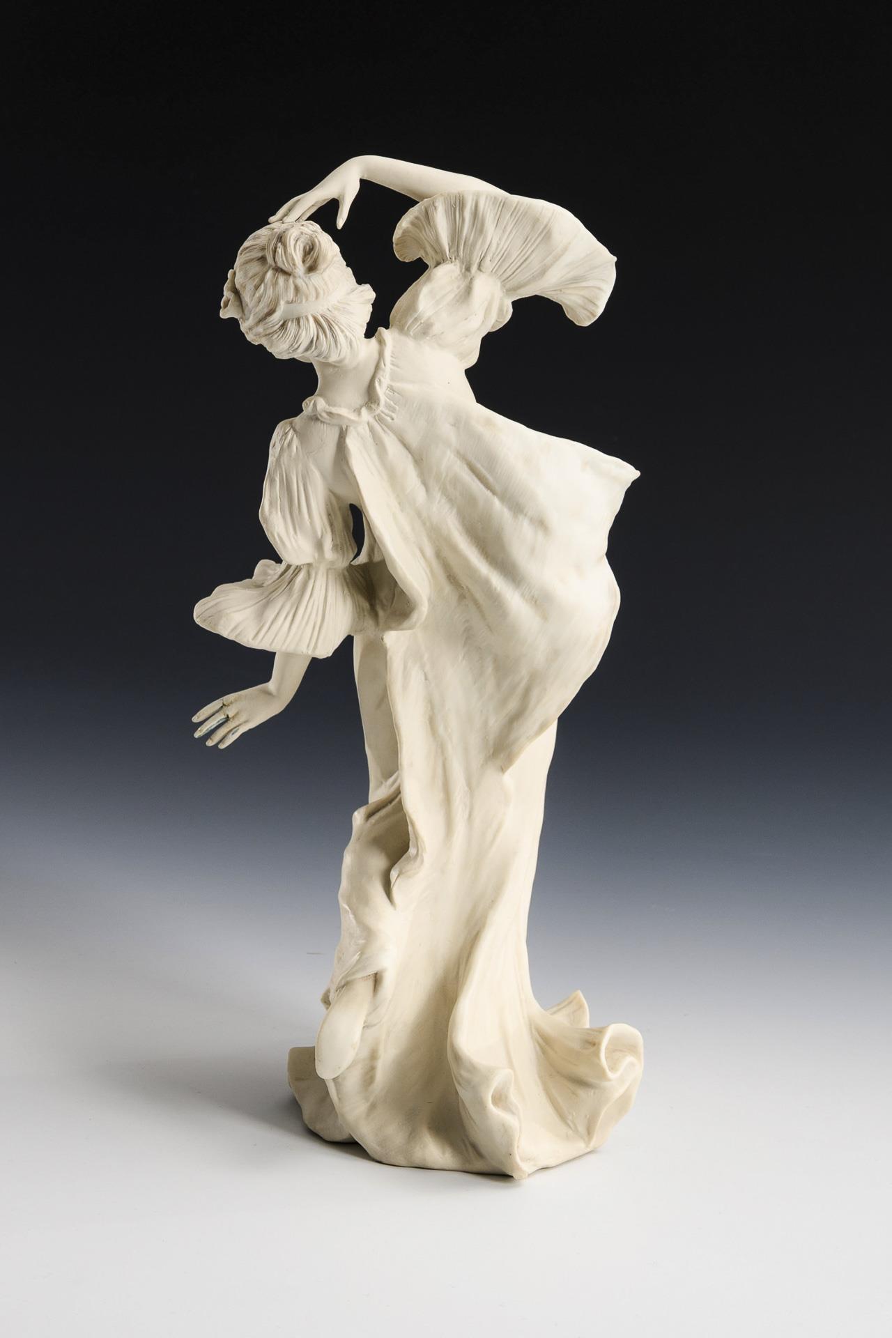 Ausdrucksvolle junge Tänzerin im fließend-schwingendem, faltenreichem Kleid. Plastik nach dem Vorbild des um 1898/1900 für die Porzellanmanufaktur Sèvres von Leónhard Agathon van Weydevelt (1841 Lille - 1923 Paris) entworfenen Tafelaufsatzes "Schärpenspiel" ("Le Jeu de l'echarpe"). Partiell restauriert.