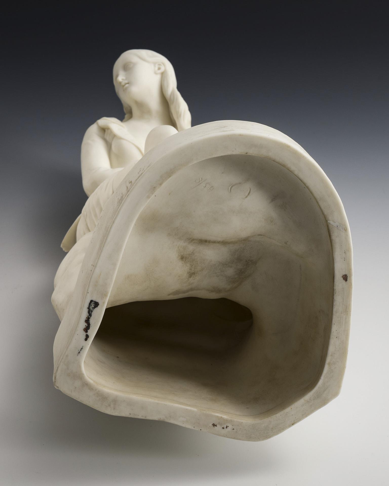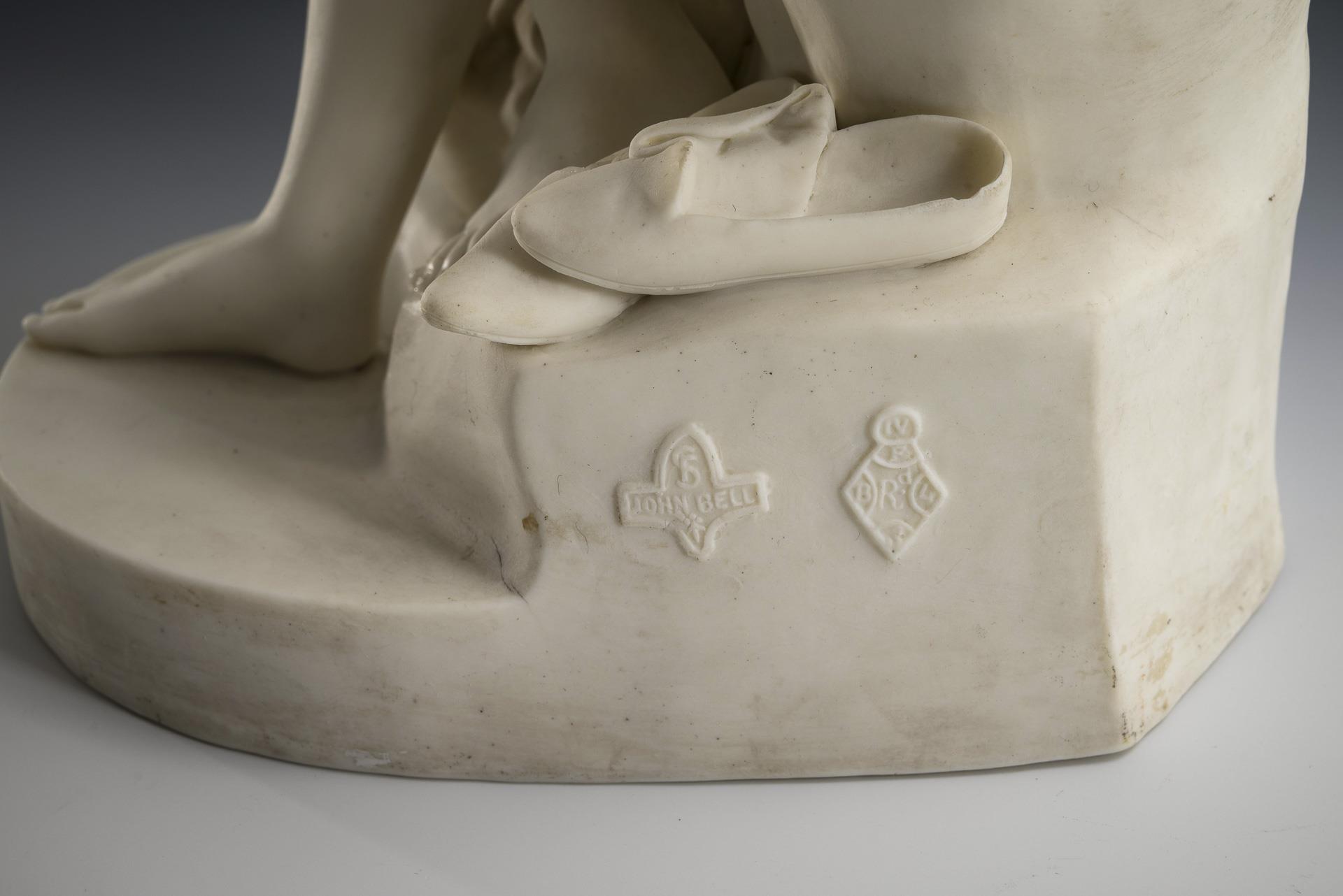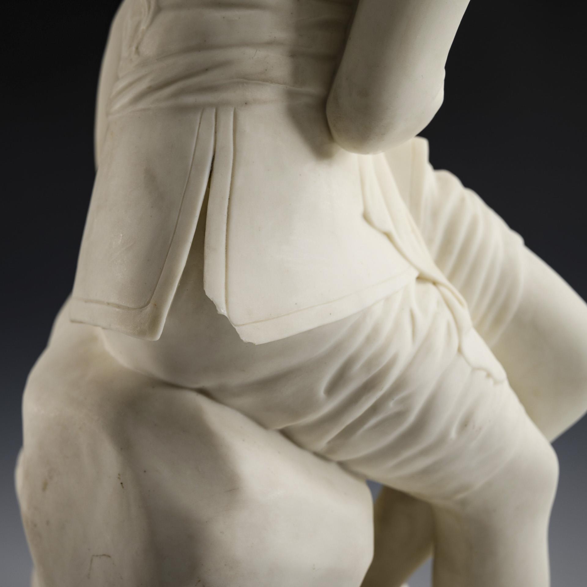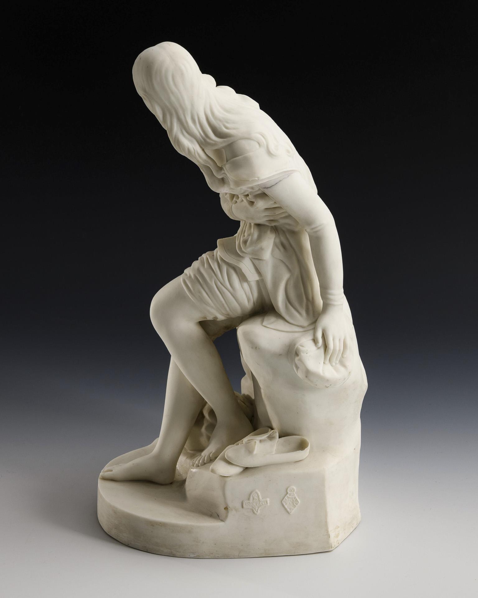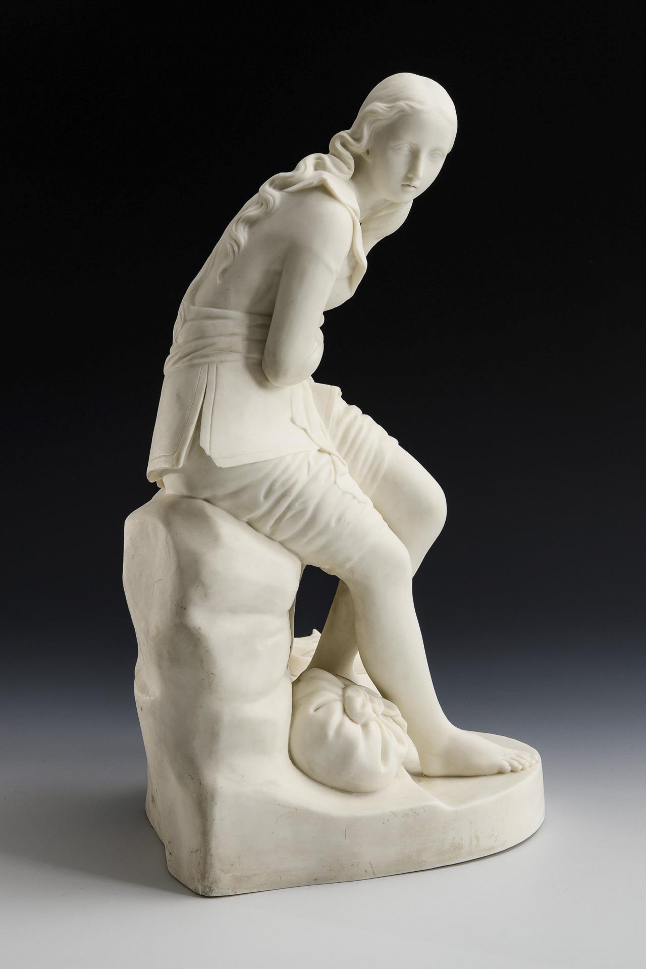 Parian Ware. Auf einem Steinsockel sitzende junge, männlich gekleidete Frau, zu ihren Füßen ein Paar Schuhe sowie ein Bündel liegend. Nach einer Statue des englischen Bildhauers John Bell (1811-1895), der die Skulptur 1844 nach der Figur der Dorothea aus Miguel de Servantes' Roman "Don Quijote" schuf. 2 Bestoßungen am Kragensaum, 1 Ecke der Jacke bestoßen.