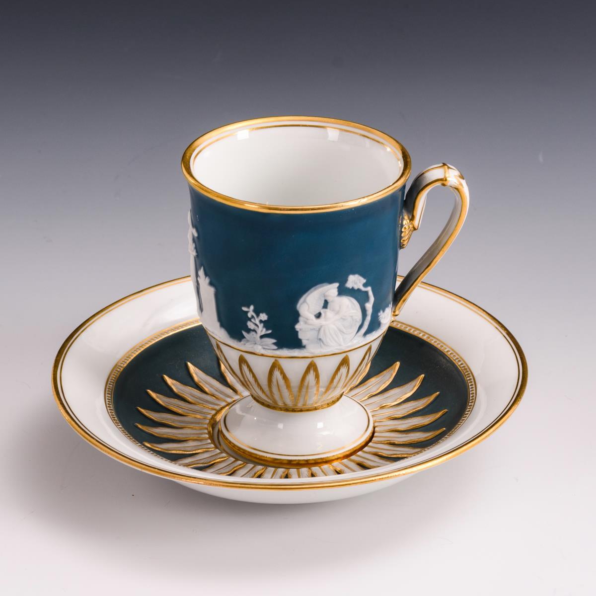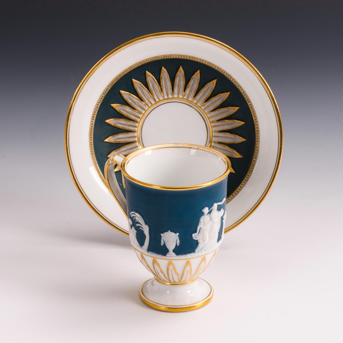 Gefußte Glockentasse mit reliefierten Lanzettblättern und umlaufendem, antikisierendem Biskuit-Figurenrelief. Minimale Goldretusche am Mündungsrand der Tasse.