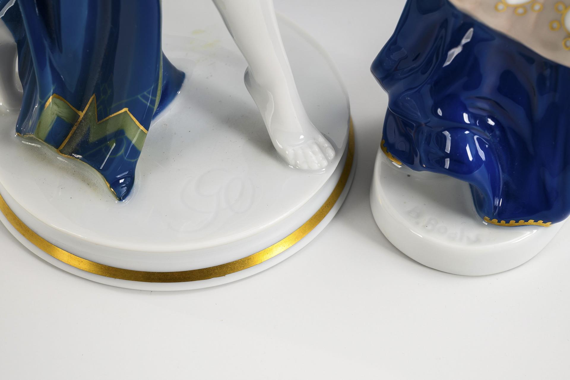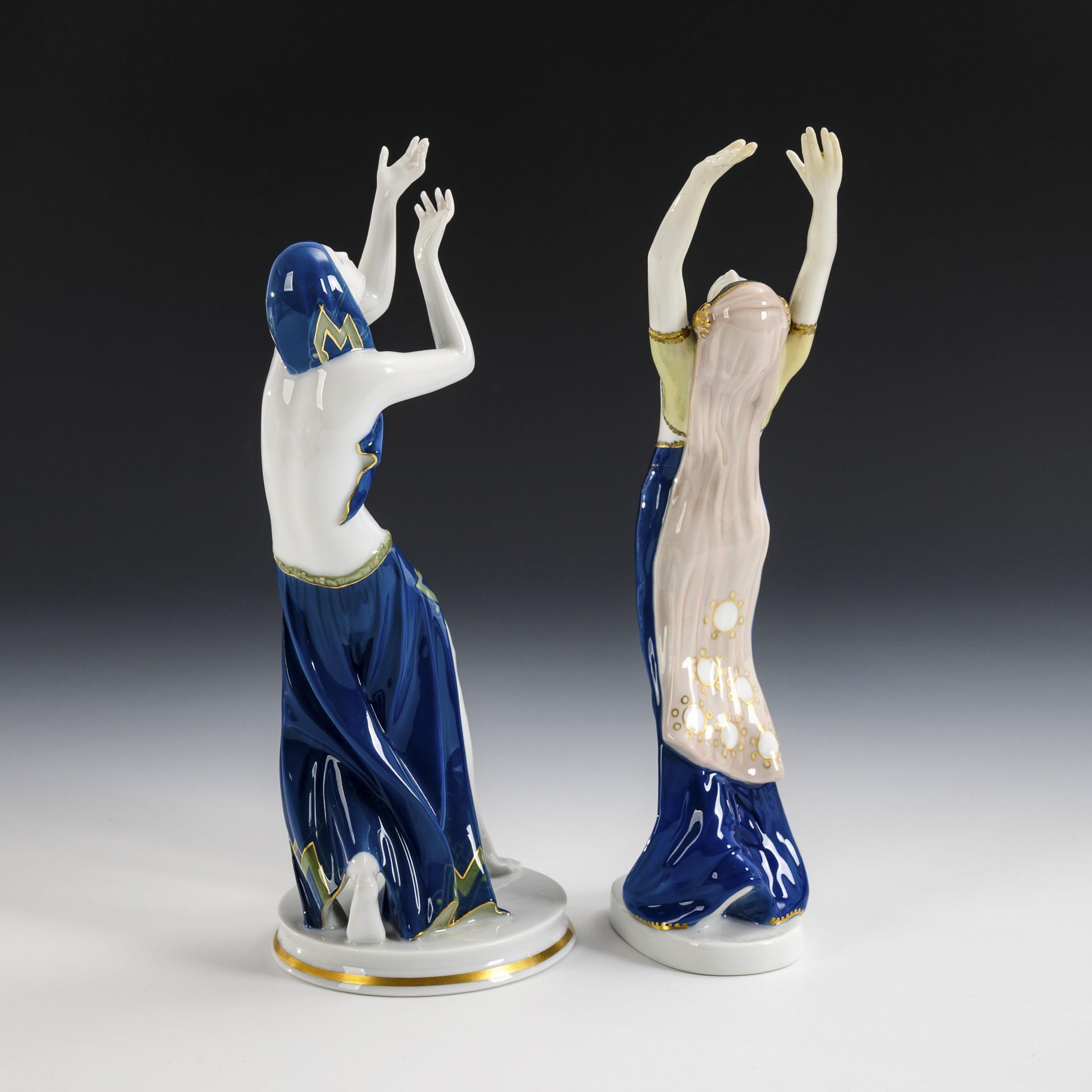 1x "Nubische Tänzerin", Modell-Nr. K 358, Entwurf 1914 von Berthold Boeß (1877-1957): auf ovaler Plinthe stehende Ausdruckstänzerin im langen Rock und Schleier. / 1x "Gebetstänzerin", Modell-Nr. 961, Entwurf 1927 von Gustav Oppel (1891-1978): orientalisch gekleidete Tänzerin in ausdrucksvoller Pose, die Hände erhebend, auf Rundplinthe. 1x beide Arme restauriert.