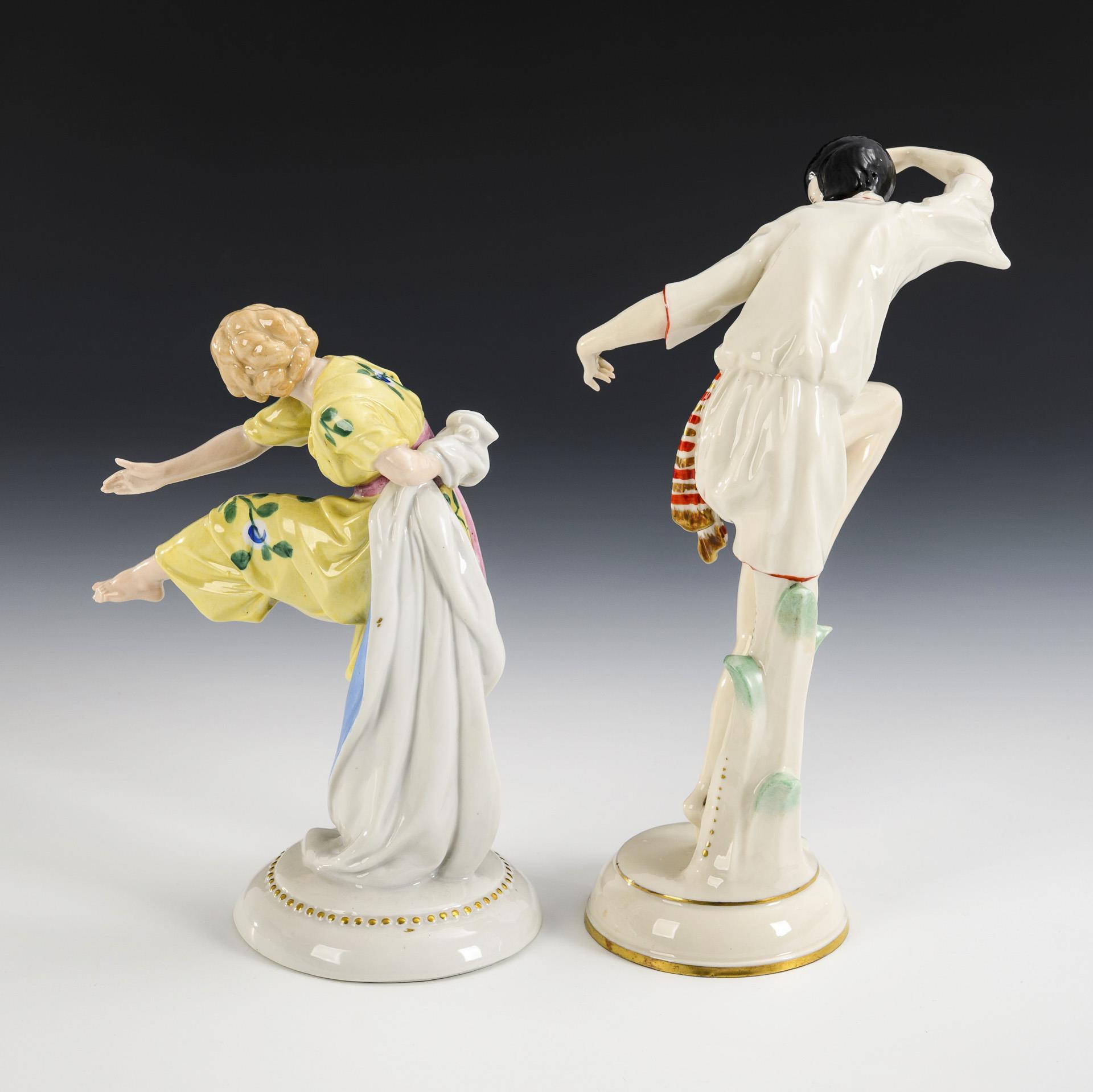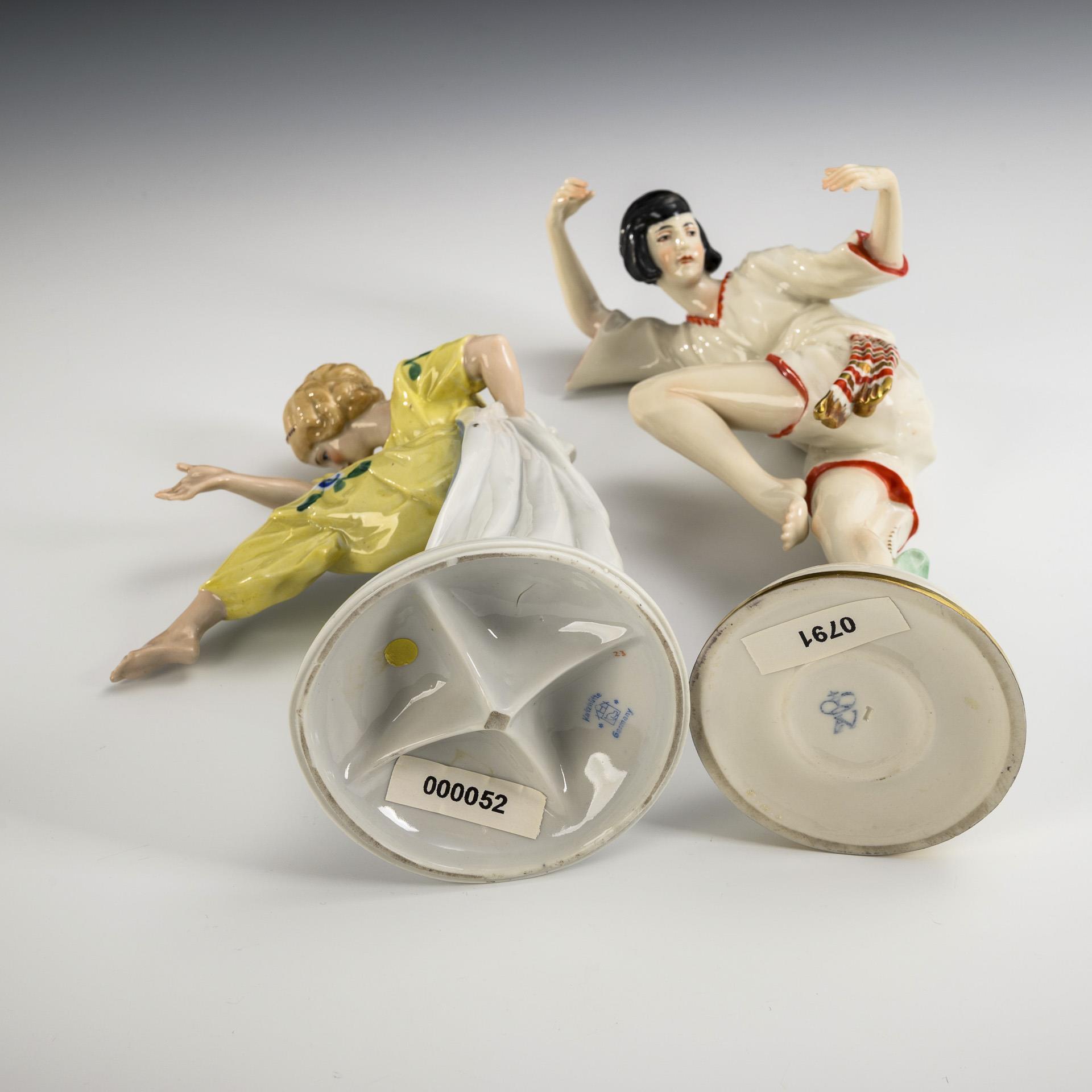 1x HERTWIG & CO., KATZHÜTTE: auf einem Rundsockel stehende Tänzerin. / 1x AELTESTE VOLKSTEDTER: auf einem Rundsockel an einer Pflanze stehende Tänzerin in ausdrucksvoller Pose.