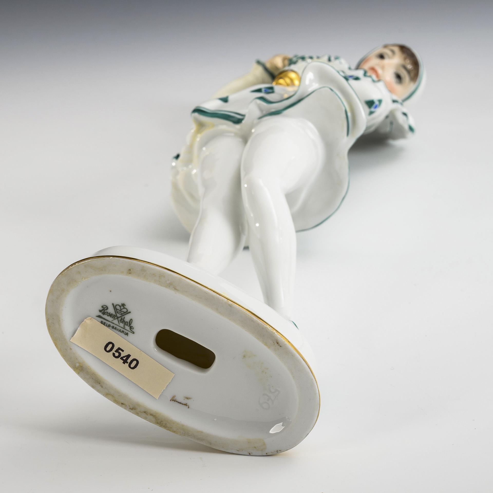 Auf einem ovalen Sockel stehende Tänzerin im Kostüm einer Pierrette, eine goldene Kugel mit der linken Hand haltend. Rechter Arm restauriert.