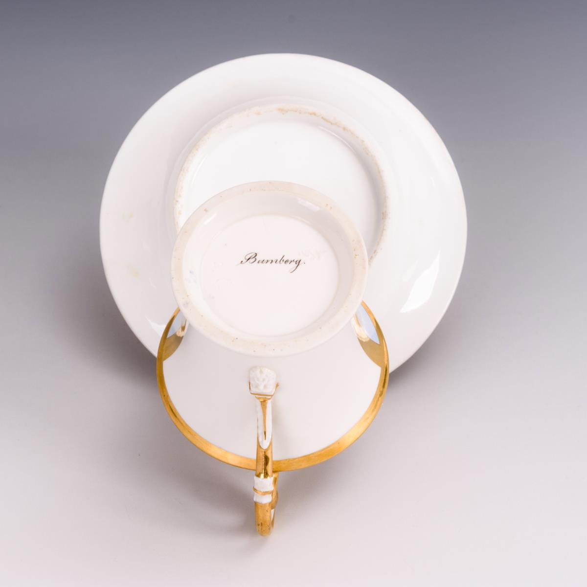 Polychrom bemalt, goldstaffiert. H Tasse 9 cm, Ø ergänzte Untertasse 13 cm.