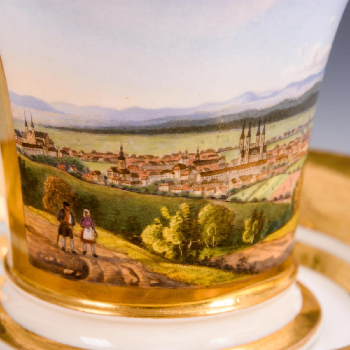 Kratertasse mit Maskaronhenkel. Schauseitig eine Rechteckkartusche mit der unterseitig bezeichneten Ansicht der Stadt Bamberg. Haarriss am oberen Henkelansatz.