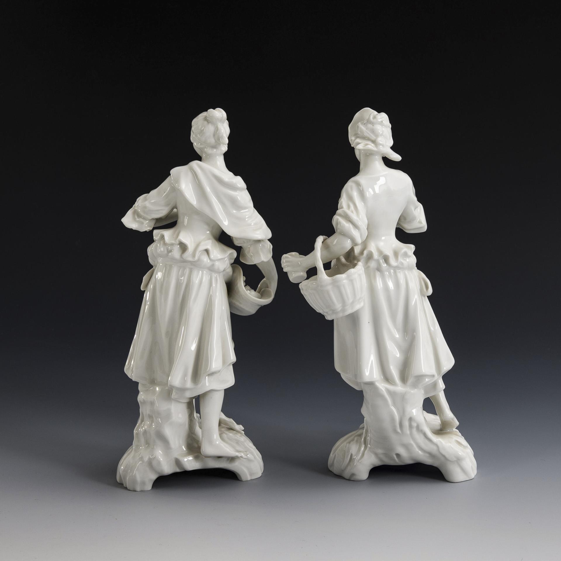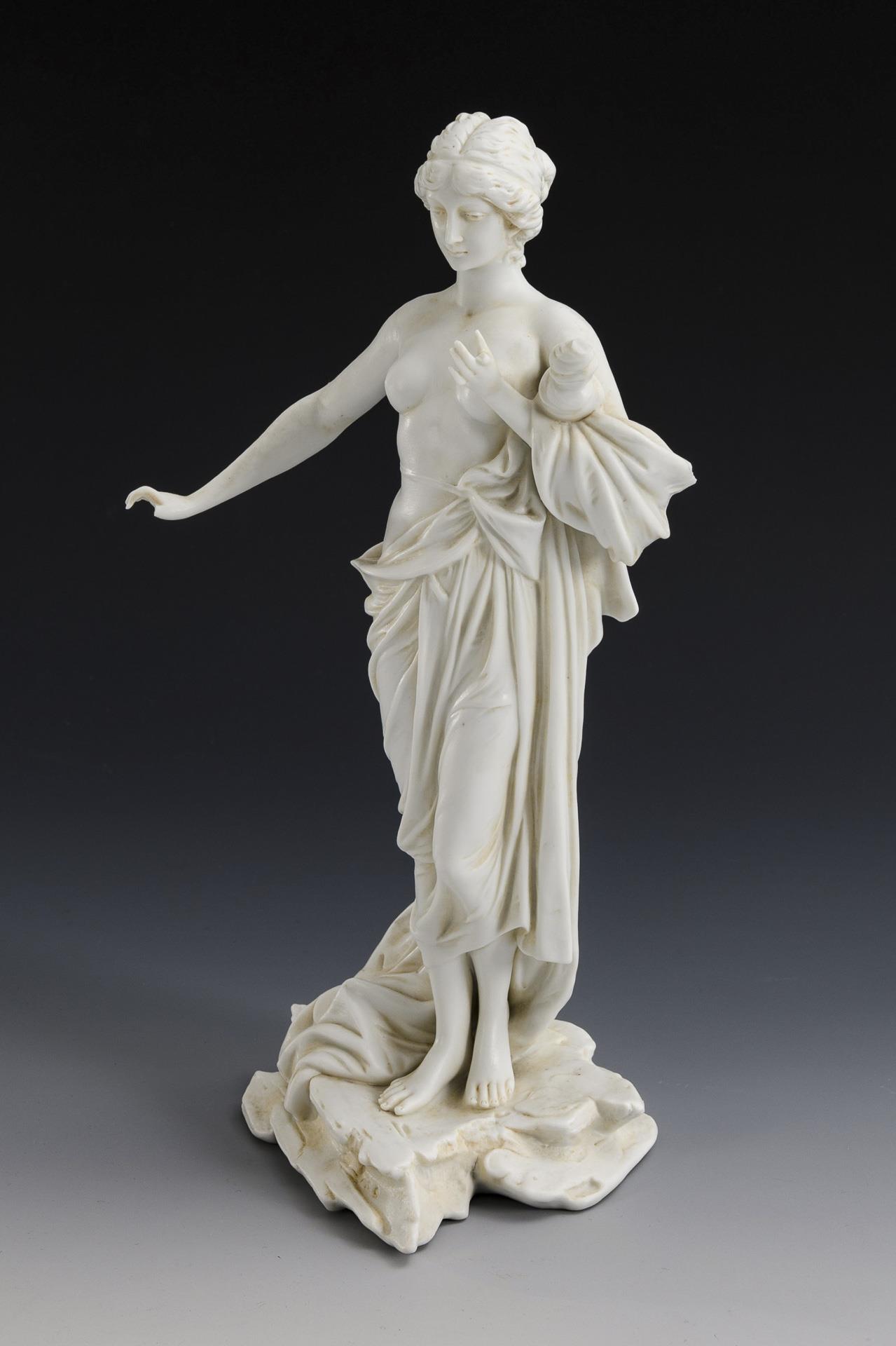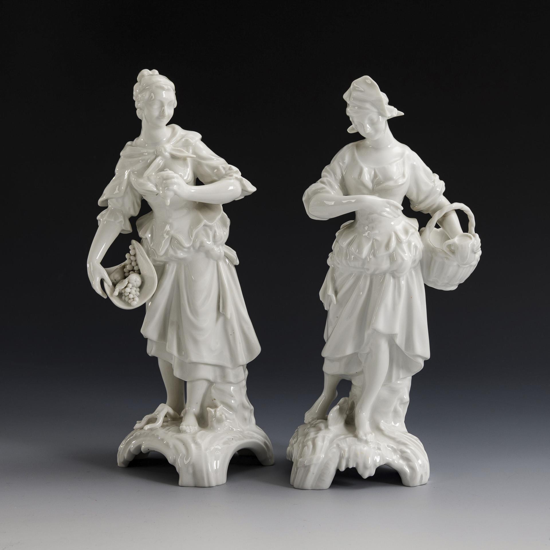 2x KPM BERLIN, Entwurf um 1764 von Friedrich Elias Meyer, aus einer Folge der vier Elemente : Schäferin mit Früchten und Schäferin mit Wasserkrug (H 20,5 und 21 cm). / 1x SCHEIBE-ALSBACH, Modell-Nr. 3220: auf einem Felssockel stehender Halbakt einer jungen Frau mit Spindel (H 28 cm). 2 Finger bestoßen.