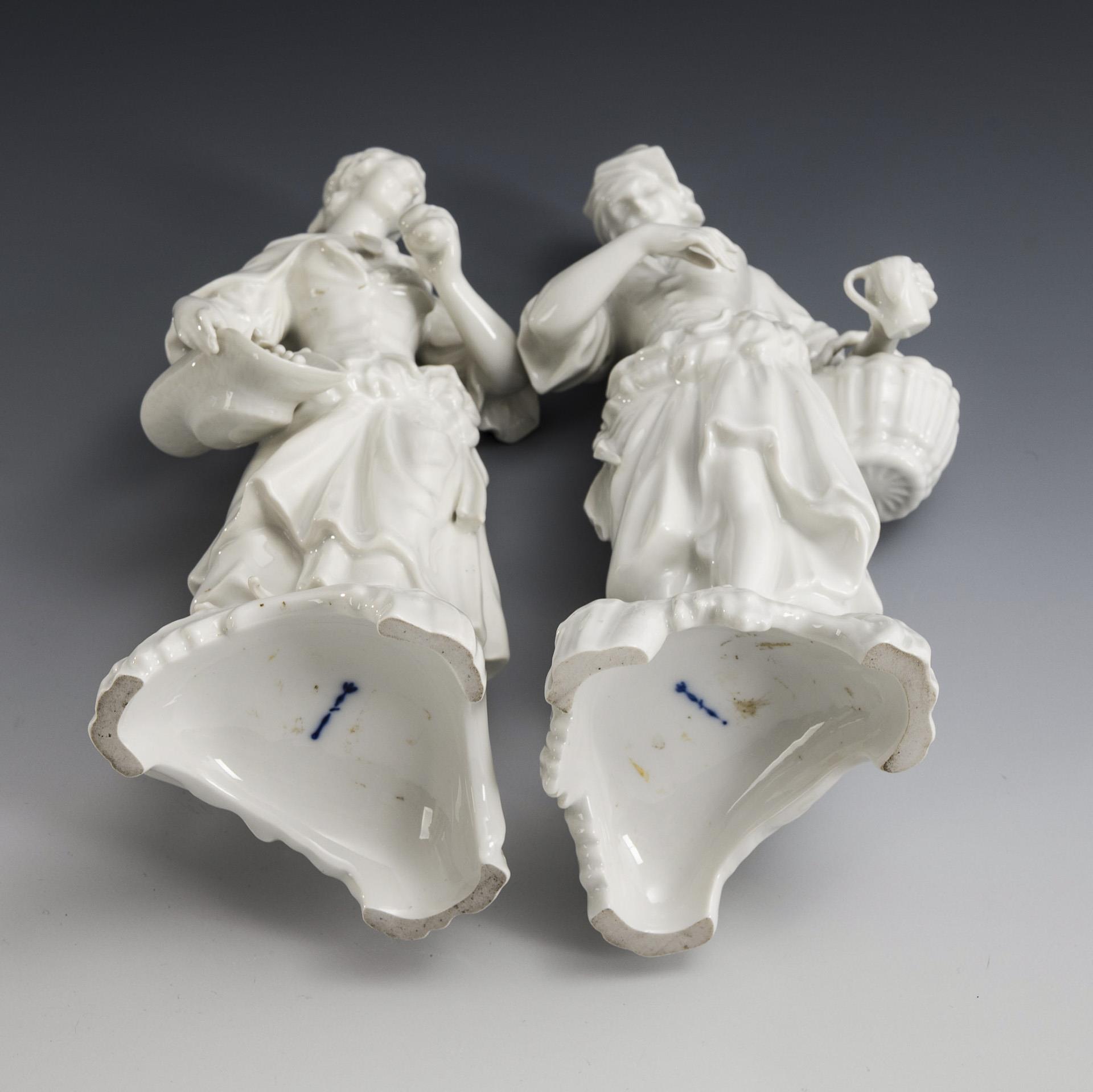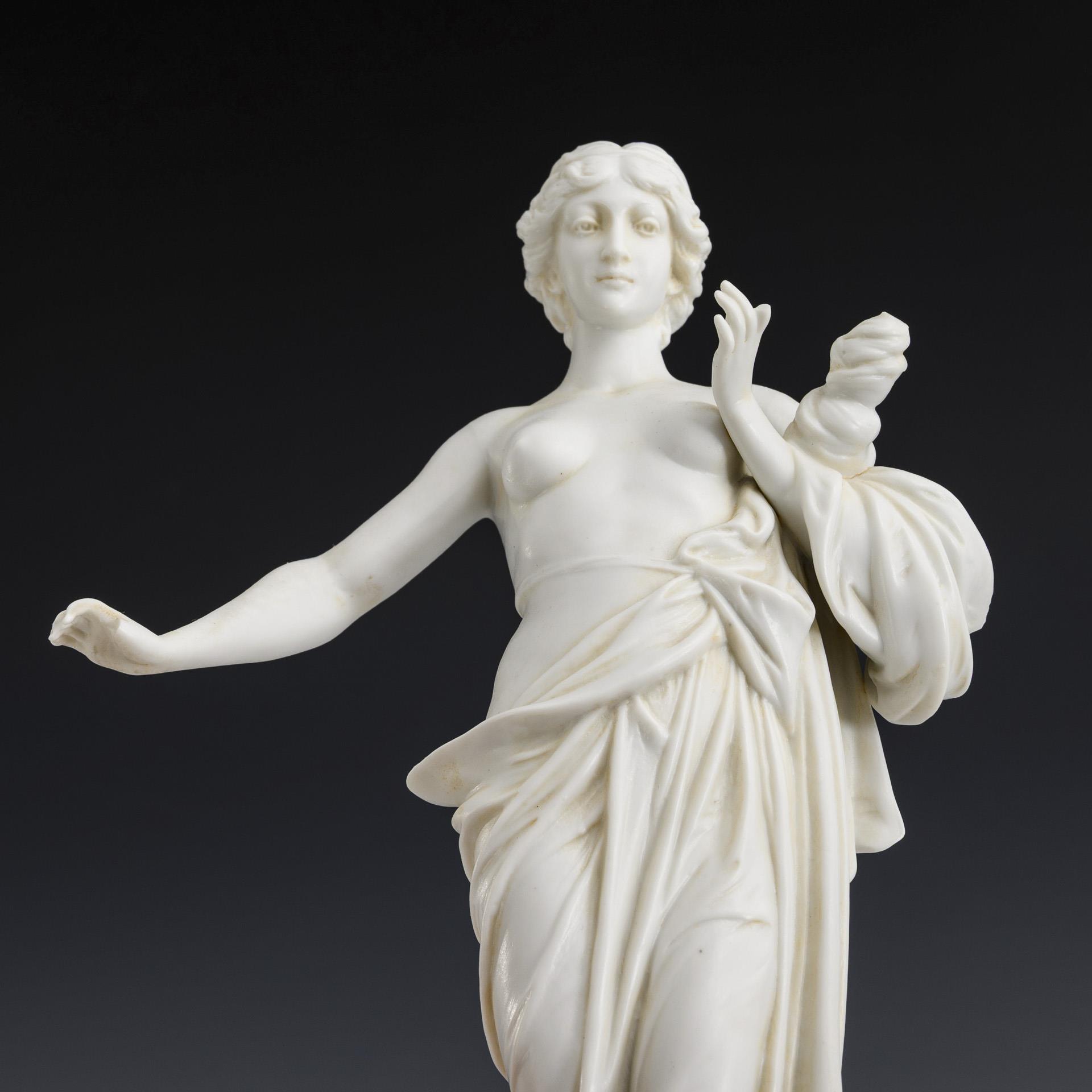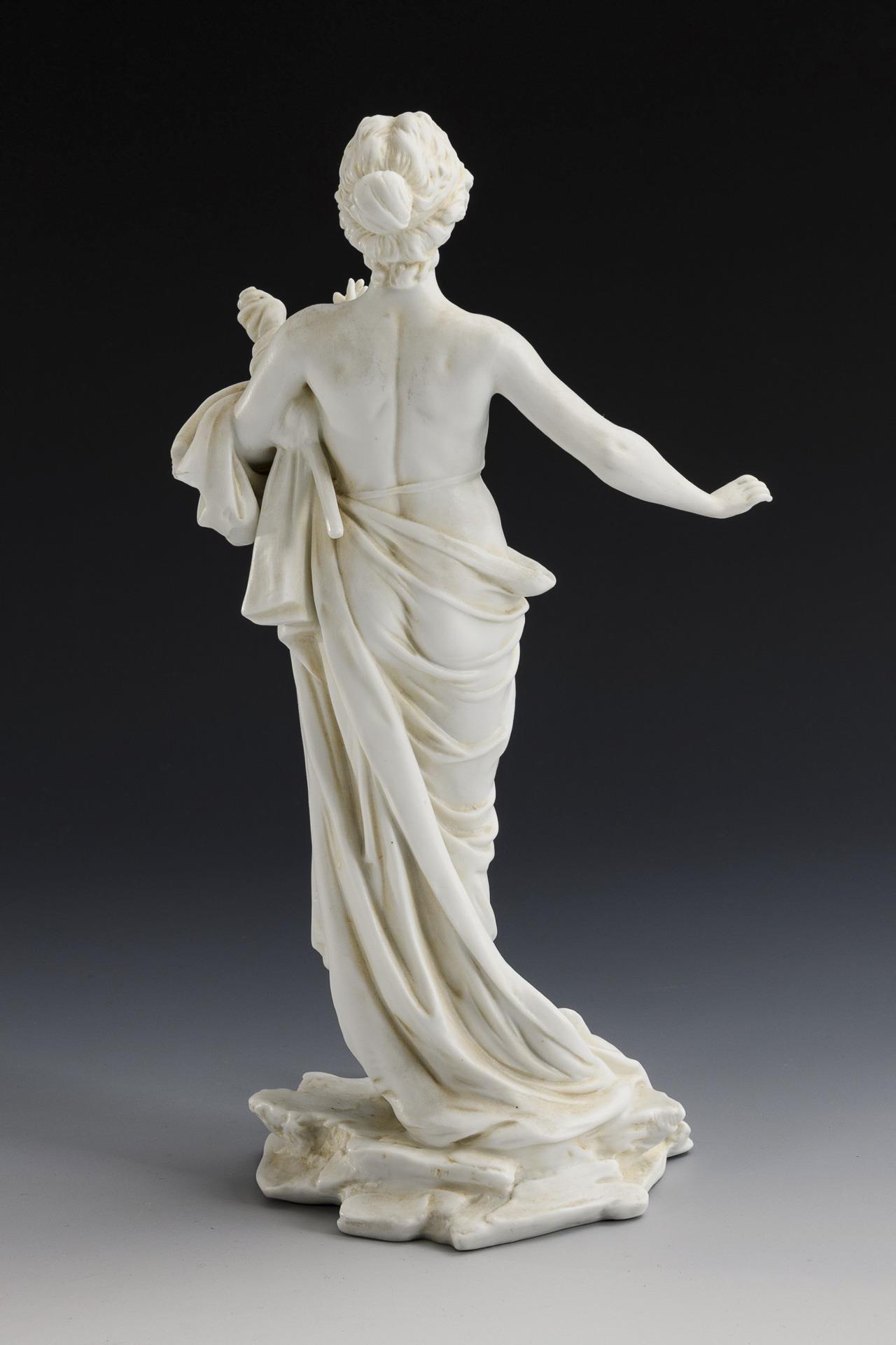 2x KPM BERLIN, Entwurf um 1764 von Friedrich Elias Meyer, aus einer Folge der vier Elemente : Schäferin mit Früchten und Schäferin mit Wasserkrug (H 20,5 und 21 cm). / 1x SCHEIBE-ALSBACH, Modell-Nr. 3220: auf einem Felssockel stehender Halbakt einer jungen Frau mit Spindel (H 28 cm). 2 Finger bestoßen.