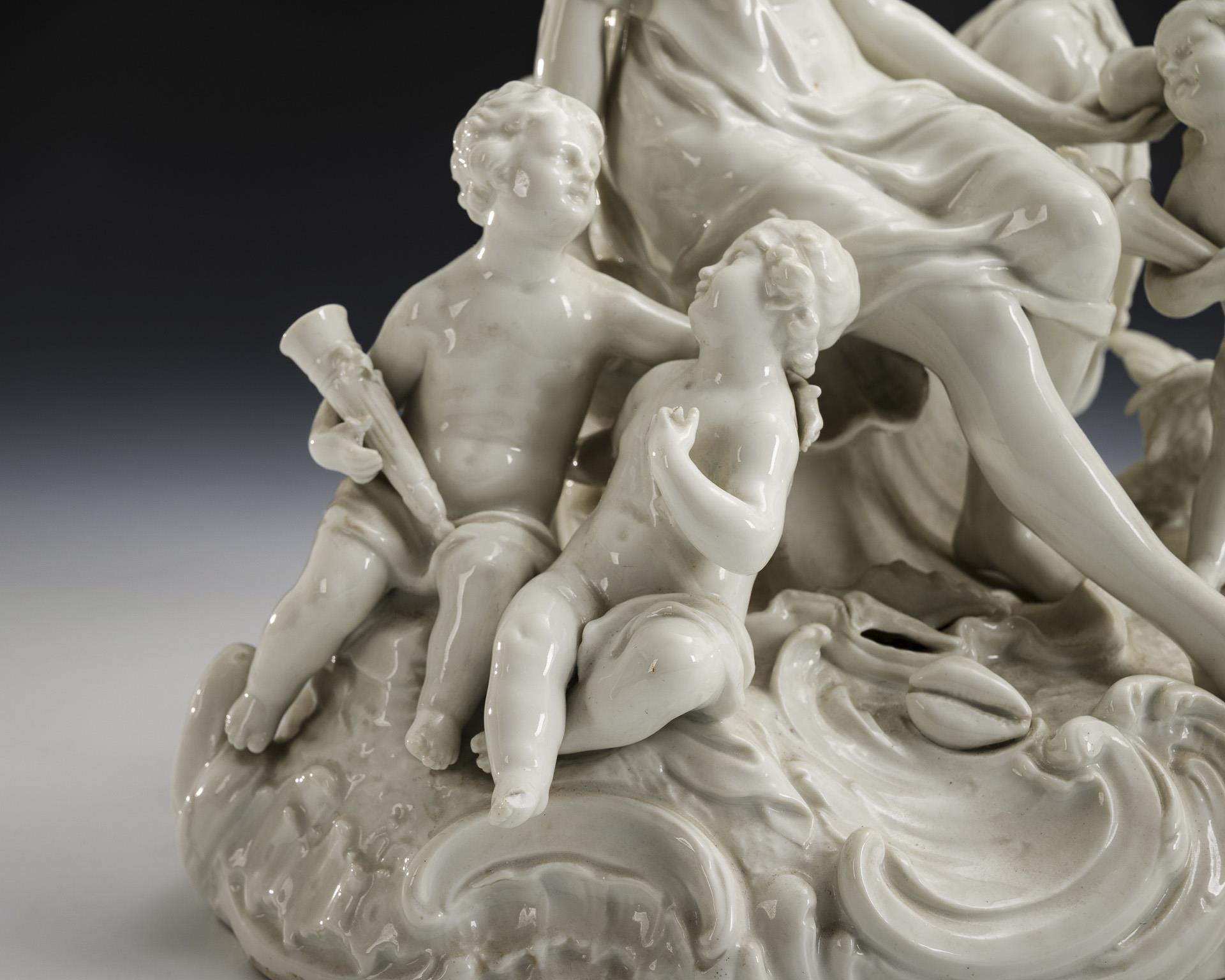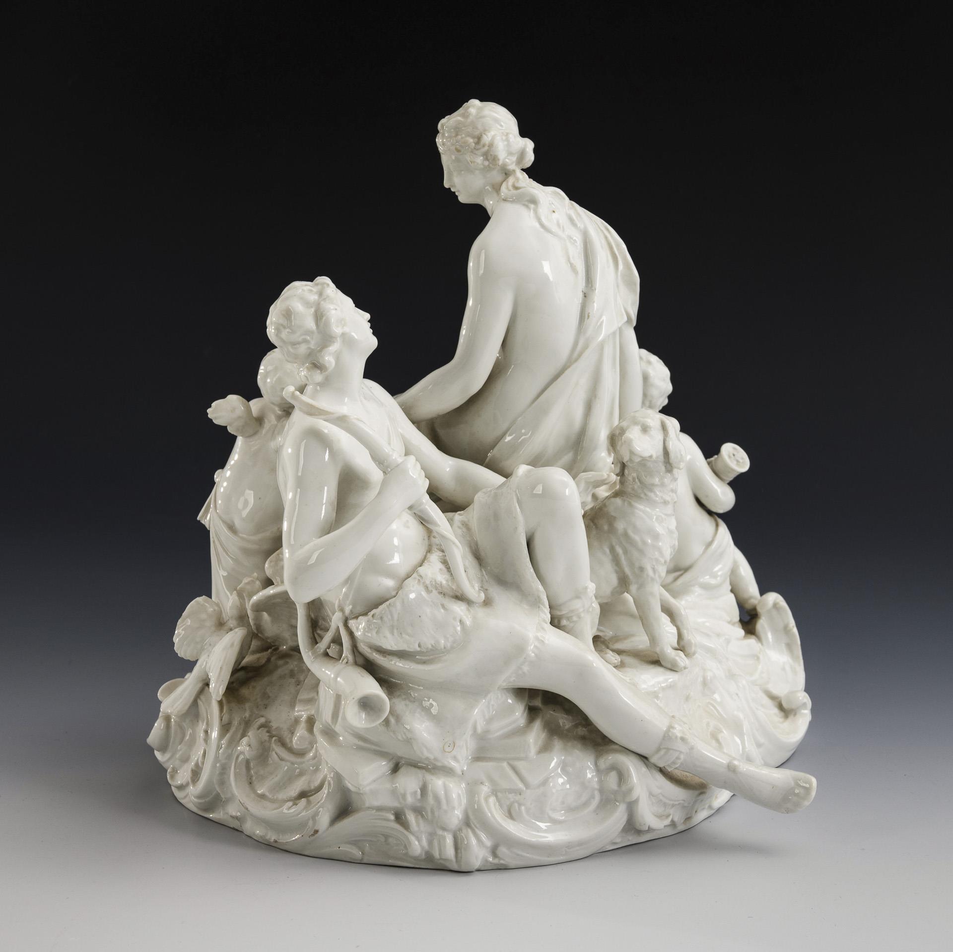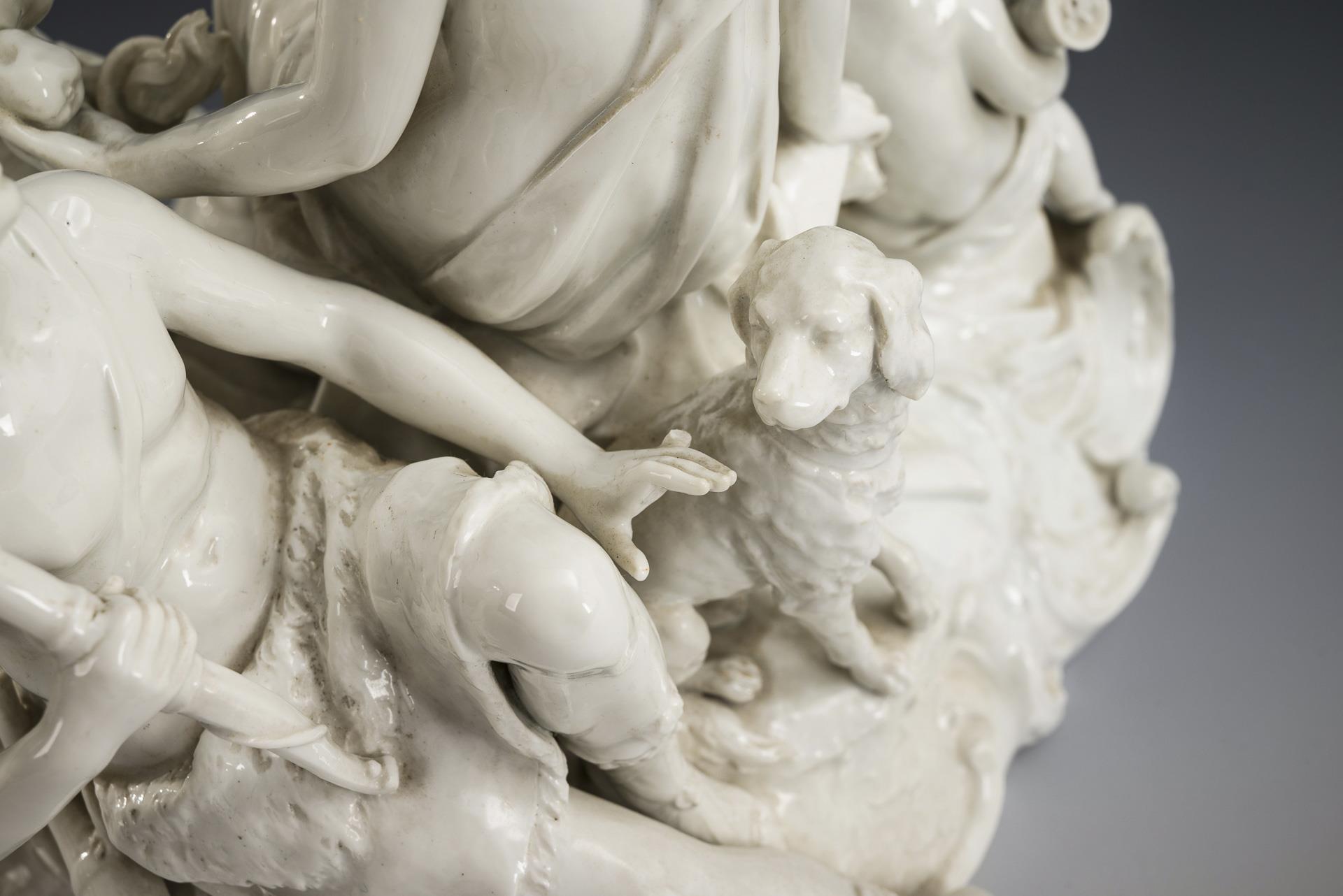 Auf einer Muschel sitzende, von Putten umgebene Diana sowie der zu ihrer linken sitzende, von einem Hund begleitete Actaeon. 1 Finger, 1 Tuchzipfel, 1 Puttenfuß, Band am Köcher und 1 Taubenflügel bestoßen.