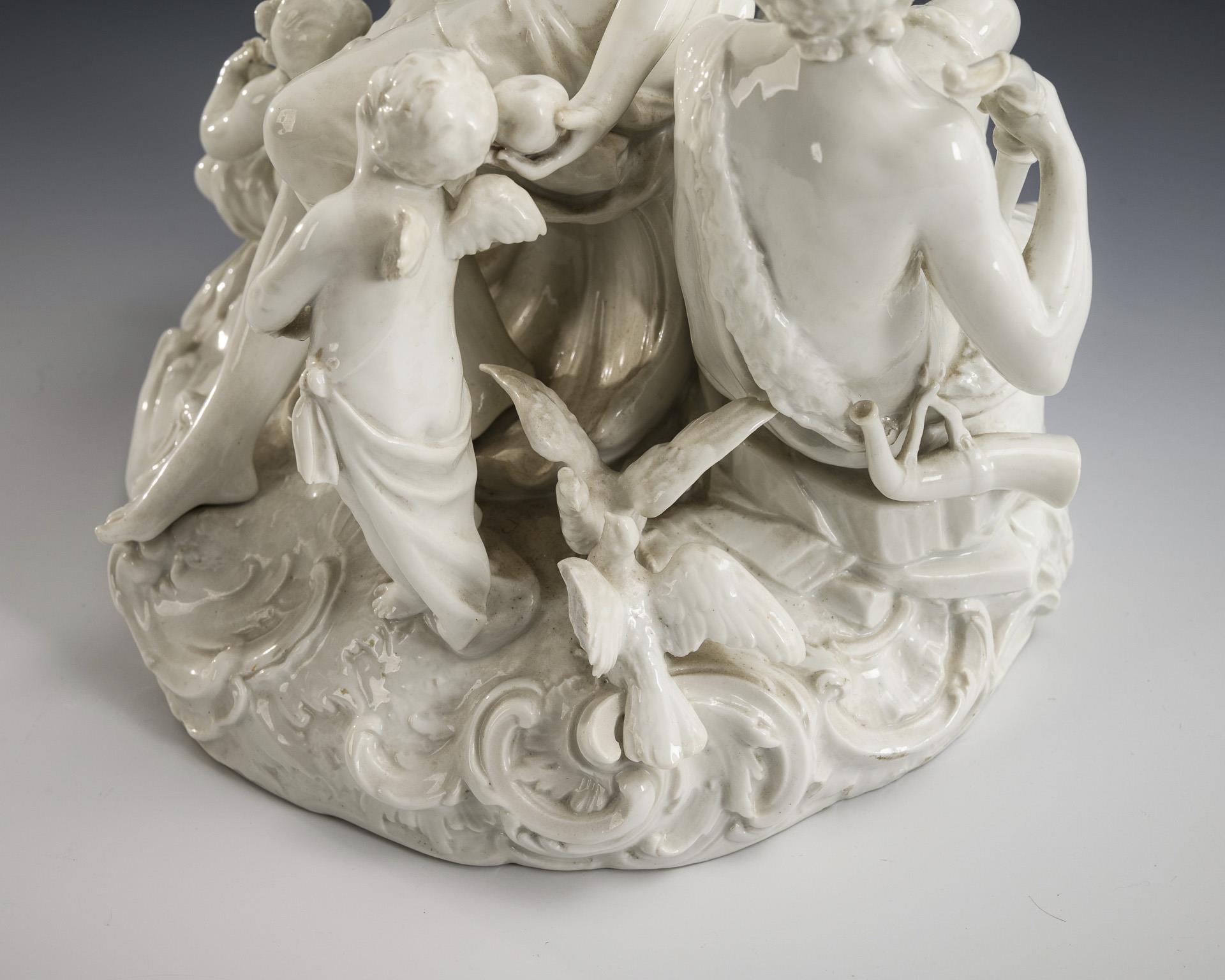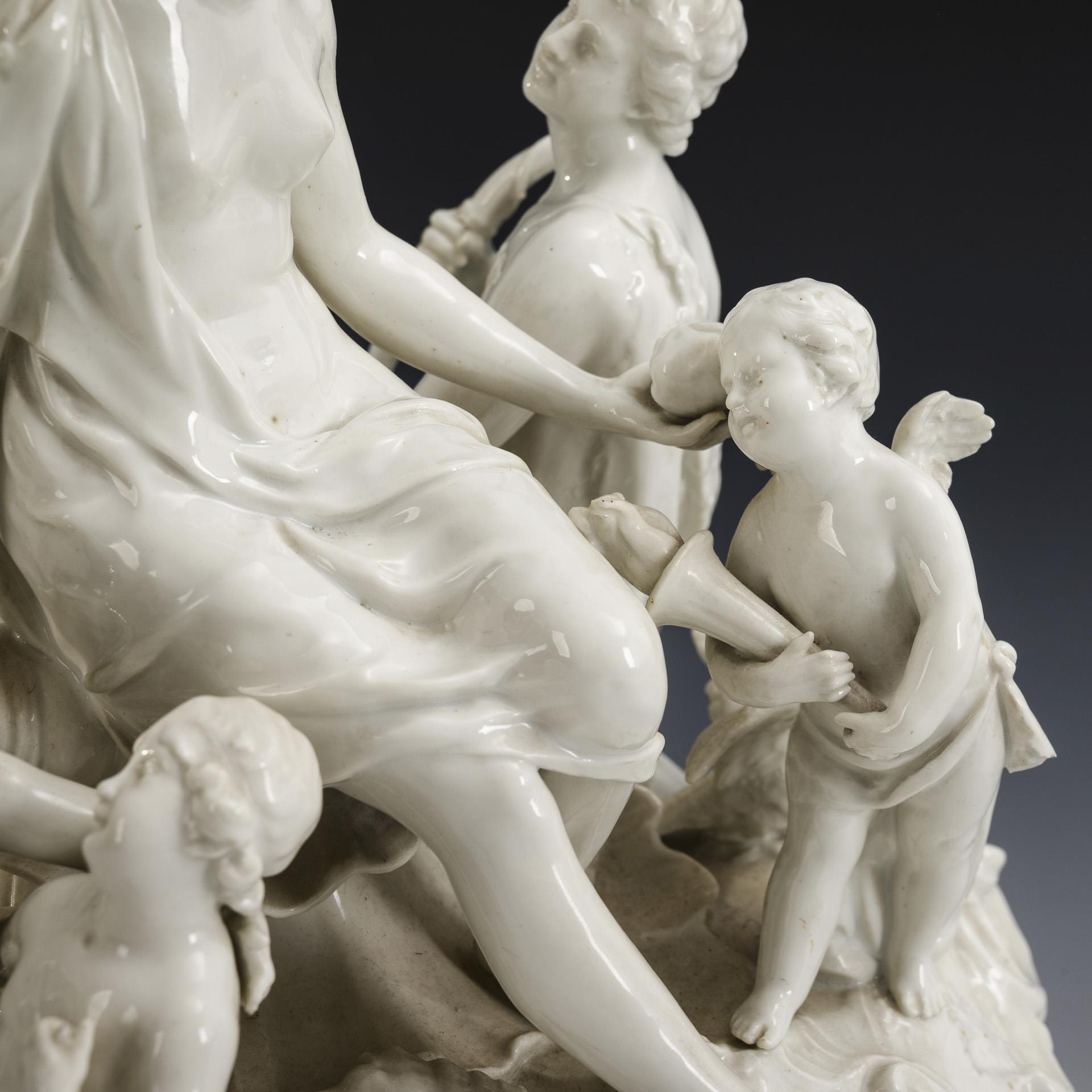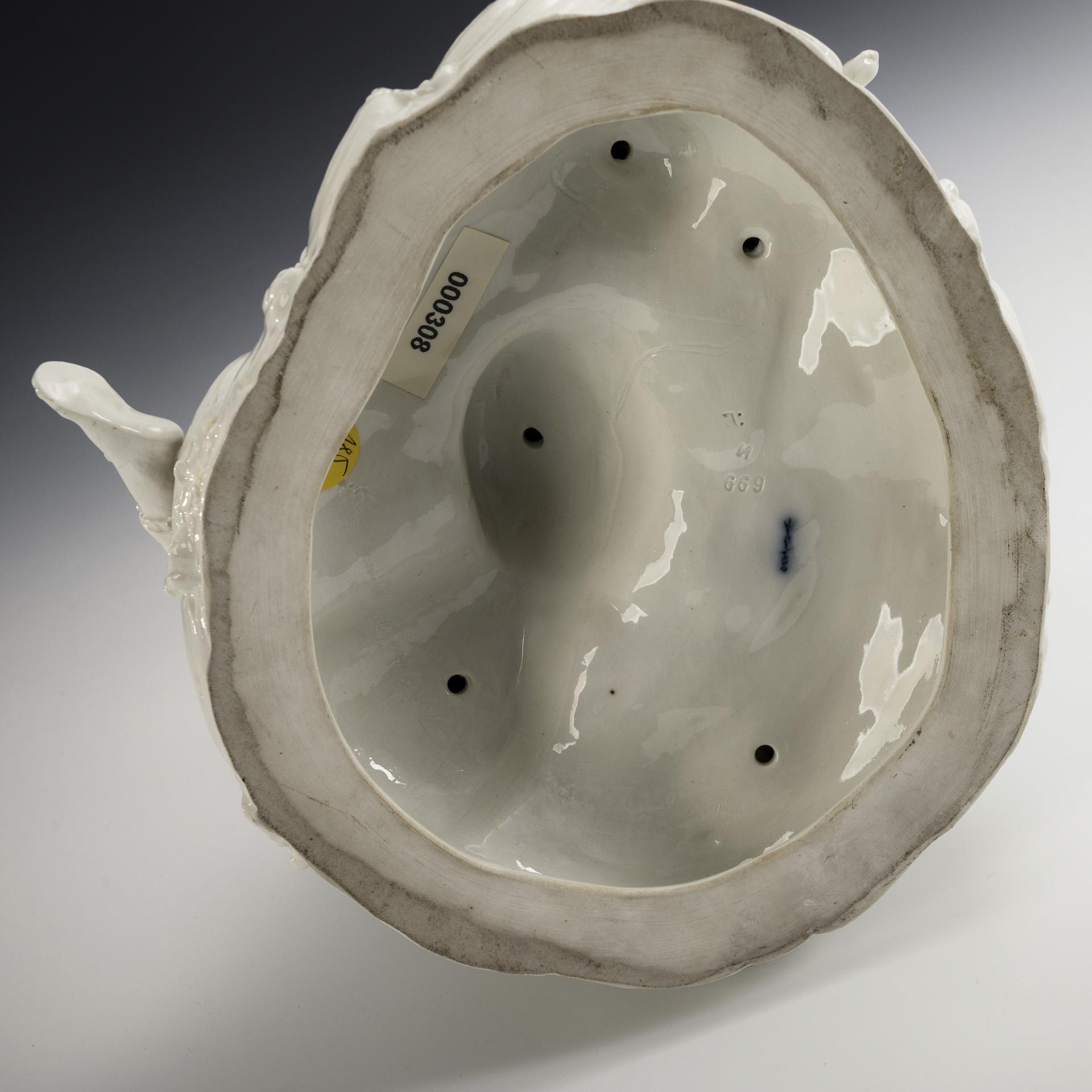 Auf einer Muschel sitzende, von Putten umgebene Diana sowie der zu ihrer linken sitzende, von einem Hund begleitete Actaeon. 1 Finger, 1 Tuchzipfel, 1 Puttenfuß, Band am Köcher und 1 Taubenflügel bestoßen.