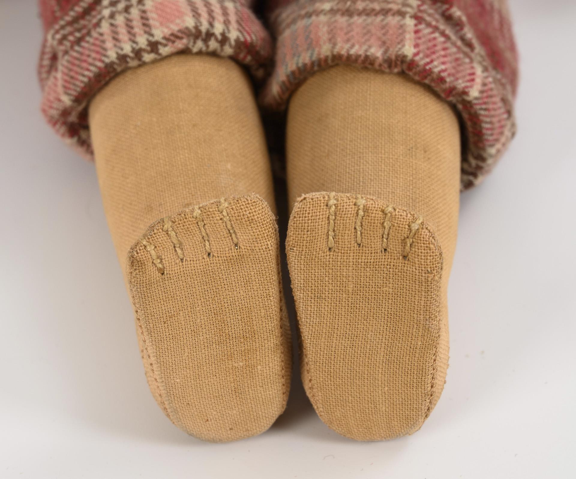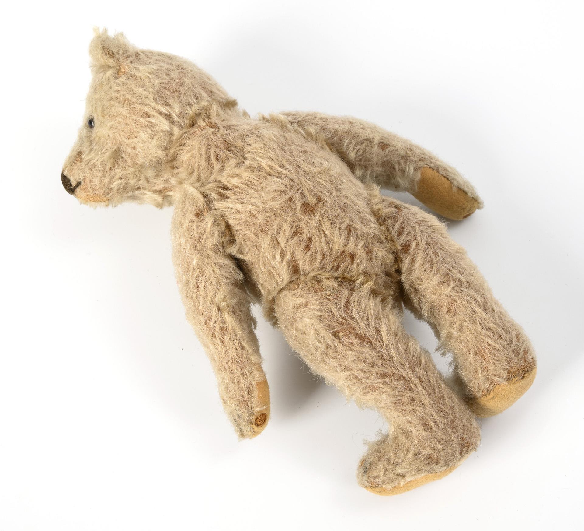 Kurbelkopf aus Kunststoff, gemalte braune Augen, blonde Echthaarperücke. Stoffkörper mit Schlenkerarmen, Beine mit Scheibengelenken. Karierte, kurze Hose, passende Kappe. Leicht verschmutzt (L 37 cm). / Blonder Mohairteddy. Kleiner Defekt an der rechten Pfote (L 24 cm). Leichte Altersspuren.